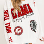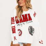 This is Bama spirit turned all the way up! This white crewneck packs a punch with bold red “BAMA” across the chest, shimmering “University of Alabama” cursive underneath, and sleeves that feature “Roll Tide” down one arm and “Rammer Jammer” down the other. Scattered all over are sparkling icons — from elephants and the Alabama emblem to “Tide” and the classic “A” logo. The ultimate game day layer for showing your pride in standout style!