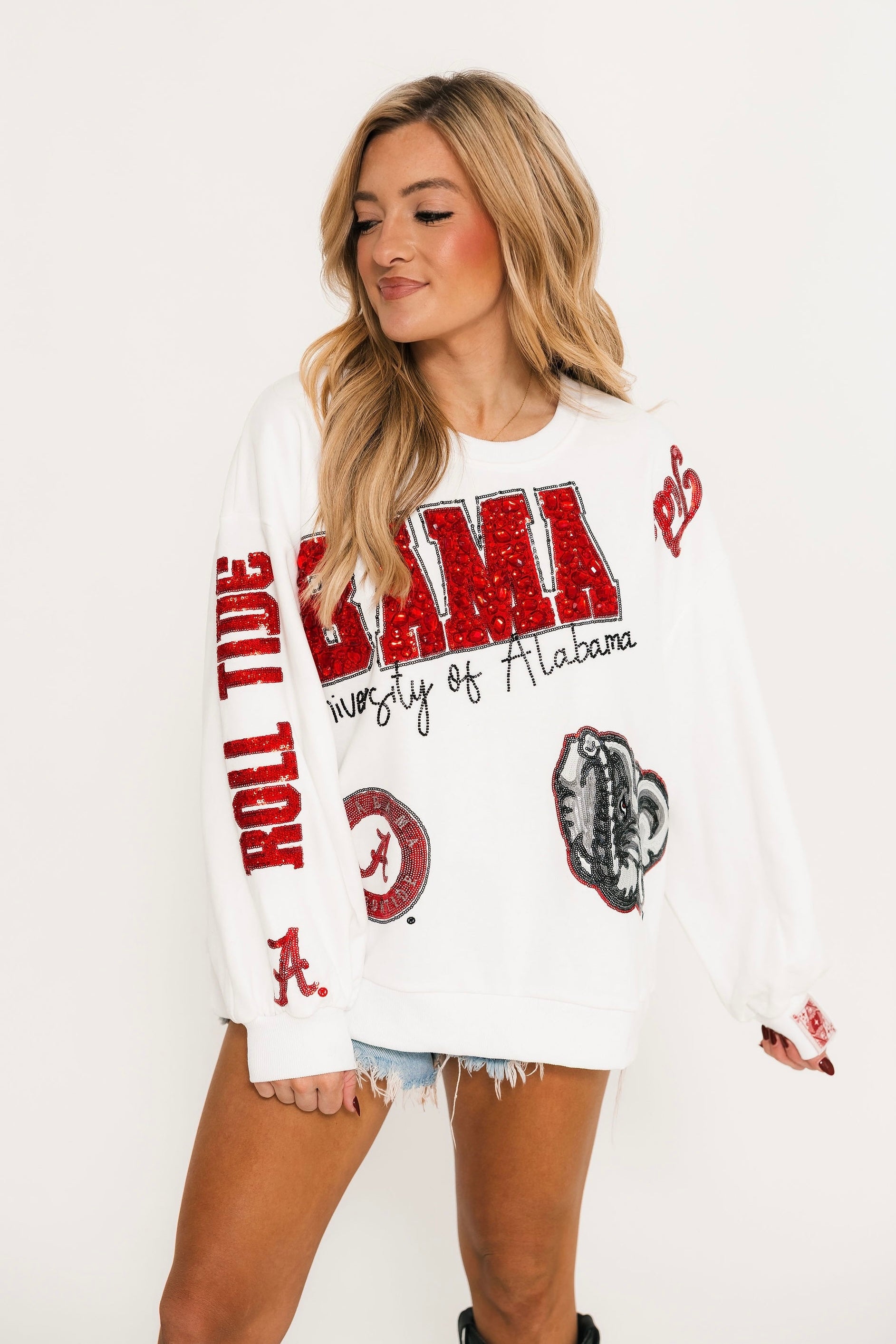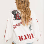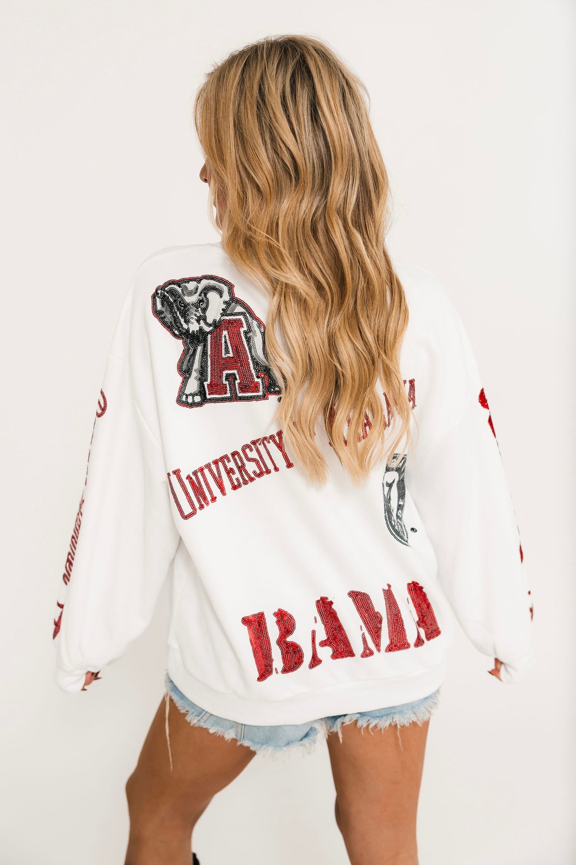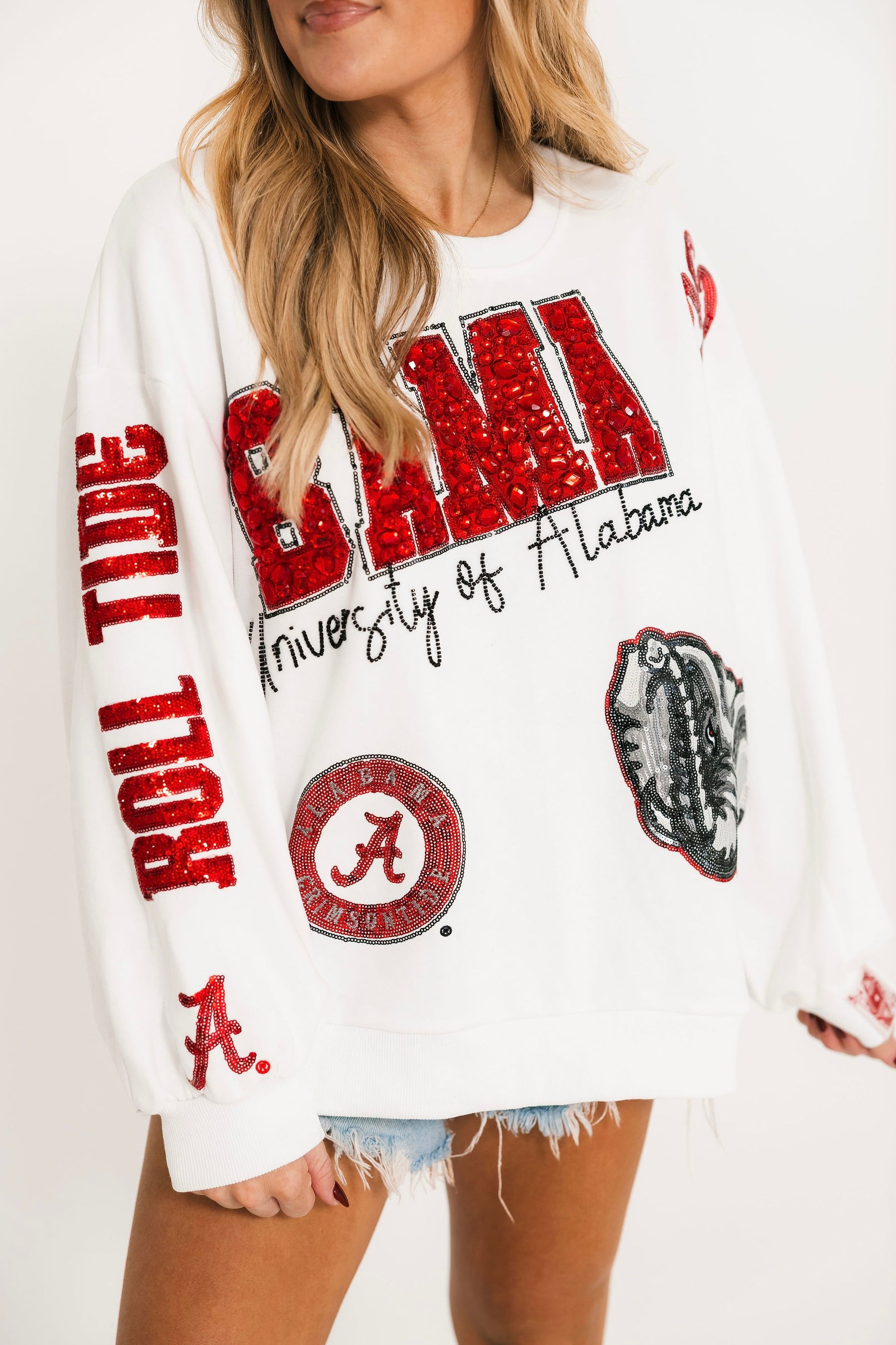 - White crewneck with bold red “BAMA” across the chest and sparkly cursive “University of Alabama” underneath