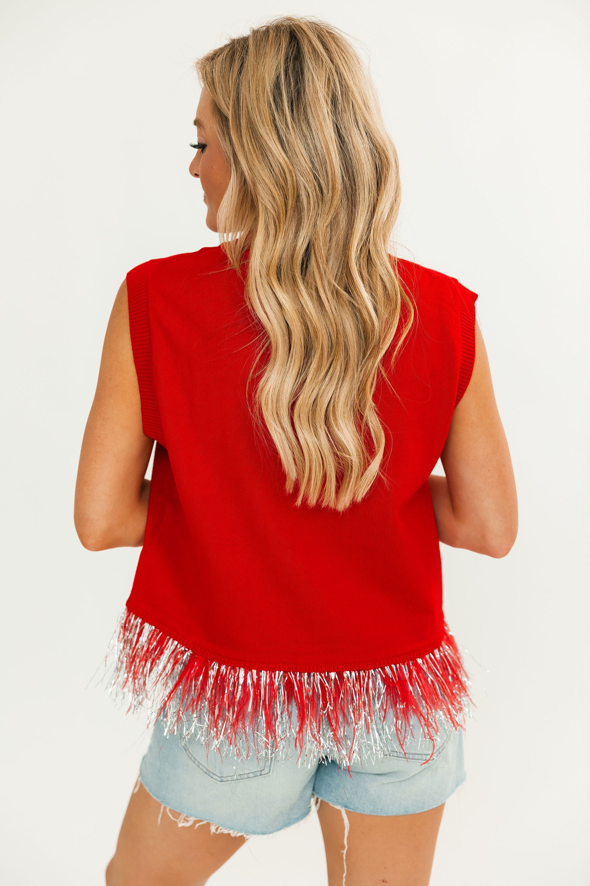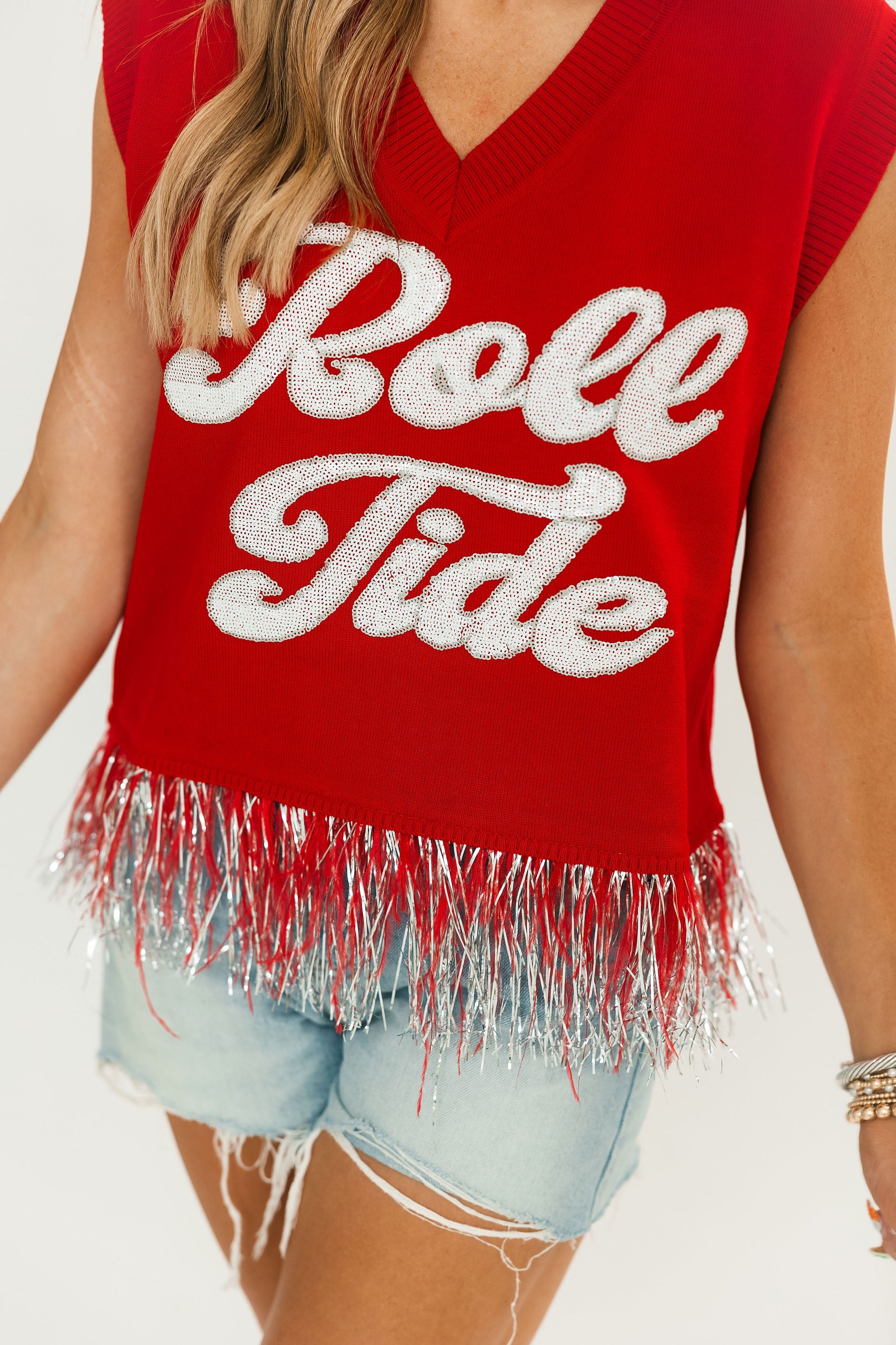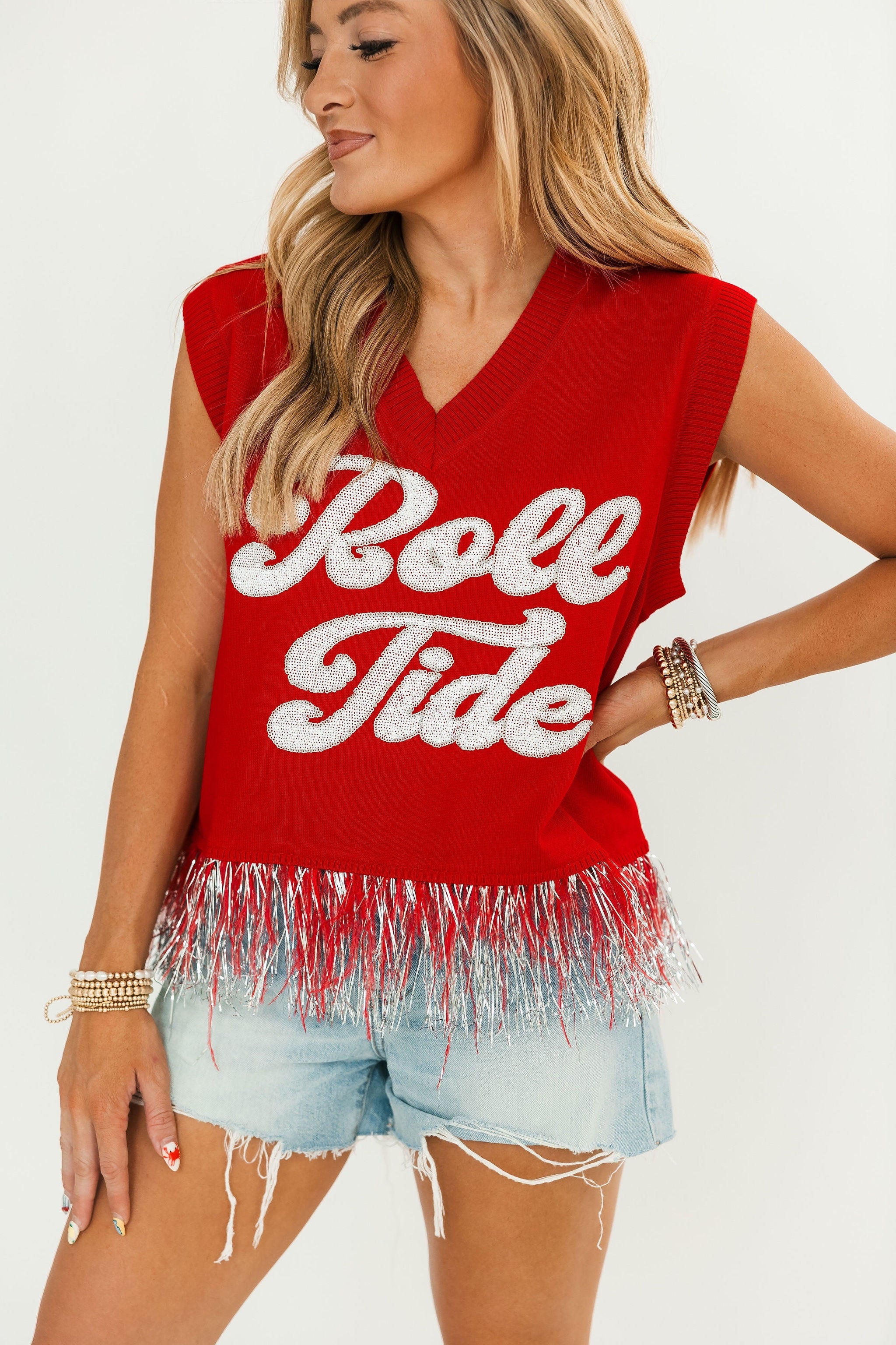 Game day just got glam! This Alabama V-neck tank sweater features eye-catching feather and tinsel trim at the hem, adding sparkle and flair to your Crimson Tide look. Lightweight, stylish, and perfect for cheering on the Tide in comfort and style. Roll Tide! ❤️🤍✨ Lexi is wearing an XS.