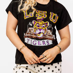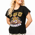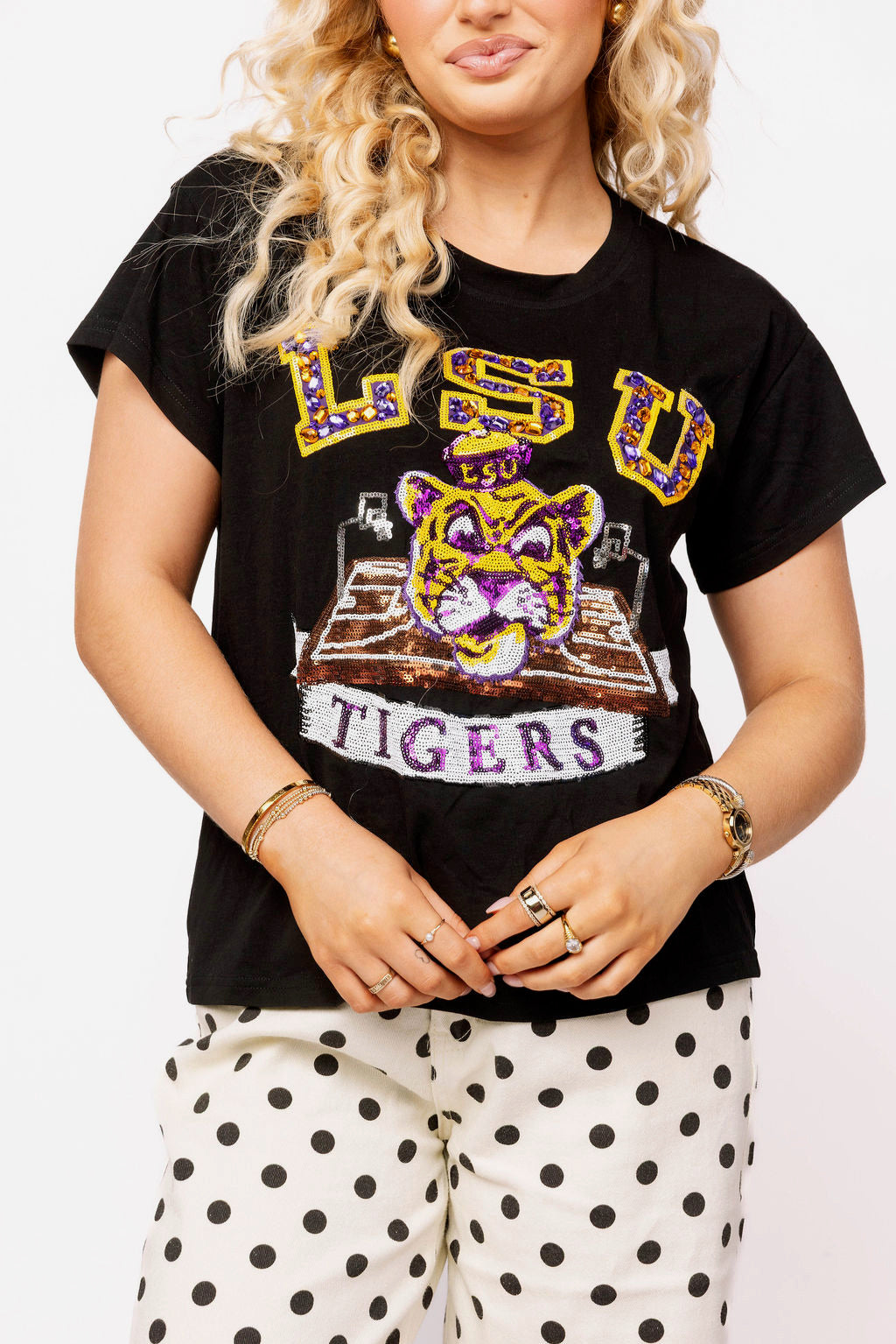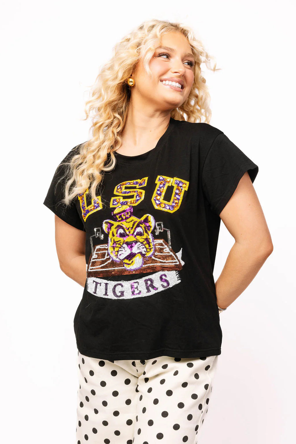 Show your Tiger pride with this Queen of Sparkles tee, featuring a bold LSU basketball court graphic in signature sequin sparkle. Designed with a relaxed fit, short sleeves, and a classic crew neckline, it’s the perfect mix of sporty and spirited.
