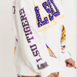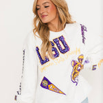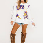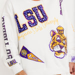 Show your LSU spirit loud and proud! This standout white crewneck features bold purple “LSU” outlined in gold with shimmering “University of Louisiana” cursive underneath. With “TIGERS” down one sleeve and “Death Valley” down the other, plus scattered sparkling graphics like tigers, “Tiger Bait,” LSU banners, and extra LSU icons, this is the ultimate sweatshirt for making a statement at the game, at the tailgate, or anywhere you Geaux!