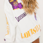 - White crewneck with bold purple “LSU” lettering outlined in gold across the chest, with shimmering gold cursive “University of Louisiana” underneath