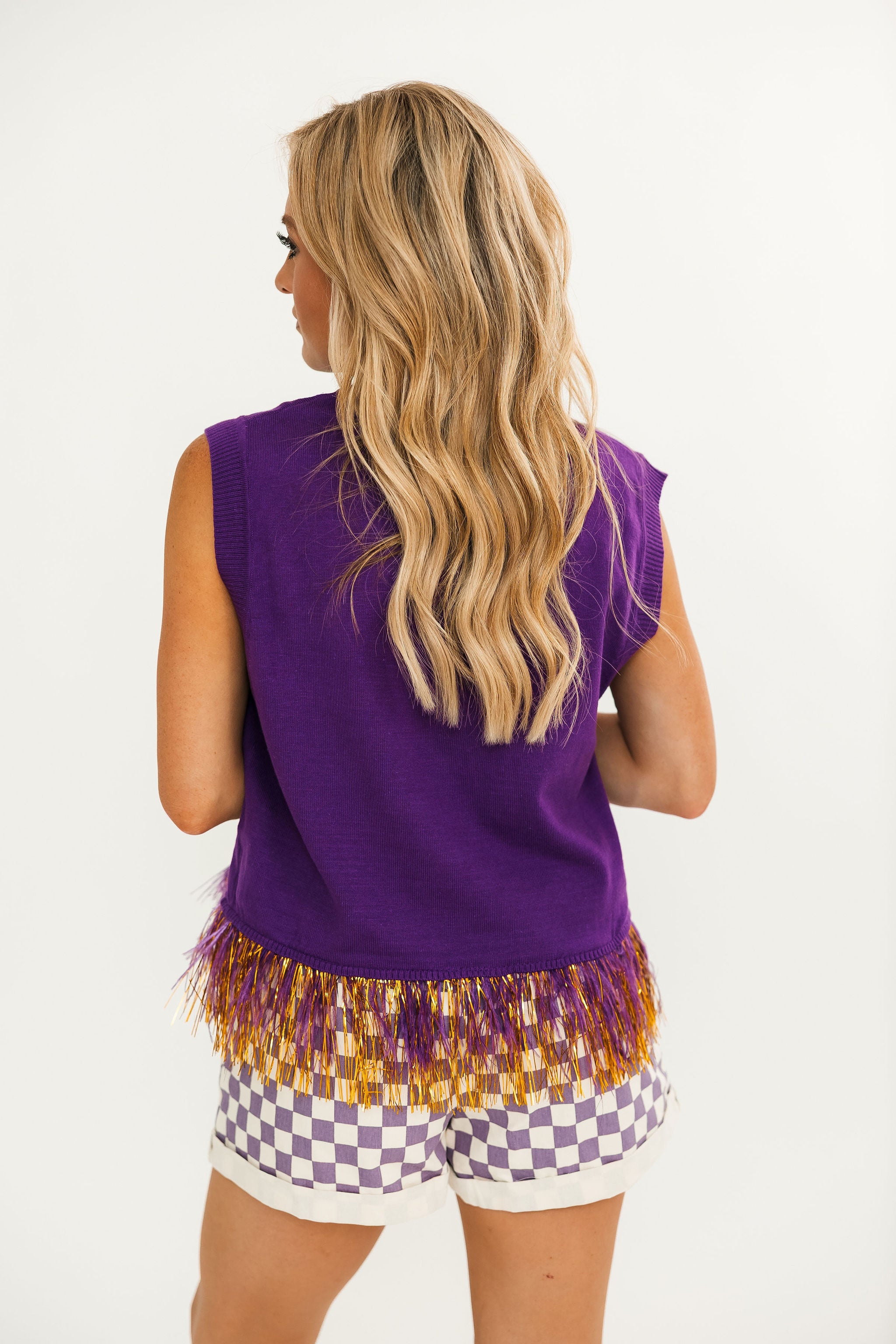 Bring sparkle to game day with this LSU V-neck tank sweater, featuring glamorous feather and tinsel trim at the hem. Lightweight and stylish, it’s perfect for showing off your Tiger pride with a touch of glam. Geaux Tigers! 💜💛✨ Lexi is wearing an XS.