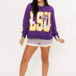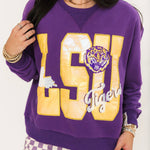 - Purple crewneck with oversized metallic gold “LSU” across the entire front