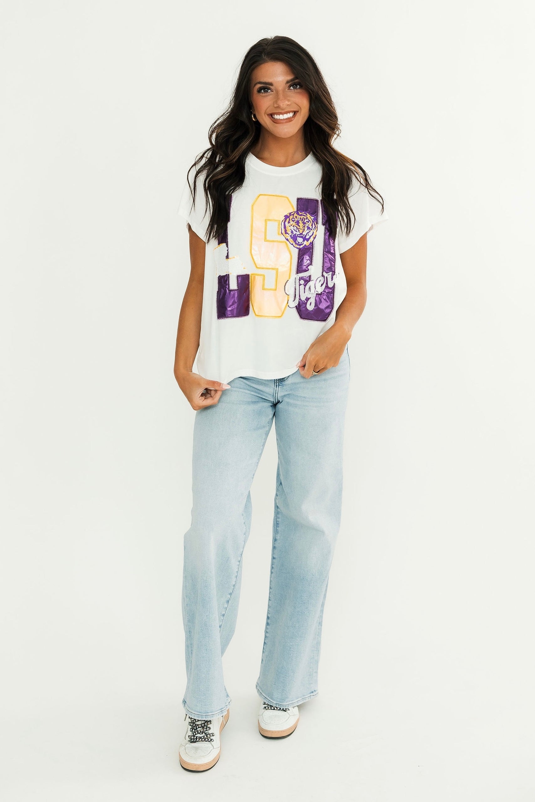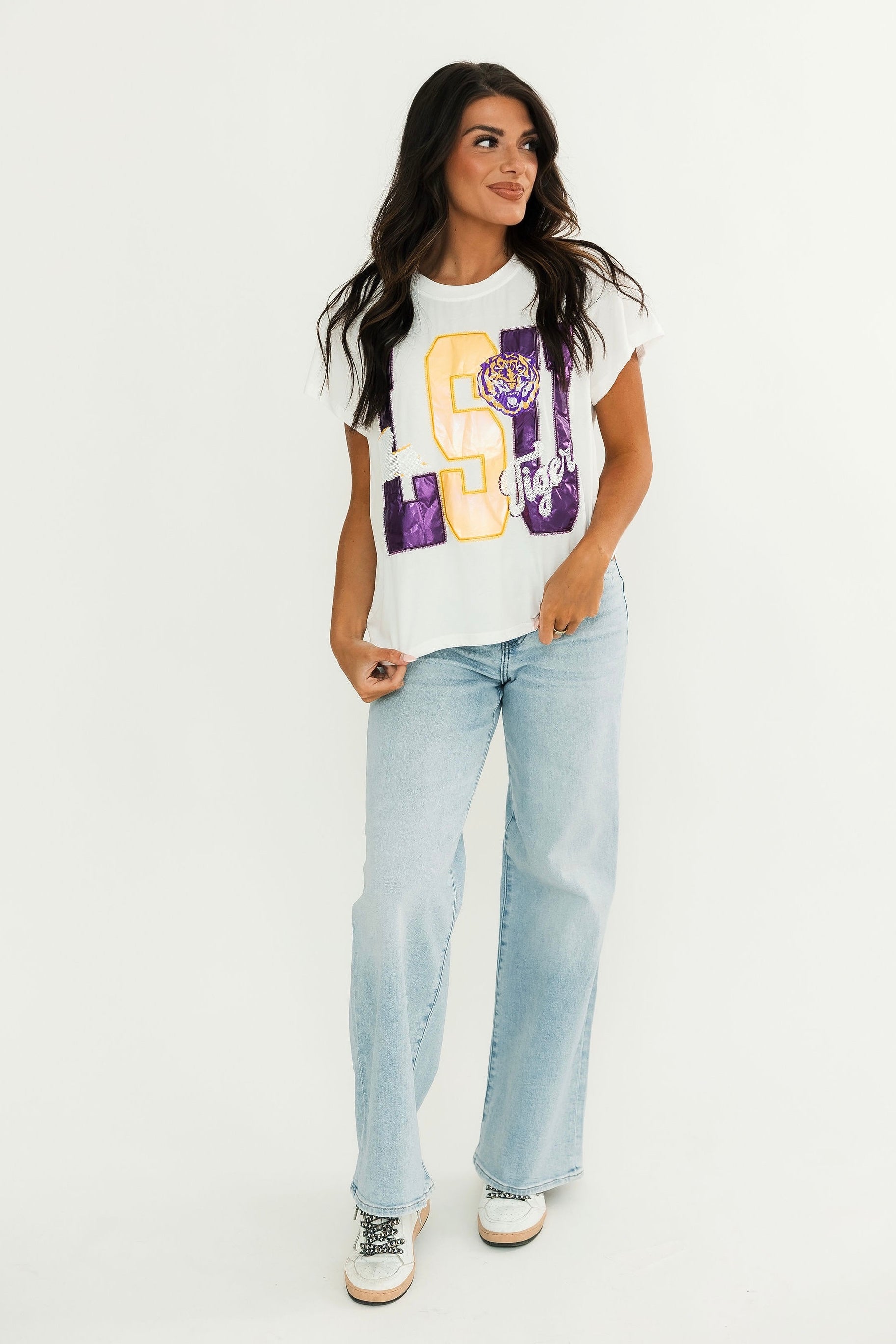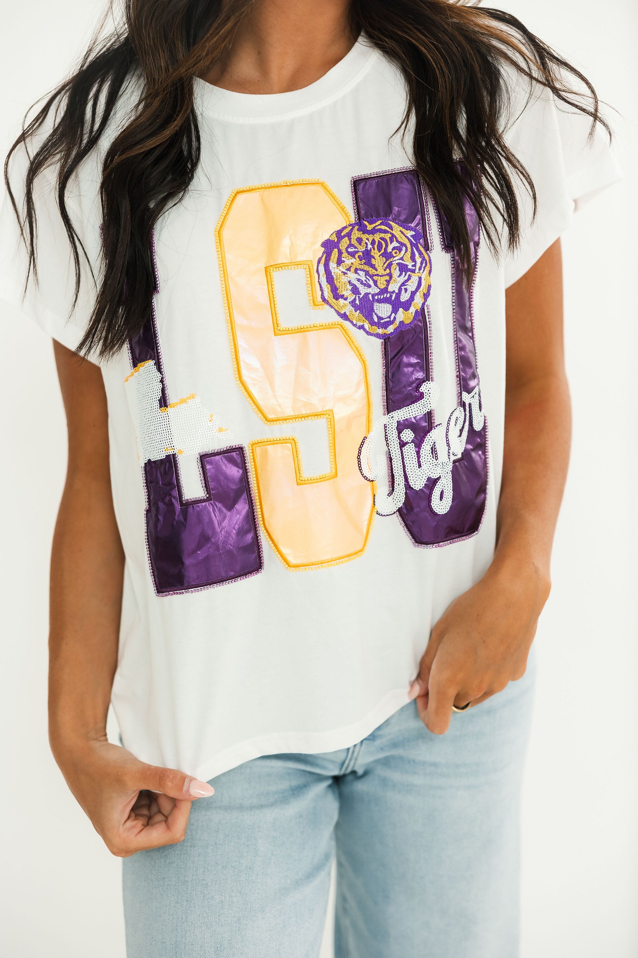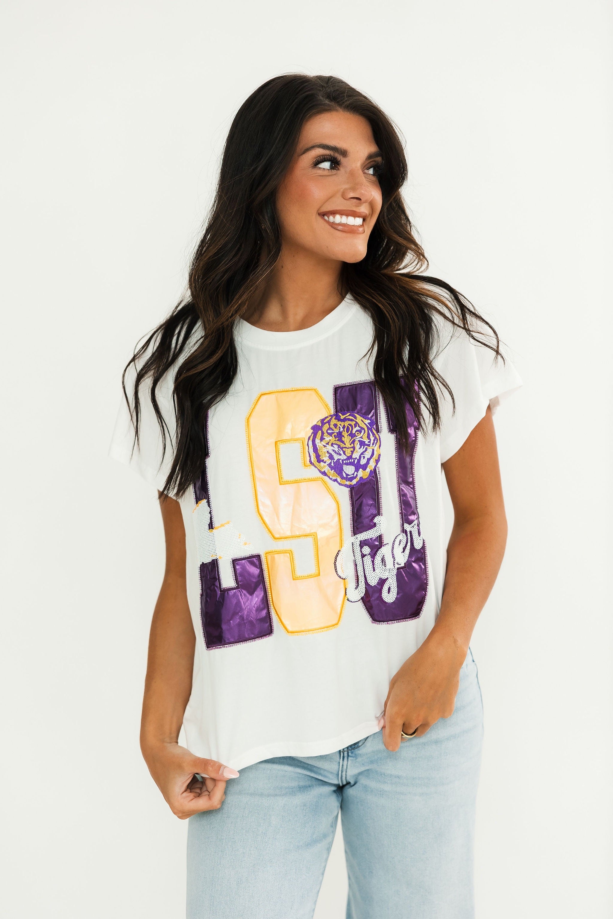 Light up game day with this dazzling Queen of Sparkles tee, packed with purple and gold sequins and fierce Tiger pride. Perfect for tailgates, kickoff, and roaring for LSU in standout style. 💜💛✨🐯 Harli is wearing a small.