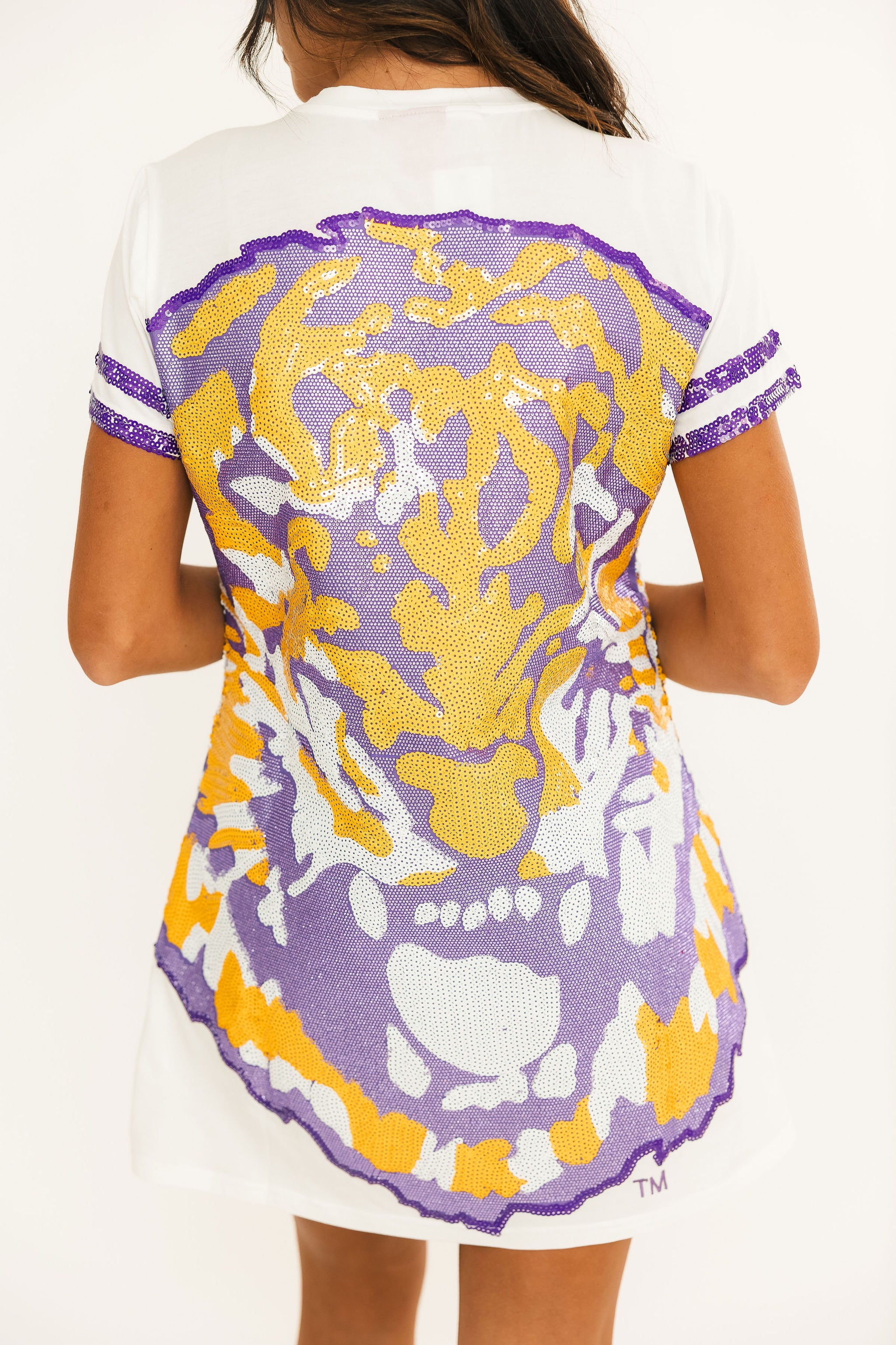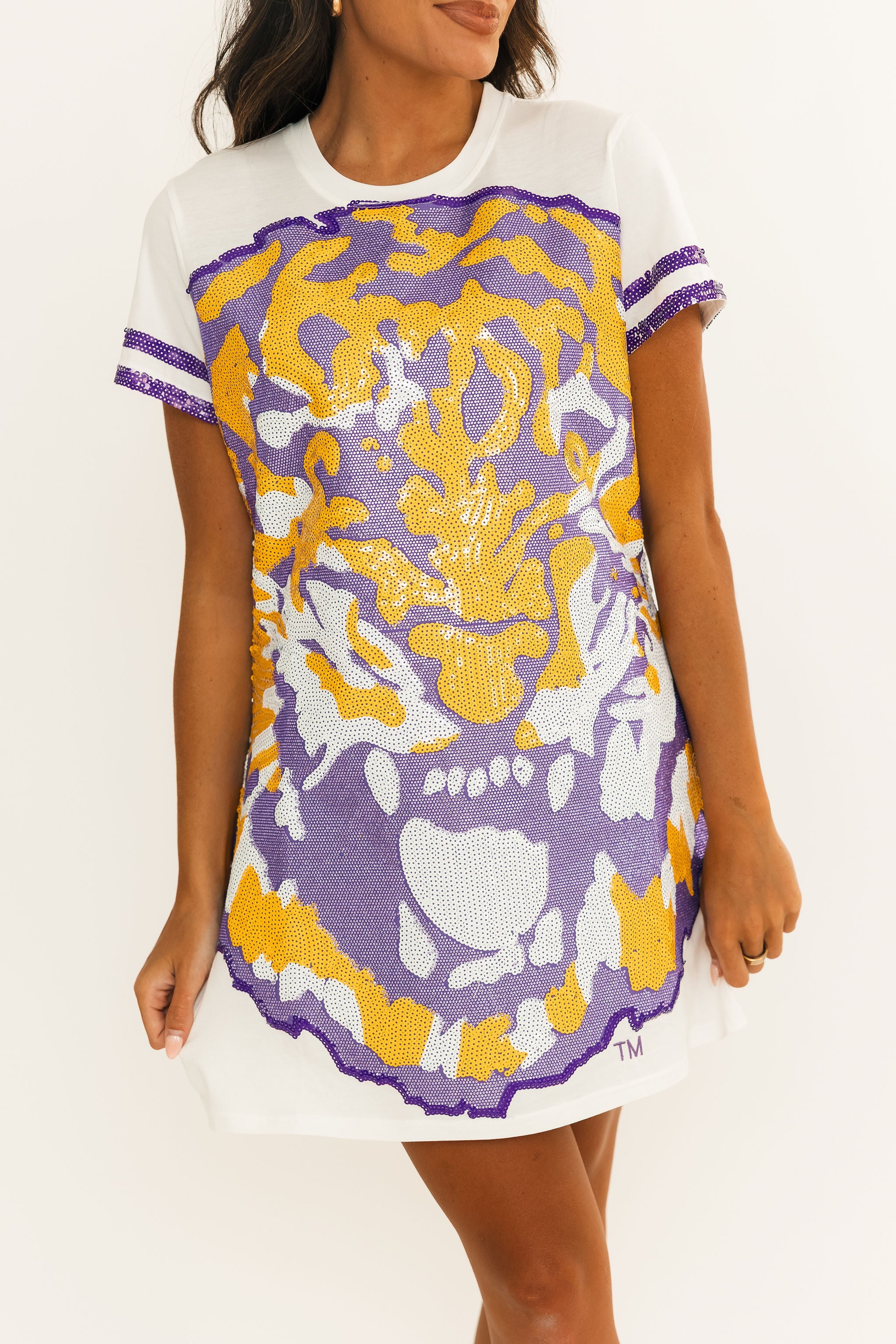 Shine bright with this sequin-loaded tee shirt dress! Featuring a bold tiger face in LSU purple & gold, plus glittery sleeve stripes, it’s perfect for tailgates, touchdowns, and Tiger nights. Comfy, fierce, and ready to yell Geaux Tigers! 🐯🏈 Harli is wearing a small.