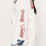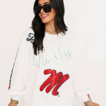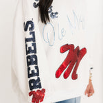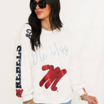 Bring on the Rebel pride with this standout game day sweatshirt! Featuring a bold black sparkly “UM” outlined in red, with shimmering red “University of Mississippi” cursive underneath, this white crewneck is made to turn heads. With “REBELS” down one sleeve and scattered icons like UM logos and sparkly red “M” graphics all over, it’s the ultimate layer for showing your Ole Miss spirit in serious style. Sage is wearing an XS.