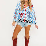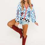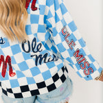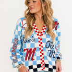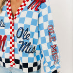 Hotty Toddy with a side of sparkle! This red and blue checkerboard cardigan brings Rebel pride to life with shimmering sequins, Ole Miss graphics, and standout varsity lettering. Whether you're strolling The Grove or cheering from the stands, this cardigan is all charm, all game day, all you. Go Rebs!