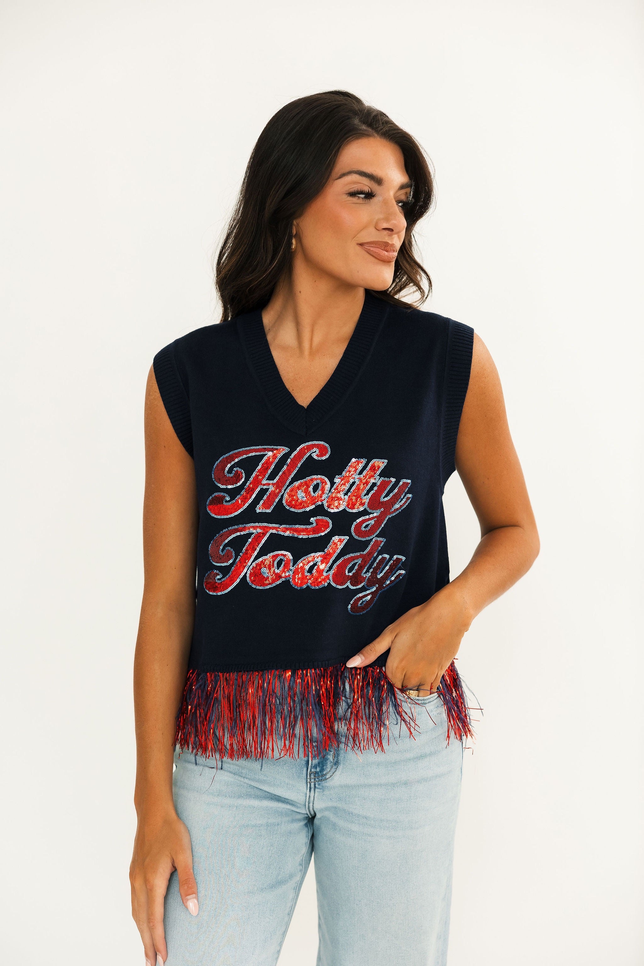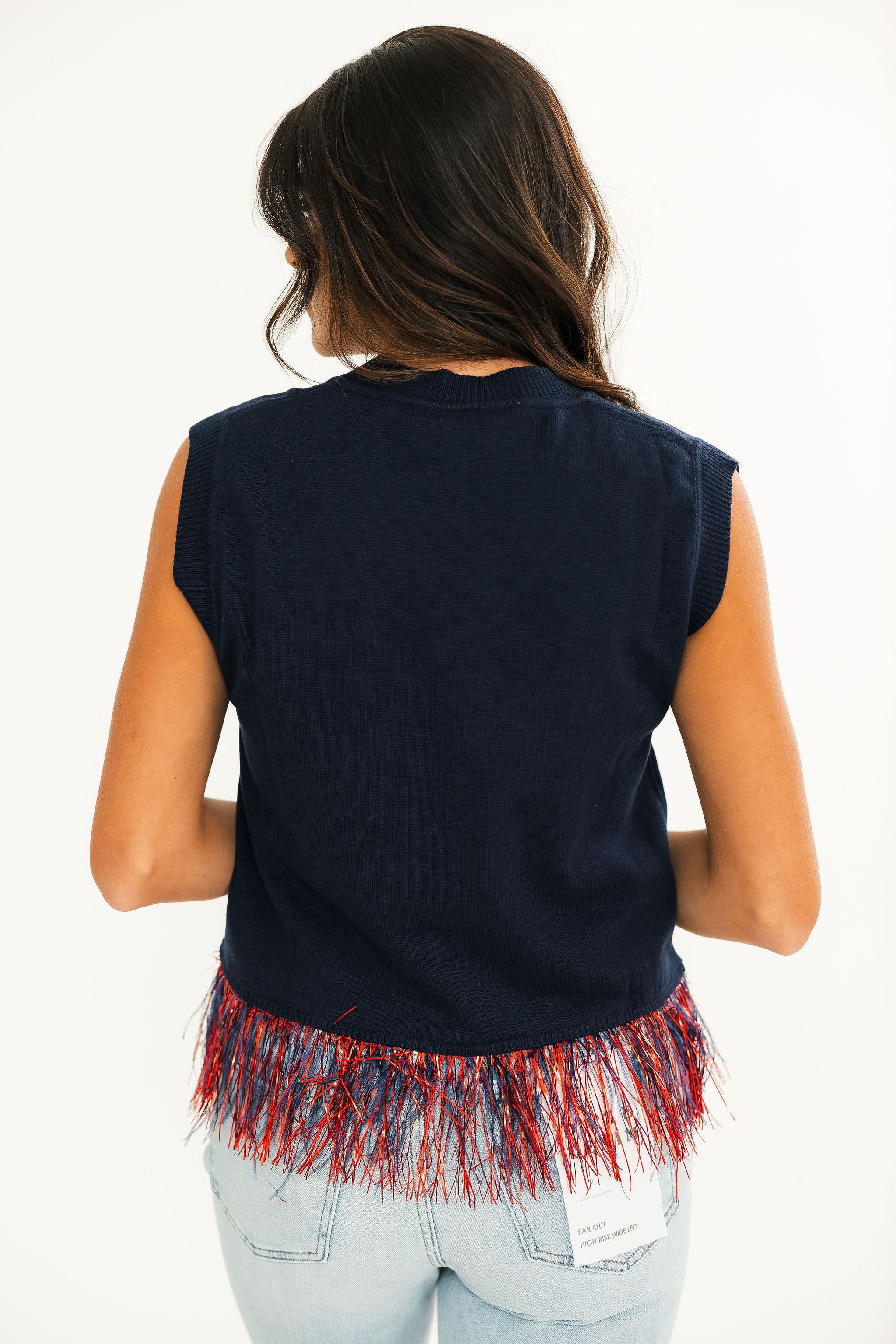 Add a touch of glam to game day with this Ole Miss V-neck tank sweater, featuring elegant feather and tinsel trim at the hem. Lightweight and chic, it’s perfect for showing Rebel pride in style and comfort. Hotty Toddy! 🔴🔵✨ Harli is wearing an XS.