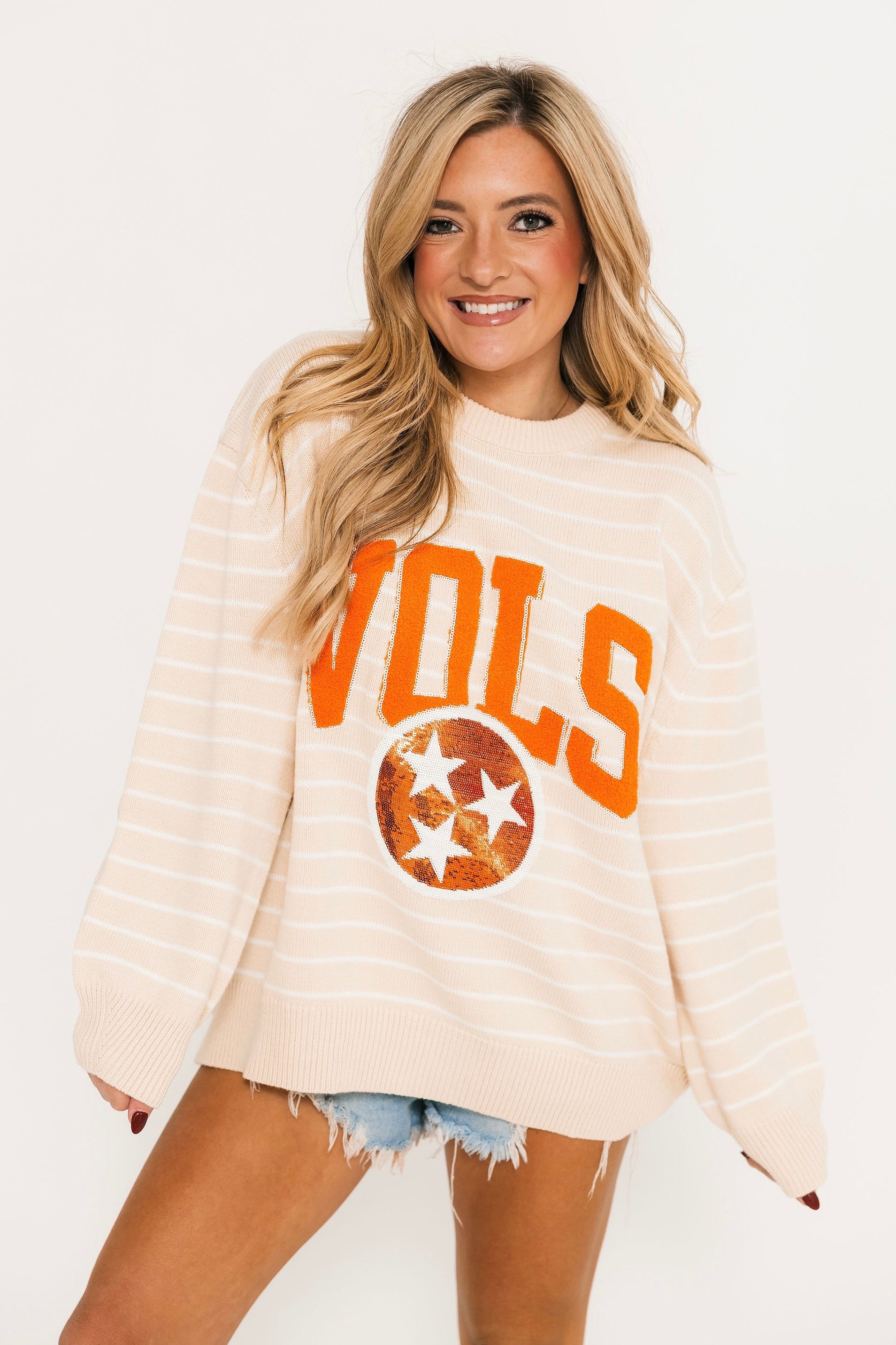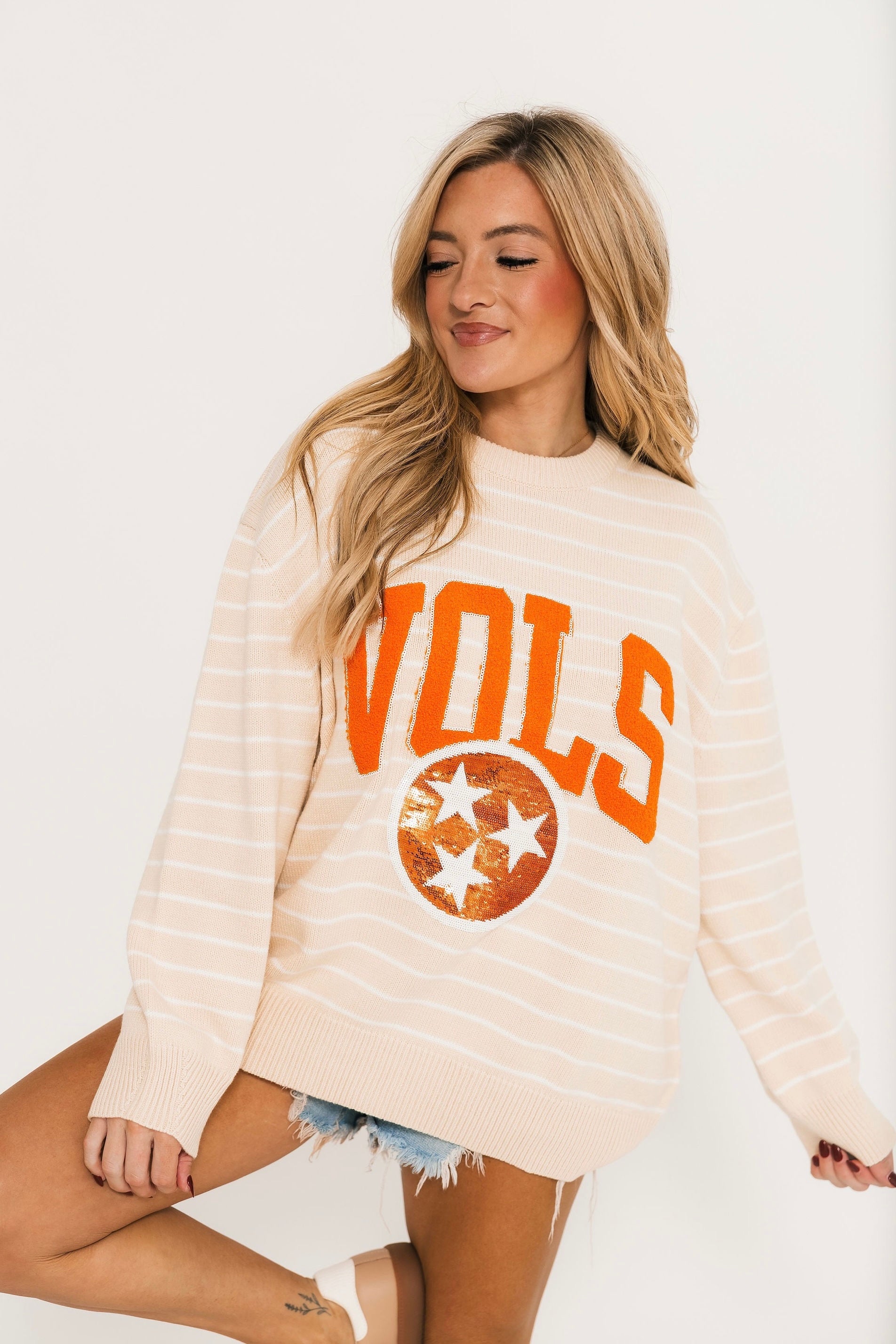 Bring on the Rocky Top spirit with this cozy vintage-inspired Tennessee sweater! Featuring soft beige and white stripes, sparkly orange “VOLS” lettering, and the classic tri-star logo across the chest, this layer blends comfort, style, and Volunteer pride. Whether you’re at Neyland Stadium or cheering from home, this sweater brings the perfect mix of vintage charm and game day sparkle! Lexi is wearing an XS.