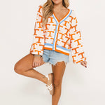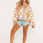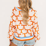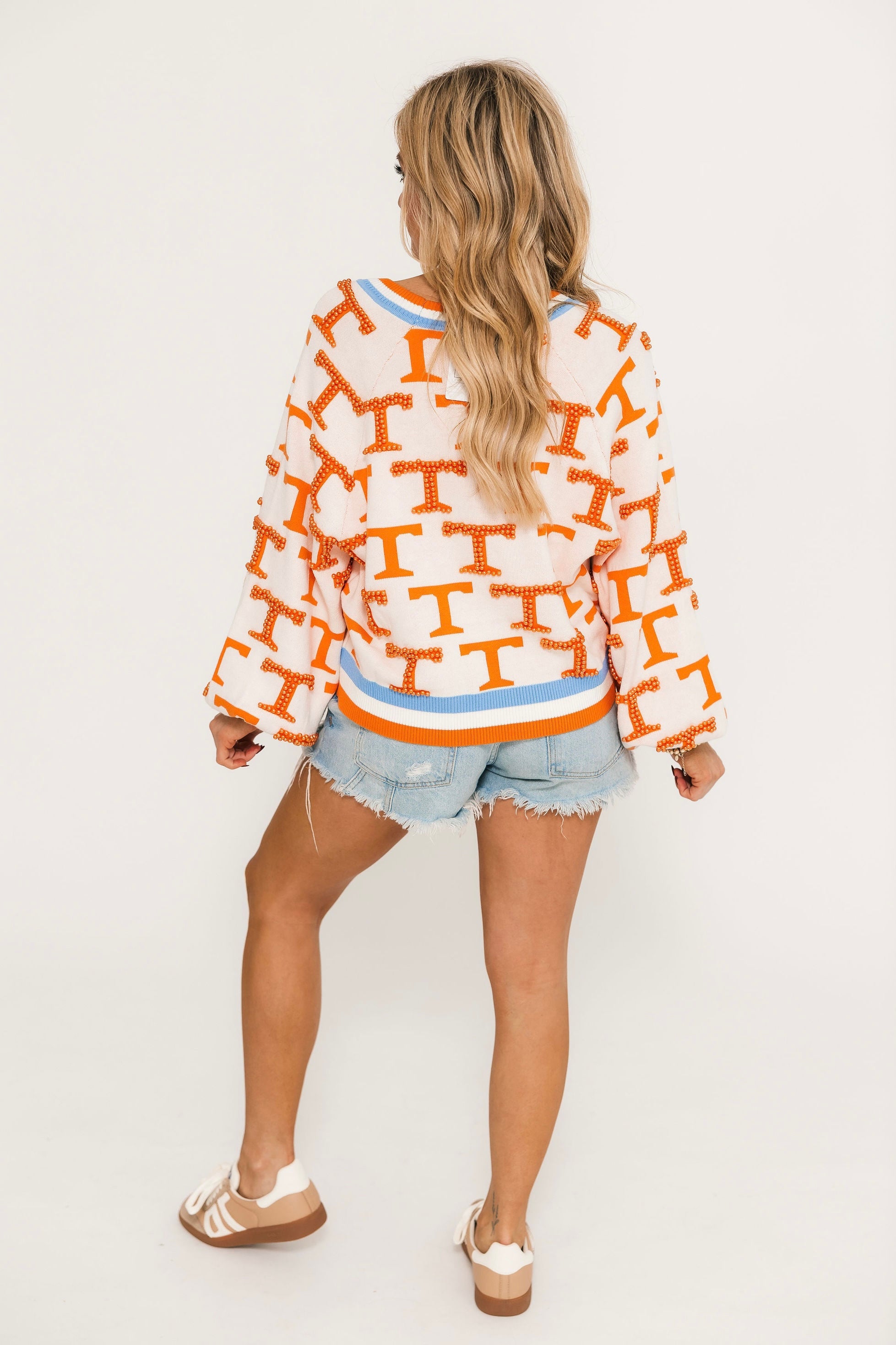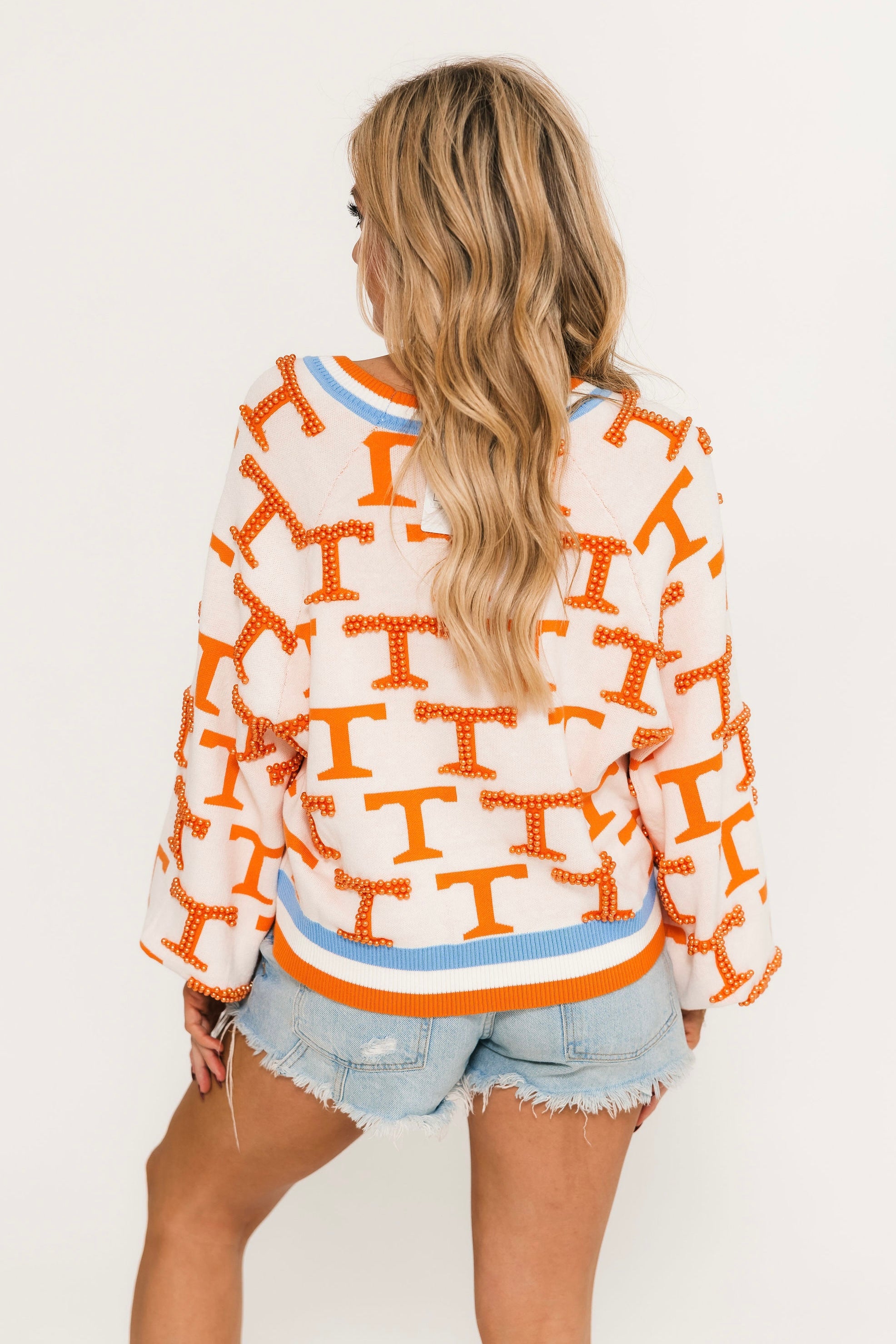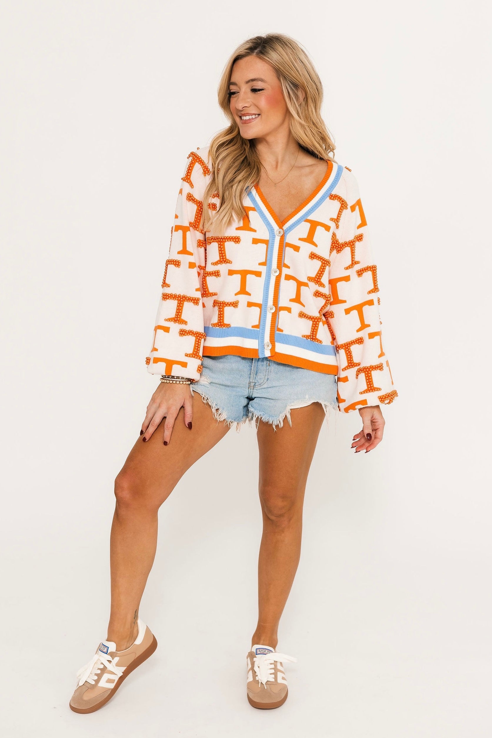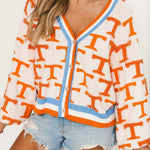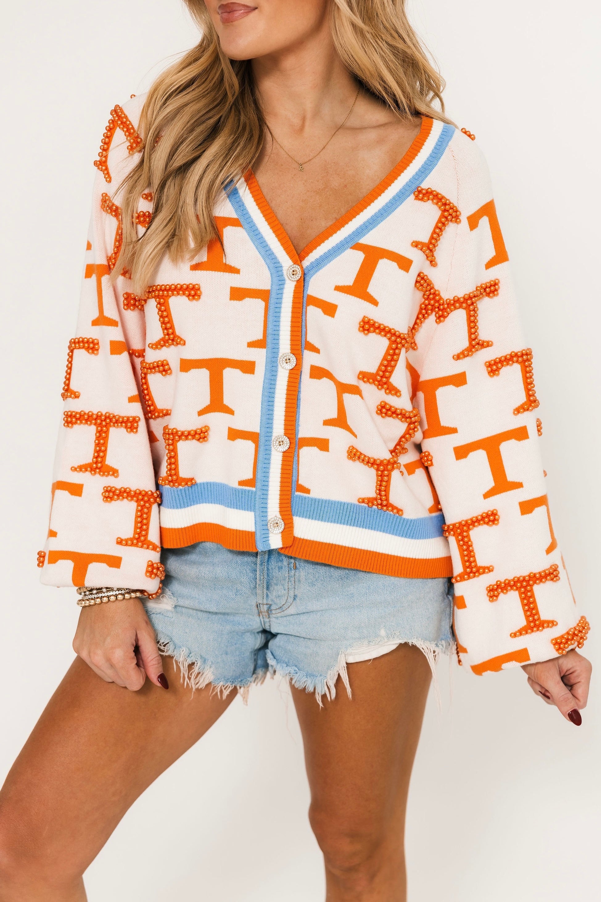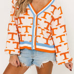 - White knit cardigan outlined in vibrant orange and blue for bold Tennessee spirit