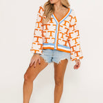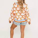 Vols spirit meets sparkle in this white knit cardigan outlined in vibrant orange and blue. Covered head-to-toe with shimmering orange rhinestone Power T's, it’s a standout layer with a flattering V-neck and button-front closure. Perfect for showing off your Tennessee pride with game day glam or anytime you want to shine bright! Lexi is wearing an XS.