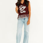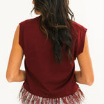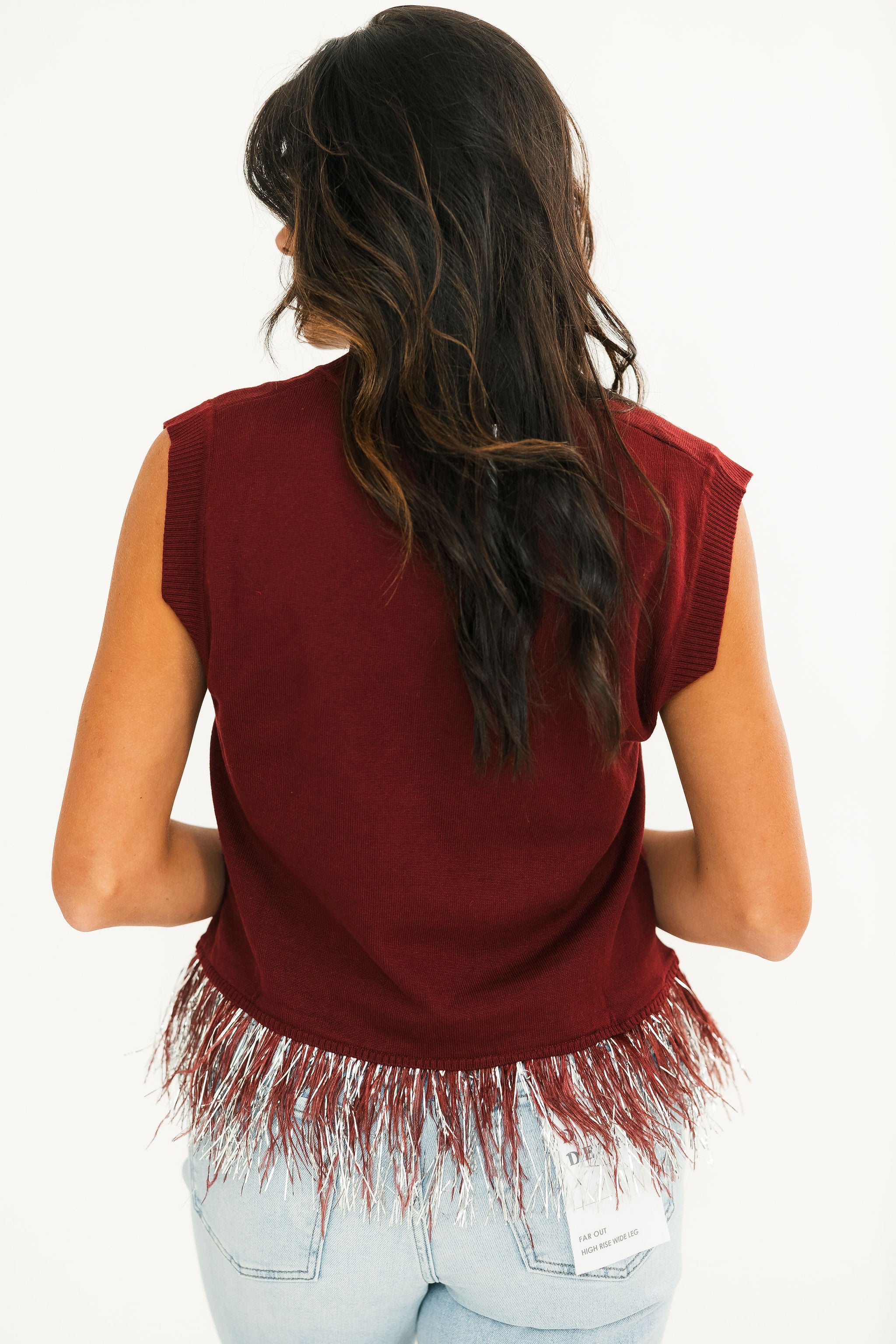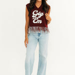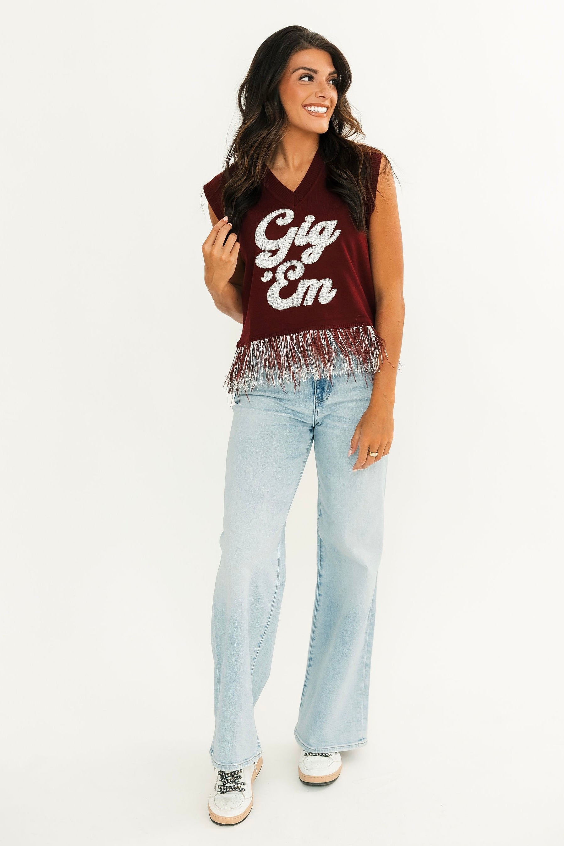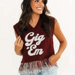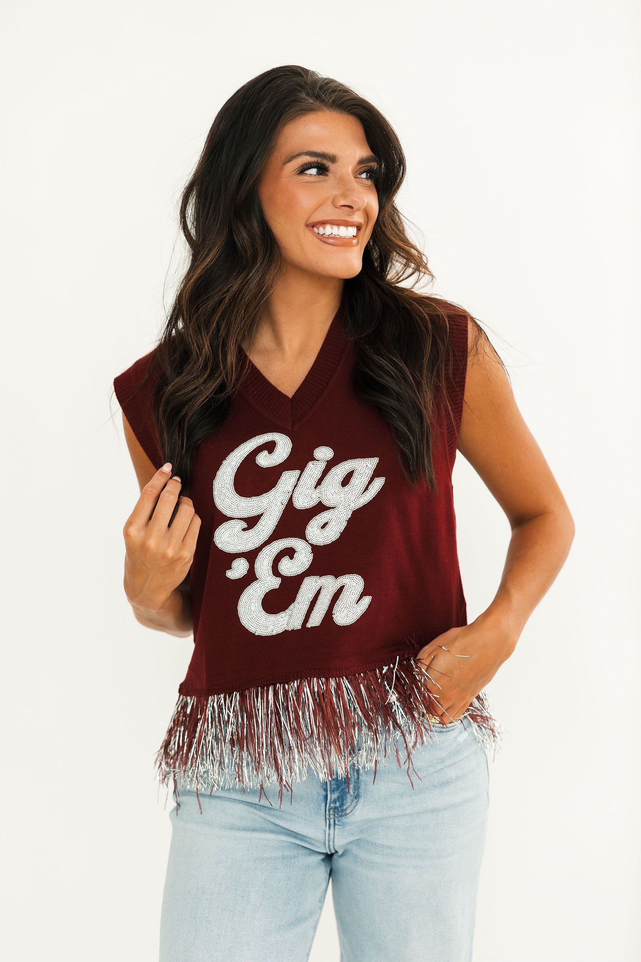 Show your Aggie spirit with a sparkling twist! This Texas A&M V-neck tank sweater features feather and tinsel trim at the hem for added glam. Lightweight and stylish, it’s perfect for game day or tailgates in true Aggie fashion. Gig ’em! 🤠✨ Harli is wearing an XS.