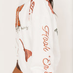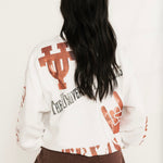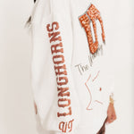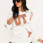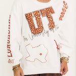 Hook ’em in standout sparkle! This white crewneck features oversized sparkly burnt orange “UT” across the front with shimmering black “University of Texas” cursive underneath. With spirit-filled wording down the sleeves and scattered icons — like a burnt orange “T” logo and a bold longhorn graphic — this sweatshirt is the perfect layer for showing off your Texas pride in game day style. Sage is wearing an XS.