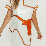 Show up in full Texas pride with this sequin-covered stunner! Featuring the iconic burnt orange Longhorn and sleeve stripes to match, this t-shirt dress is made for game day in Austin. Sparkly, comfy, and perfect for yelling Hook ’Em Horns! 🤘🏈 Lexi is wearing an XS.