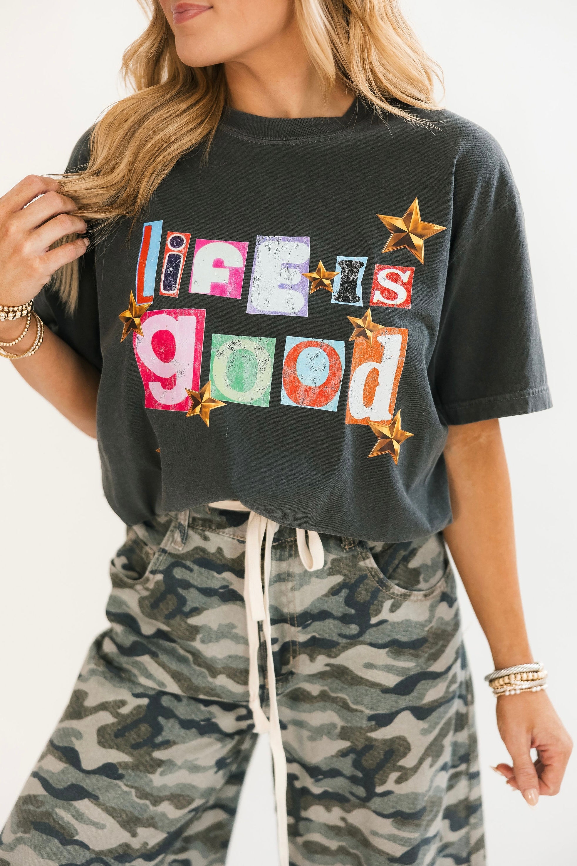The Life Is Good Graphic Tee brings effortless positivity to your wardrobe. Designed with a relaxed fit and classic crewneck, this tee features a colorful “Life is good” word graphic accented with star details. Its versatile cut makes it perfect for everyday styling—whether paired with loungewear or dressed up with denim, it’s a piece you’ll reach for again and again. Lexi is wearing a small.
