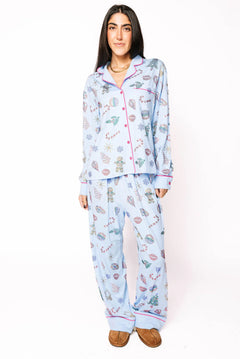 The Queen Of Sparkles Light Blue Multi Christmas Icon Long Sleeve PJ Top is the perfect blend of cozy and festive. Designed with a relaxed fit, collared neckline, and button-up front, this top is sprinkled with playful Christmas graphics that bring the holiday spirit to life. Its lightweight feel makes it ideal for lounging in style or matching with the coordinating bottoms for the ultimate festive set.