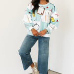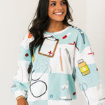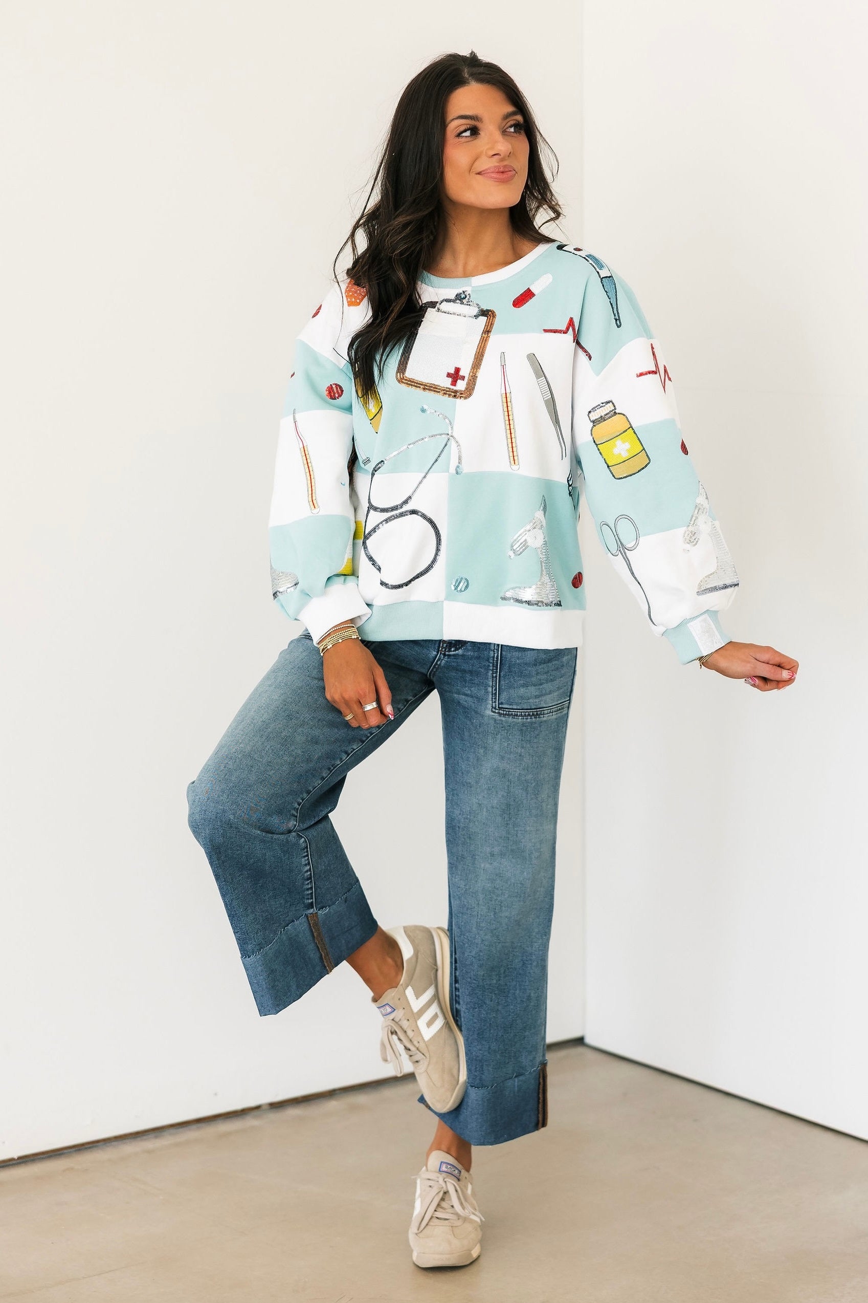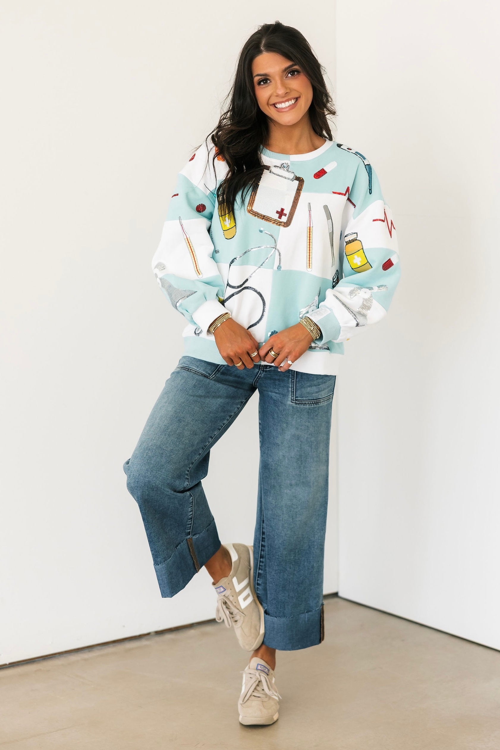 The Queen Of Sparkles Light Blue & White Checkered Medical Instrument Icon Sweatshirt features a relaxed, oversized fit with a classic crewneck and long sleeves. Perfect for layering or wearing on its own, it’s a quirky, standout piece for everyday style. Harli is wearing an XS.