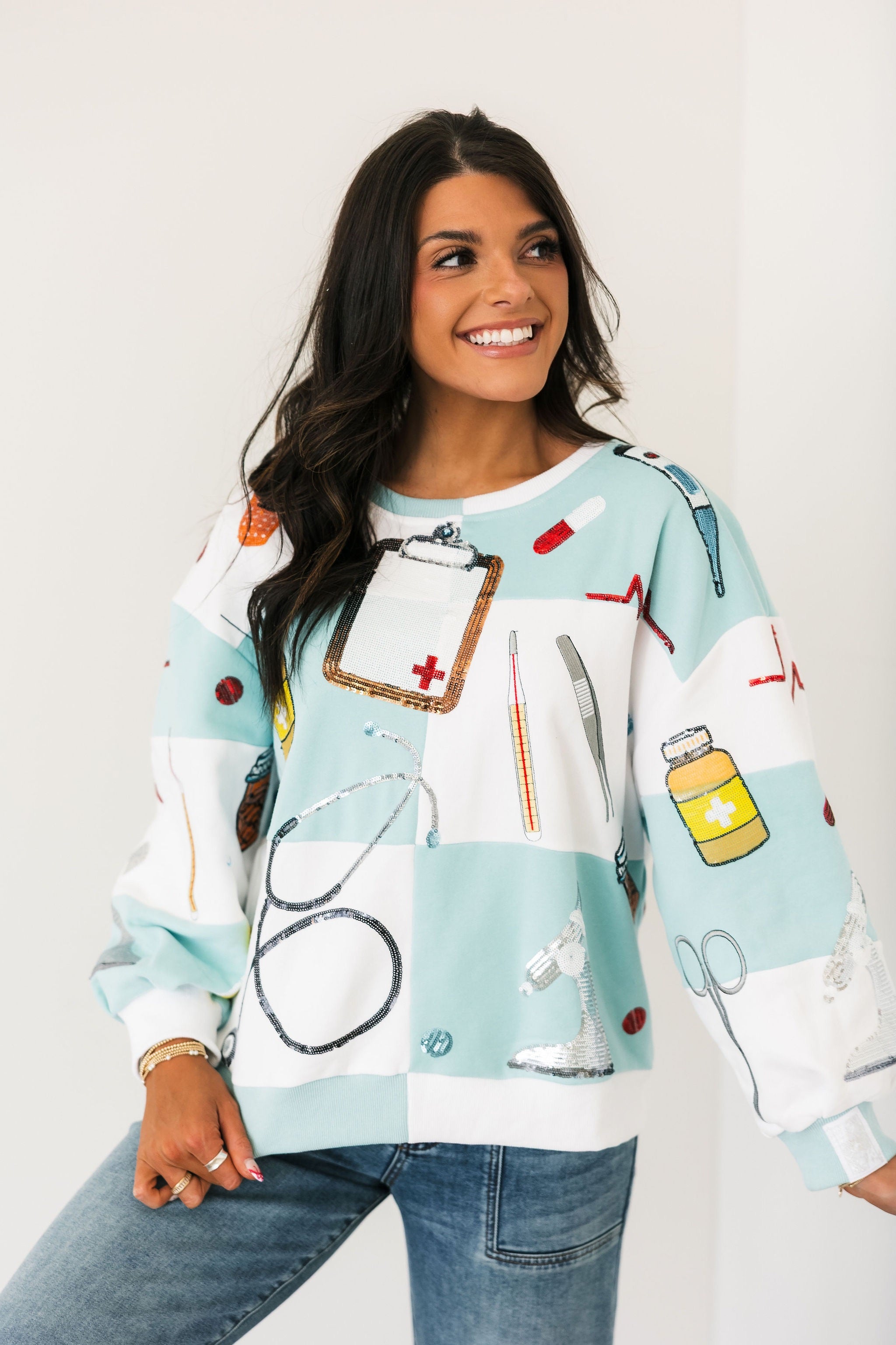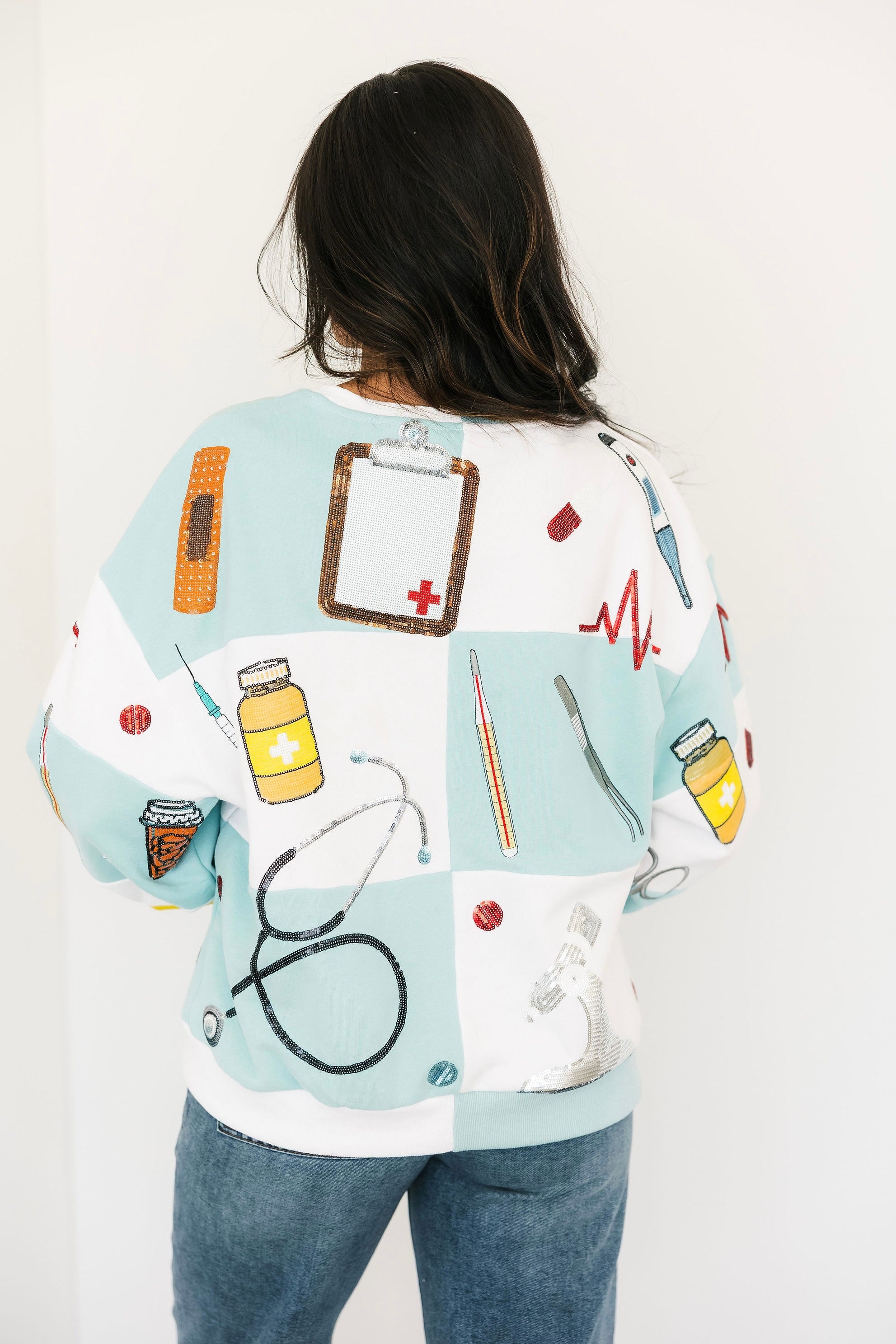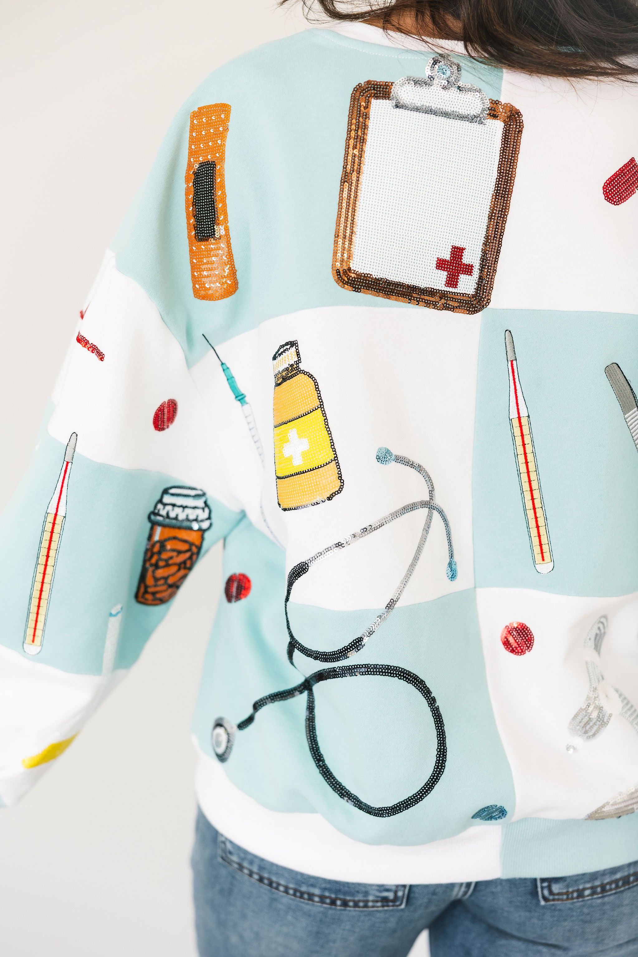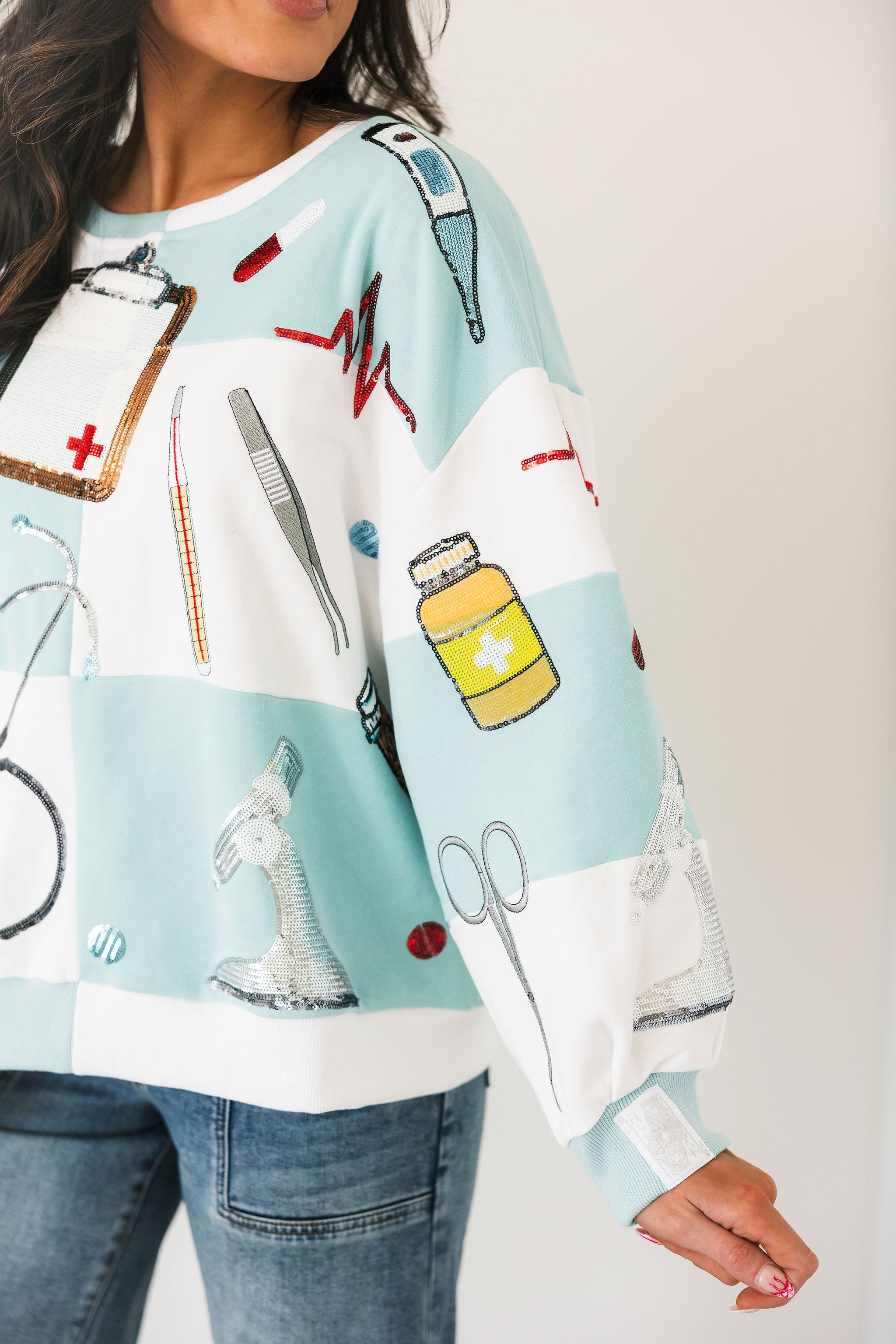 Light Blue & White Checkered Medical Instrument Icon Sweatshirt | Queen Of Sparkles