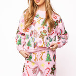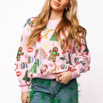 The Queen Of Sparkles Light Pink Christmas Icons Sweatshirt features a relaxed fit with a classic crewneck and long sleeves. Designed in a soft blush pink and covered in shimmering Christmas icons, this playful piece is the perfect way to add cheer to your wardrobe. Pair it with the matching pants for a full festive set, or style it solo with denim for a cozy holiday look.