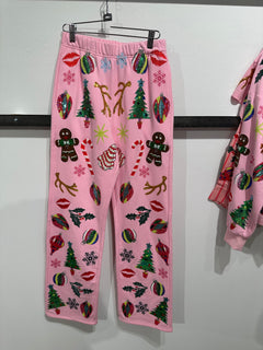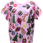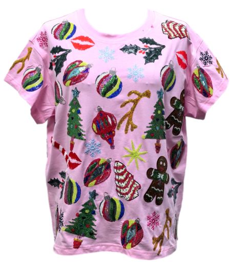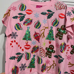 The Queen Of Sparkles Light Pink Christmas Icons Tee features a relaxed fit with a classic crewneck and short sleeves. Covered in whimsical Christmas icons, this sparkling top brings a joyful pop of holiday charm to your wardrobe. Perfect for pairing with denim, layering under cozy cardigans, or styling up for festive gatherings.