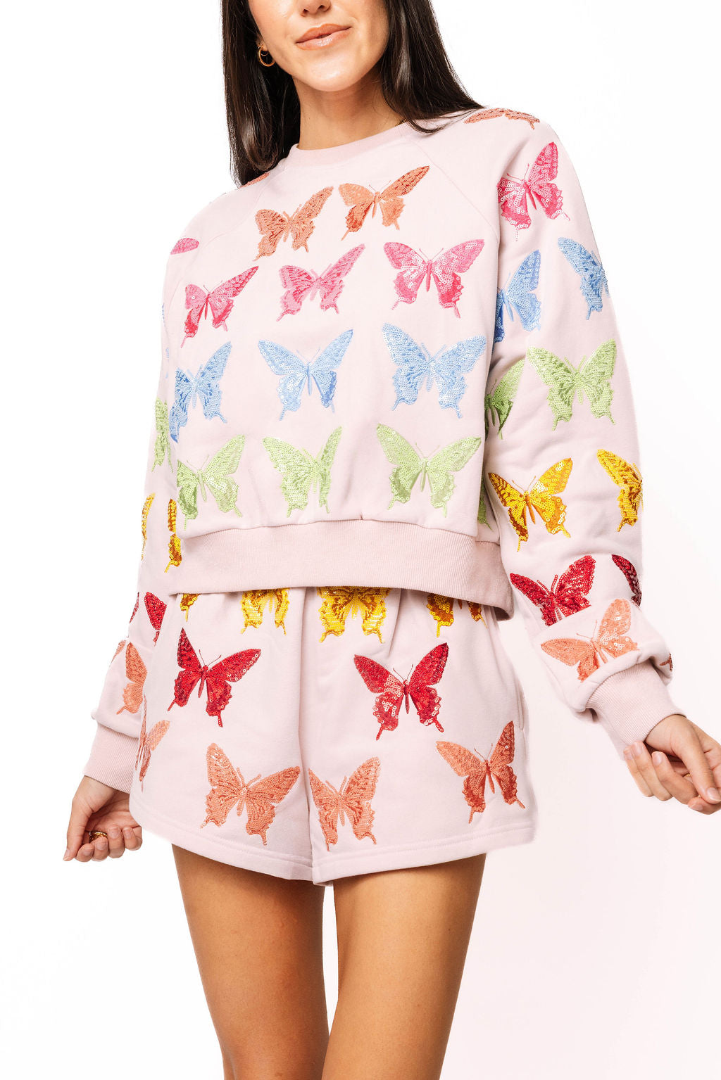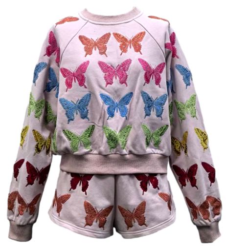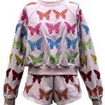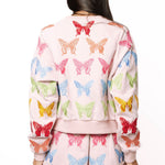 The Queen Of Sparkles Light Pink Multi Butterfly Sweatshirt features a relaxed, easy fit with a classic crew neckline and long sleeves. Designed in a soft light pink hue and finished with butterfly detailing, this piece brings a gentle statement to a laid-back silhouette. Effortless enough for everyday wear, yet special enough to stand out on its own.