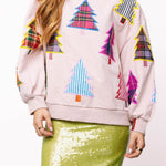 The Queen Of Sparkles Light Pink Multi Plaid & Stripe Christmas Tree Sweatshirt features a relaxed crewneck fit with long sleeves, perfect for cozying up all season long. Decorated with festive Christmas tree graphics in plaid and stripe patterns, this piece brings a fun and cheerful vibe to your holiday wardrobe.