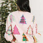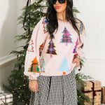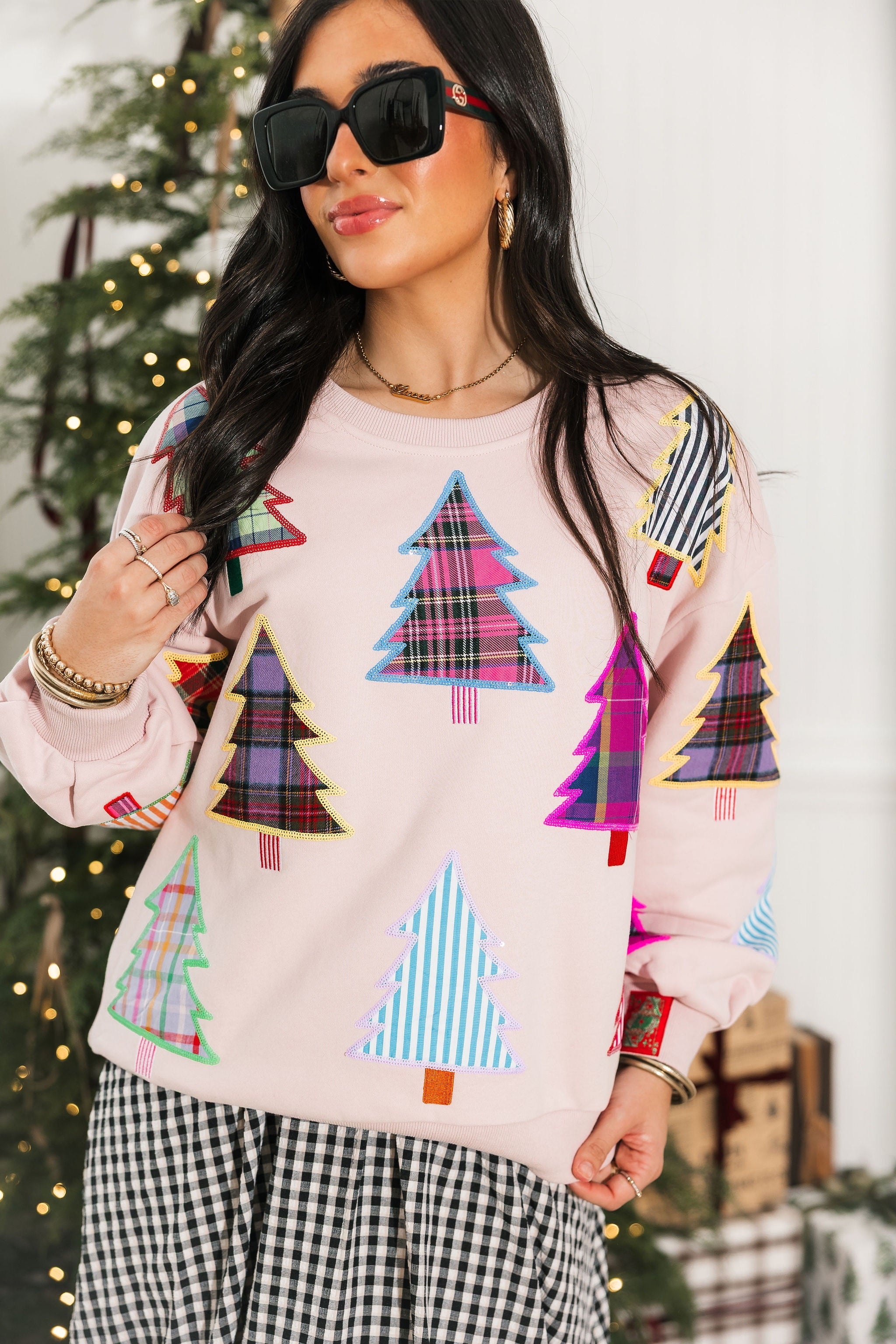 The Queen Of Sparkles Light Pink Multi Plaid & Stripe Christmas Tree Sweatshirt features a relaxed crewneck fit with long sleeves, perfect for cozying up all season long. Decorated with festive Christmas tree graphics in plaid and stripe patterns, this piece brings a fun and cheerful vibe to your holiday wardrobe. Sage is wearing an XS.