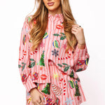 Light Pink & Red Stripe Christmas Icons Cotton Button Up Top | Queen Of Sparkles
