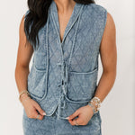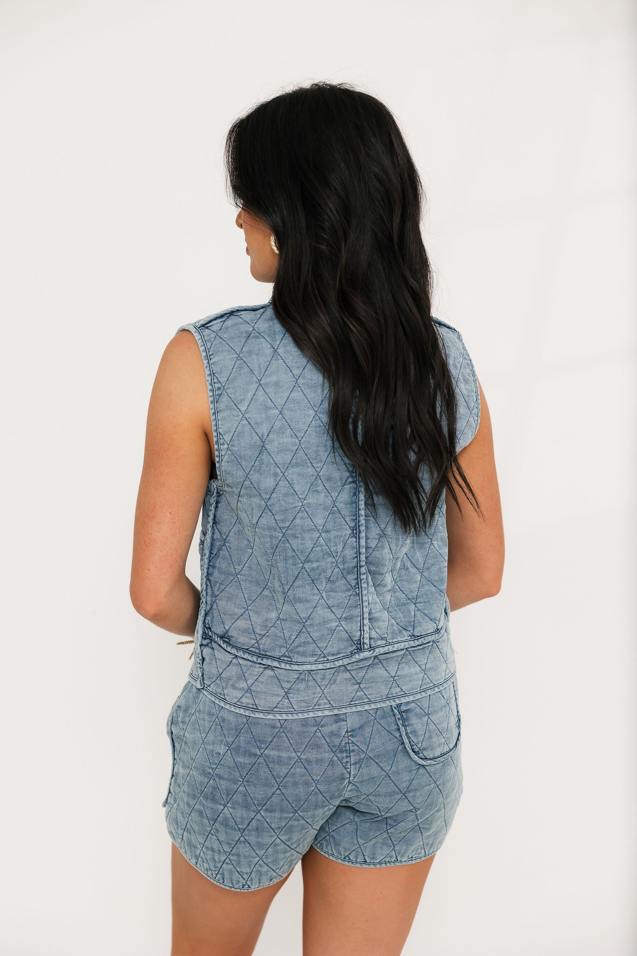 Comfy, casual, and made to match—the Lightweight Quilted Shorts in Chambray feature a soft quilted texture, elastic waistband, and easy fit. Pair them with the matching vest for the ultimate laid-back, coordinated look. Sage is wearing a small.