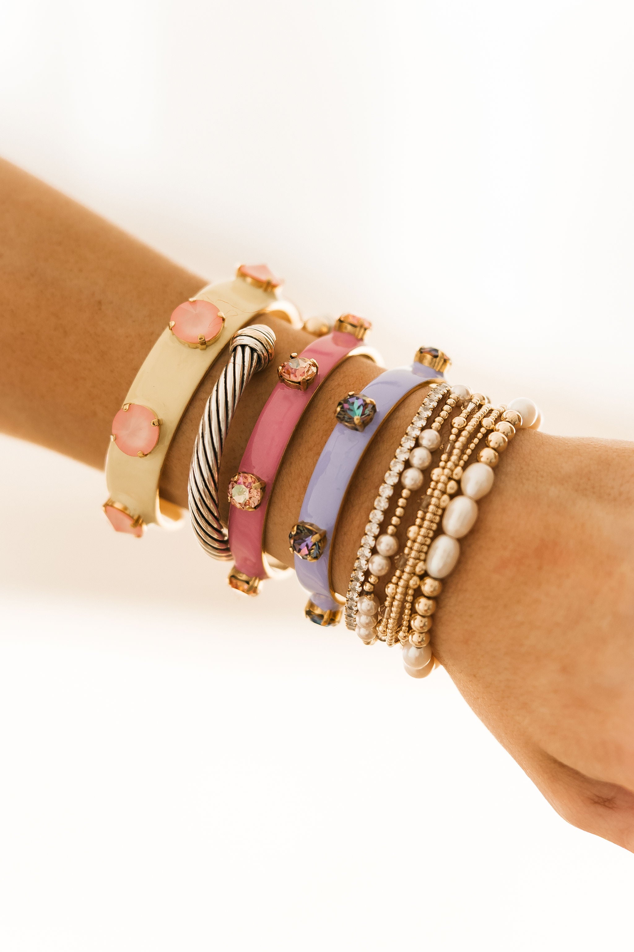 The Linsey Cuff in Butter Pink features a smooth, polished finish with a gentle blush hue that adds warmth to any look. Designed to slip on easily, it layers beautifully with other bracelets or stands out on its own for a simple, feminine statement. It brings a sweet touch to any look.