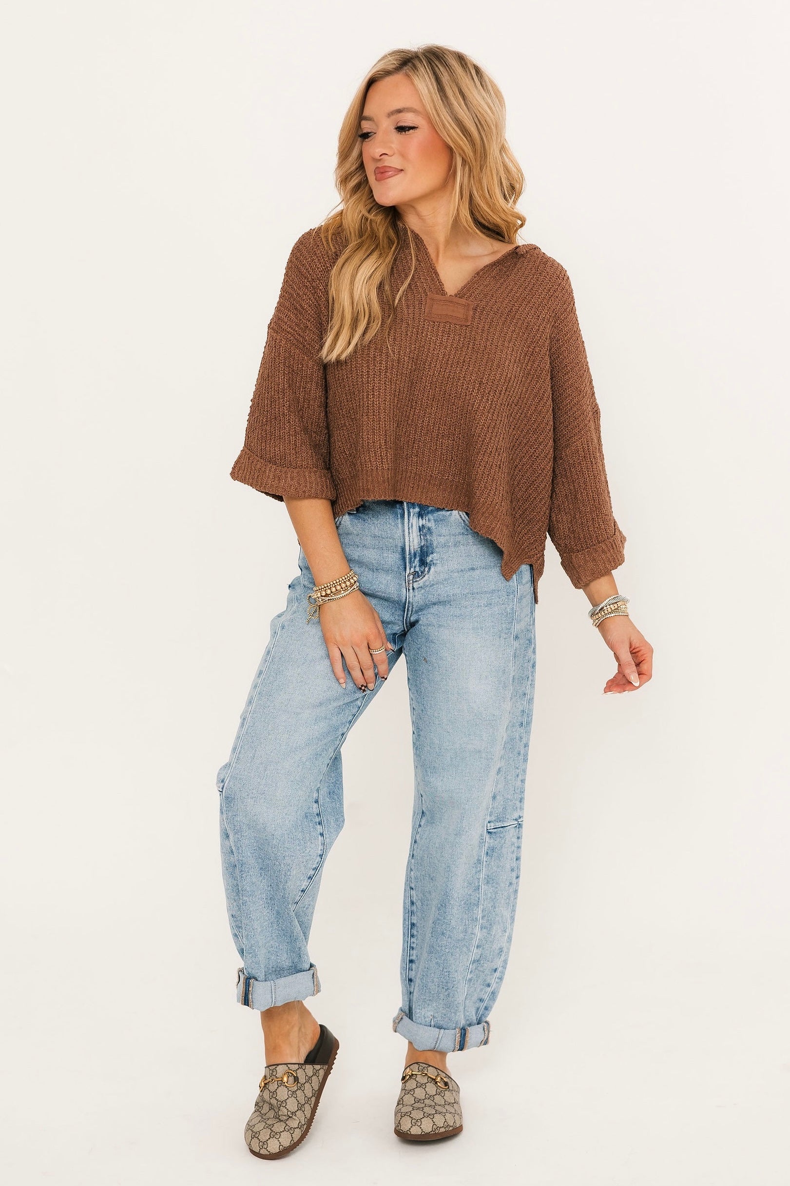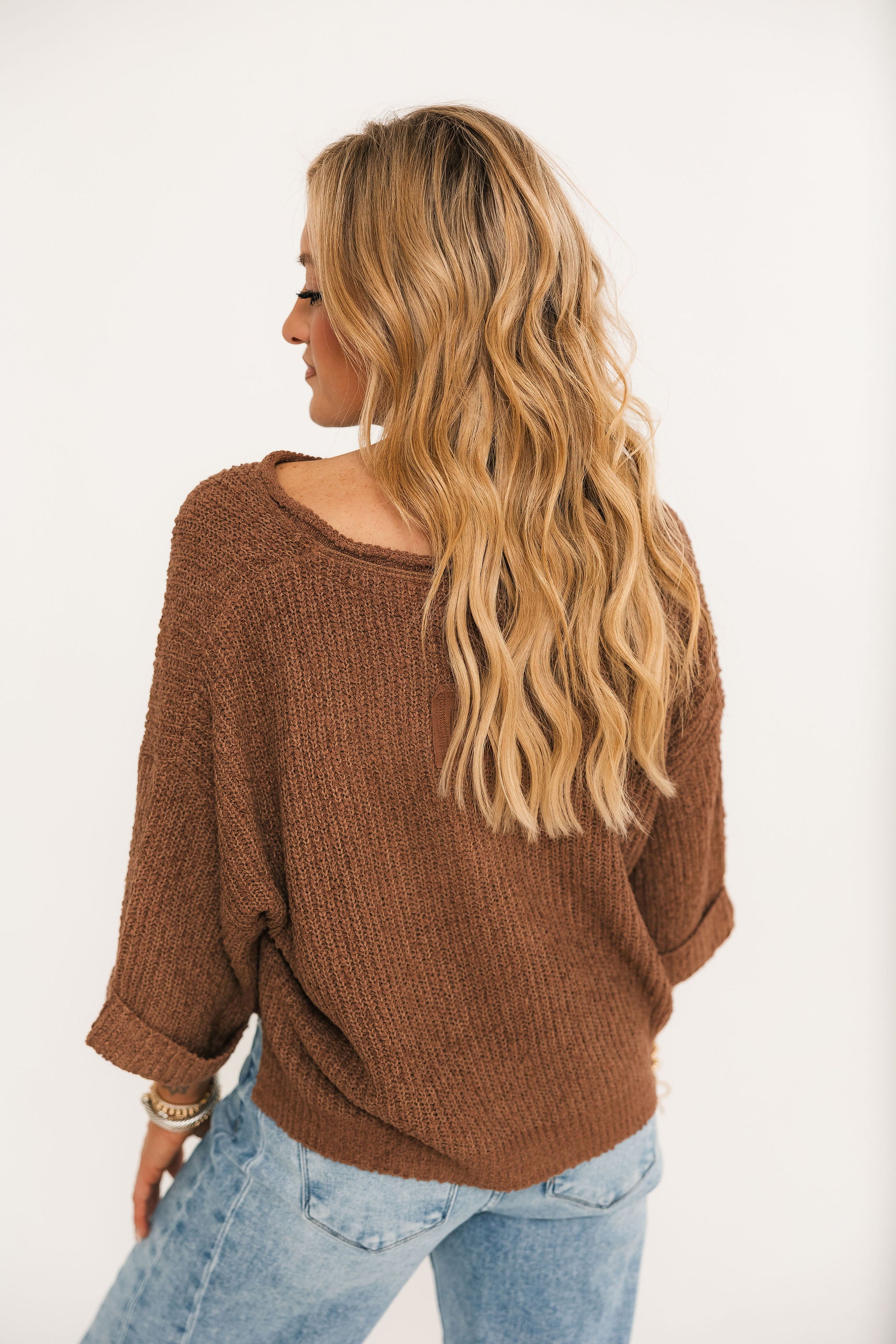 The Loralei Sweater is a cozy, laid-back essential with a touch of modern charm. Designed in a warm chestnut hue, it features a relaxed fit with a versatile v-neckline and mixed sleeve lengths for easy layering. Solid front and back patchwork details bring a unique finish, making it the perfect piece to pair with denim or skirts for effortless everyday style. Lexi is wearing a small.