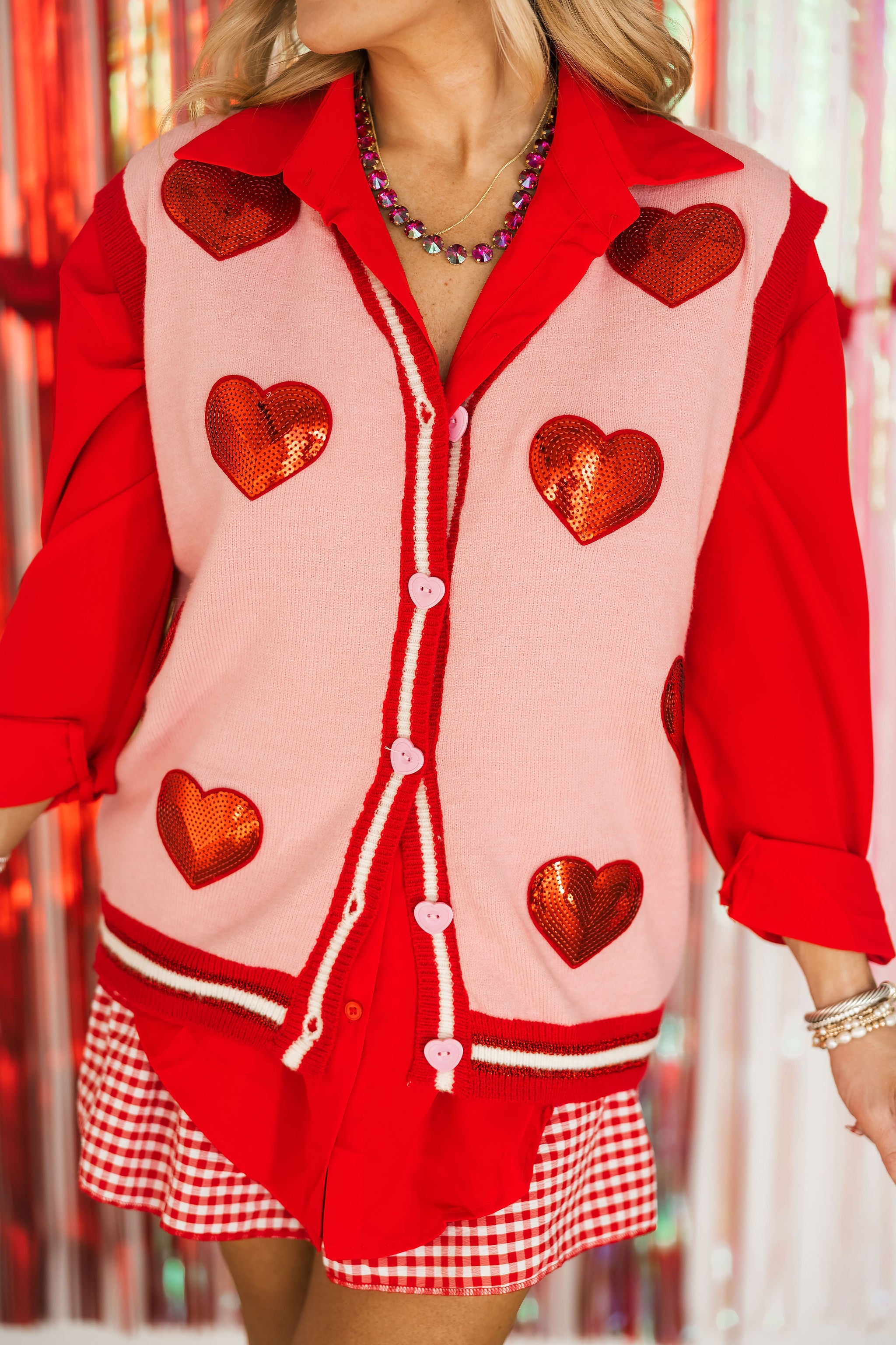 The Lovely Little Thing Sweater Vest has a relaxed, cozy fit with a flattering V-neckline and classic front button closure. Its sleeveless silhouette makes it perfect for layering over sheer tops, lace blouses, or worn on its own for an easy, romantic look. A timeless piece that adds just the right amount of warmth and charm to any Valentine-ready outfit. Lexi is wearing a S/M.