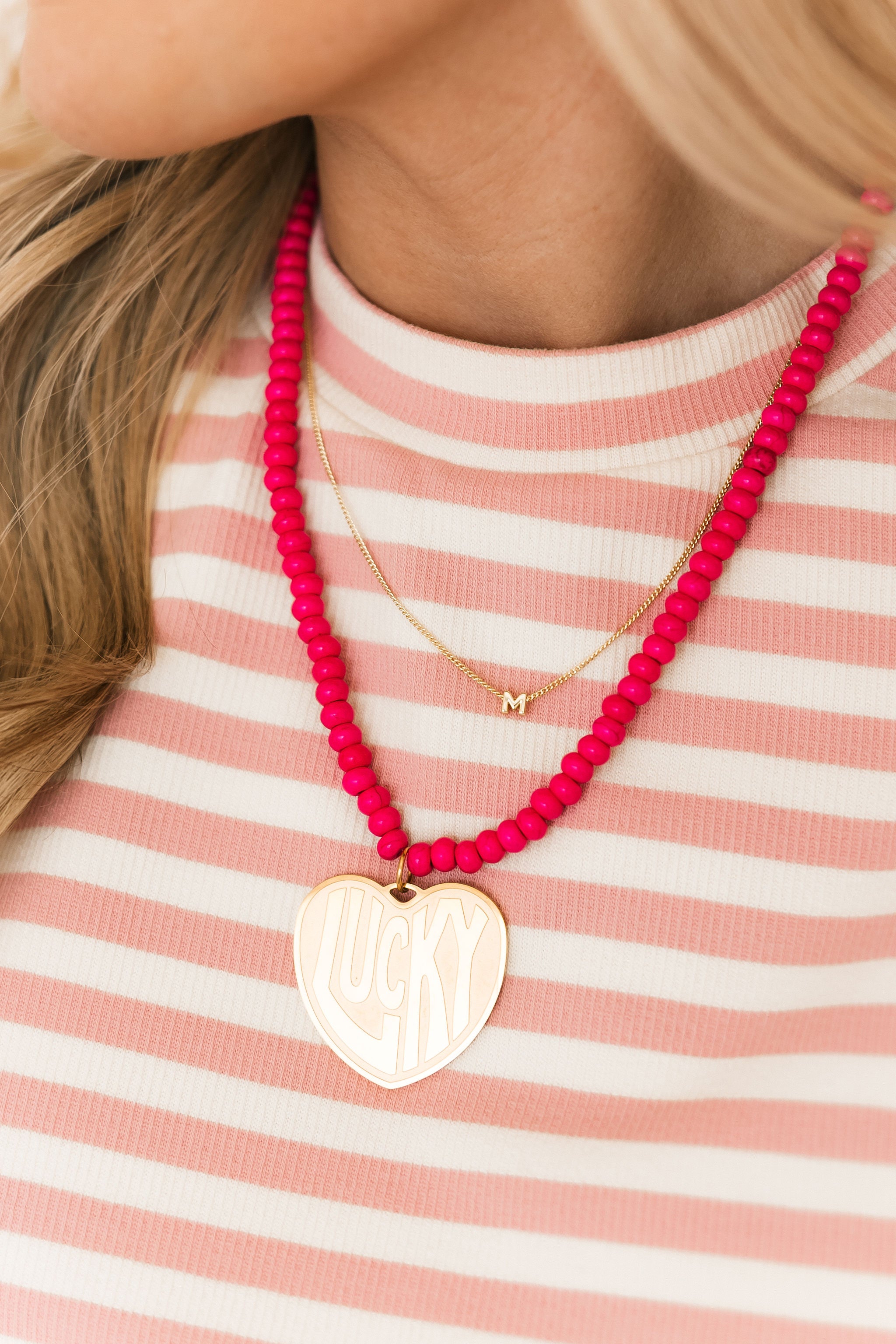 Lucky in Love Stone Necklace in hot pink is the perfect girly inspired necklace featuring pink stones with a gold heart charm that says "Lucky". Perfect for adding a little something to your everyday fits.