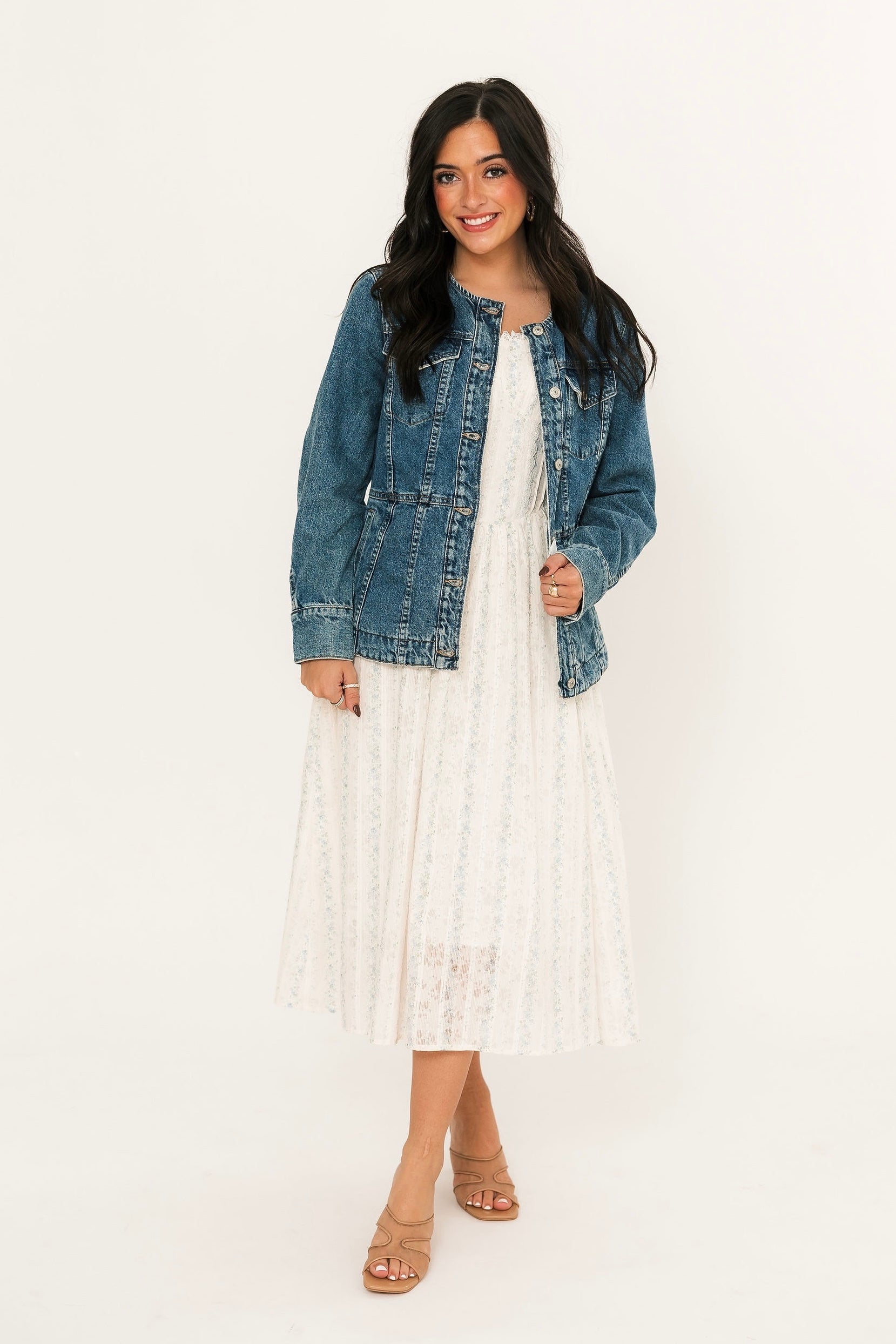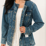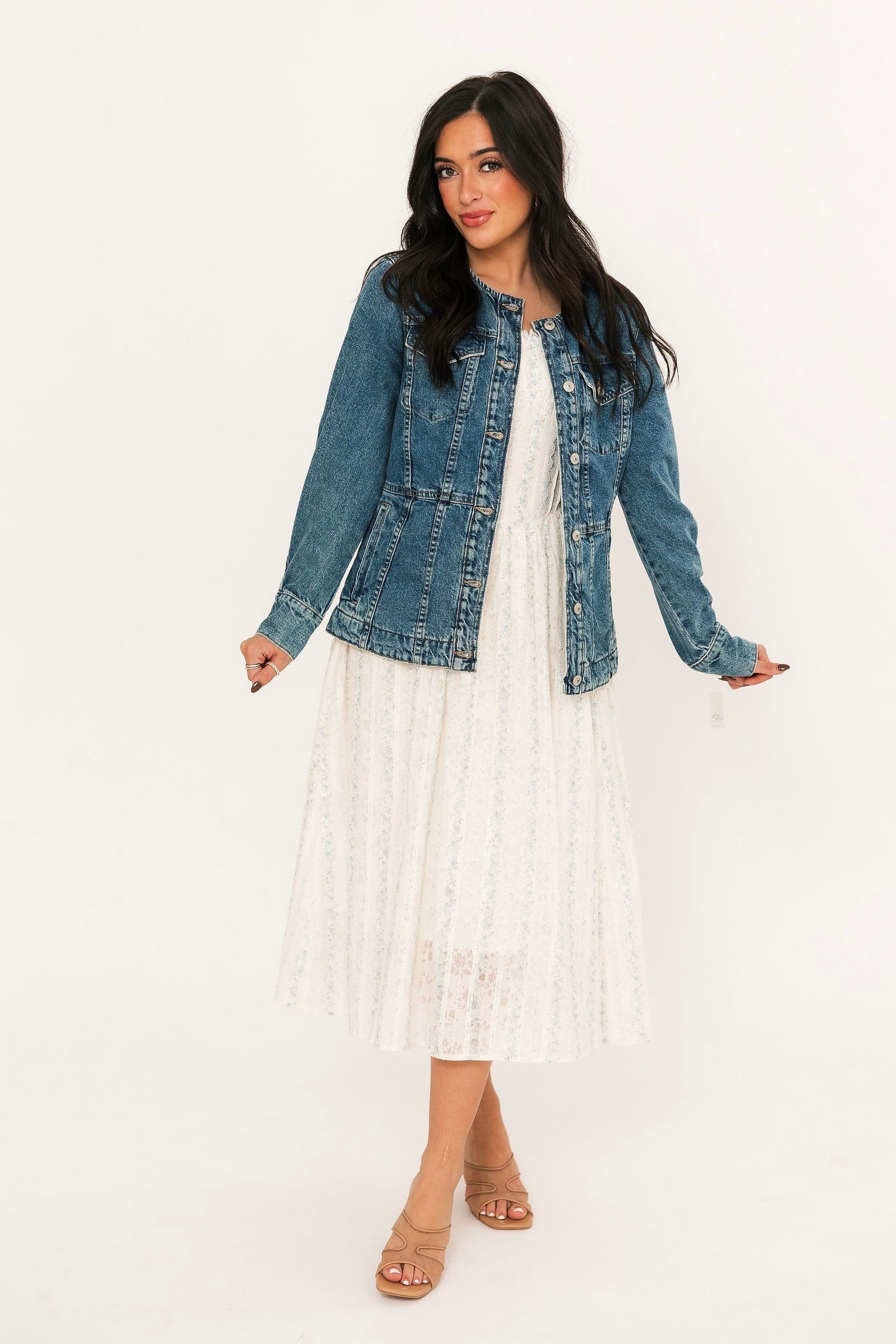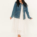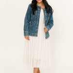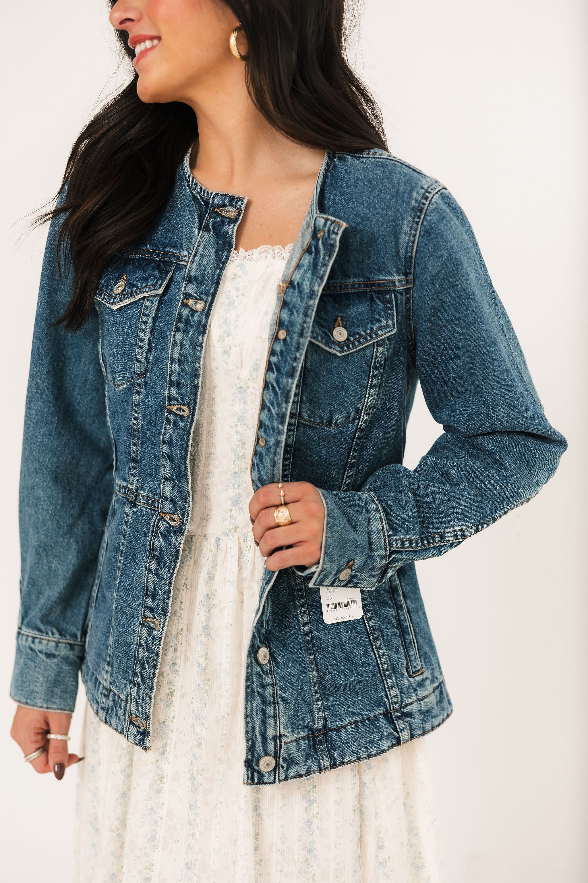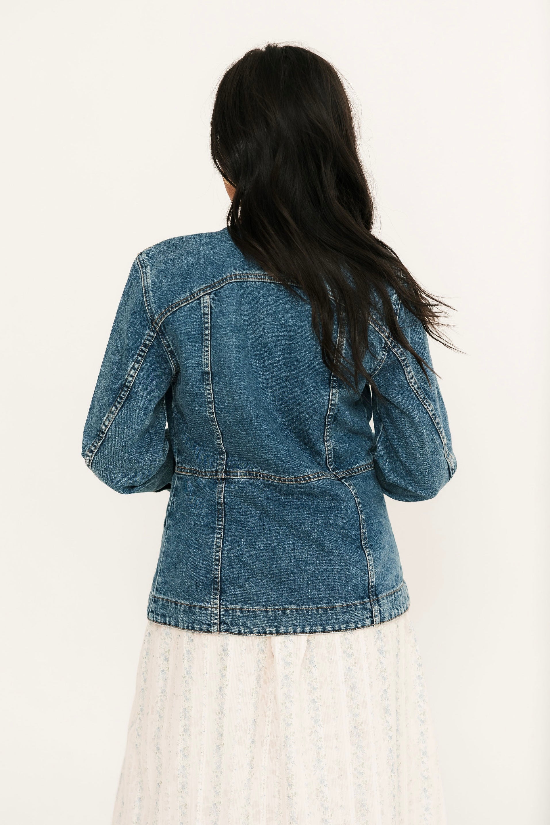 Take your denim jacket game to the next level with this so cool version featuring dropped shoulders for shape and defined seams for an added special, swingy touch. Sage is wearing an xs.