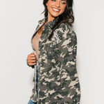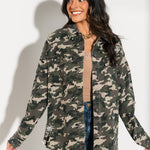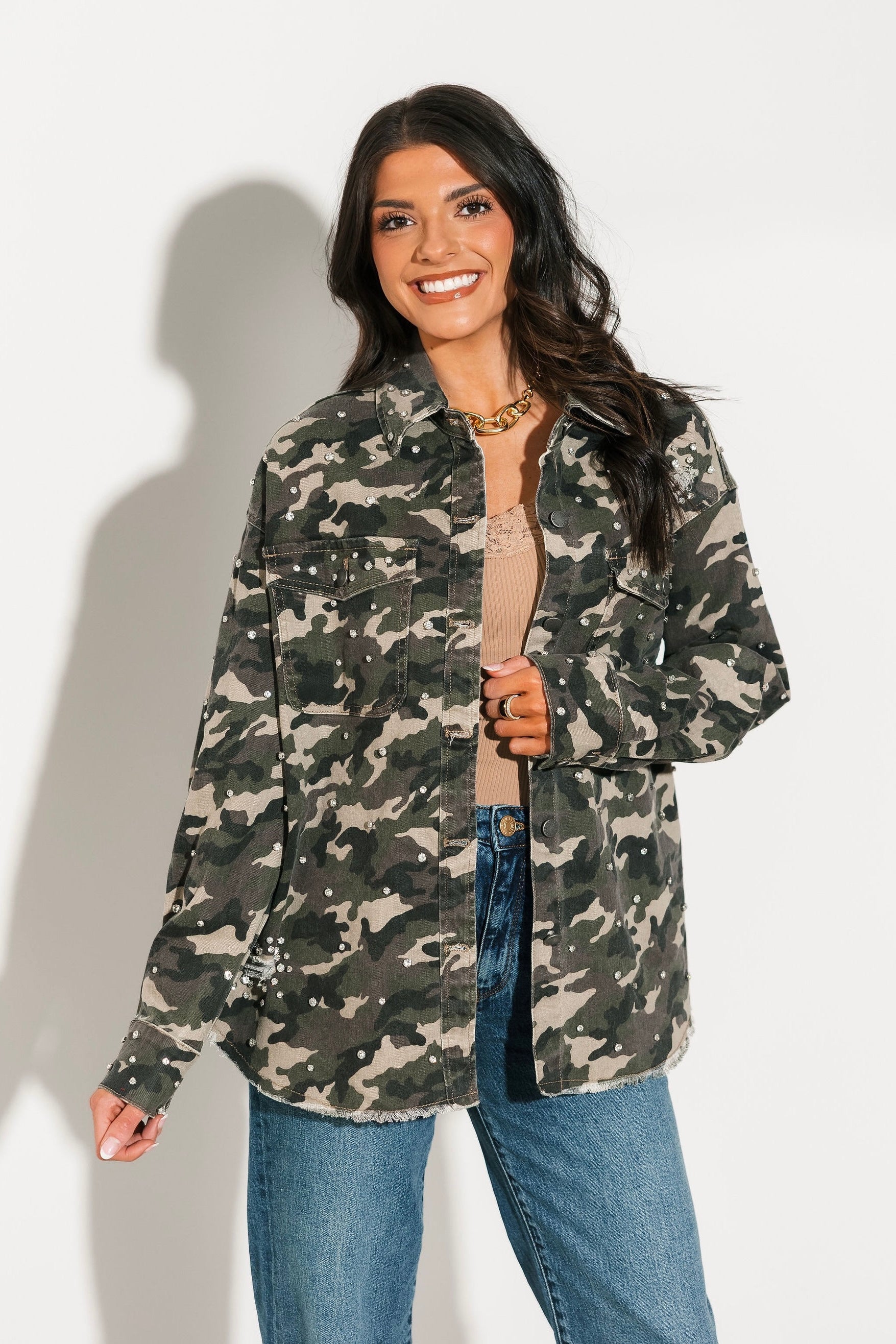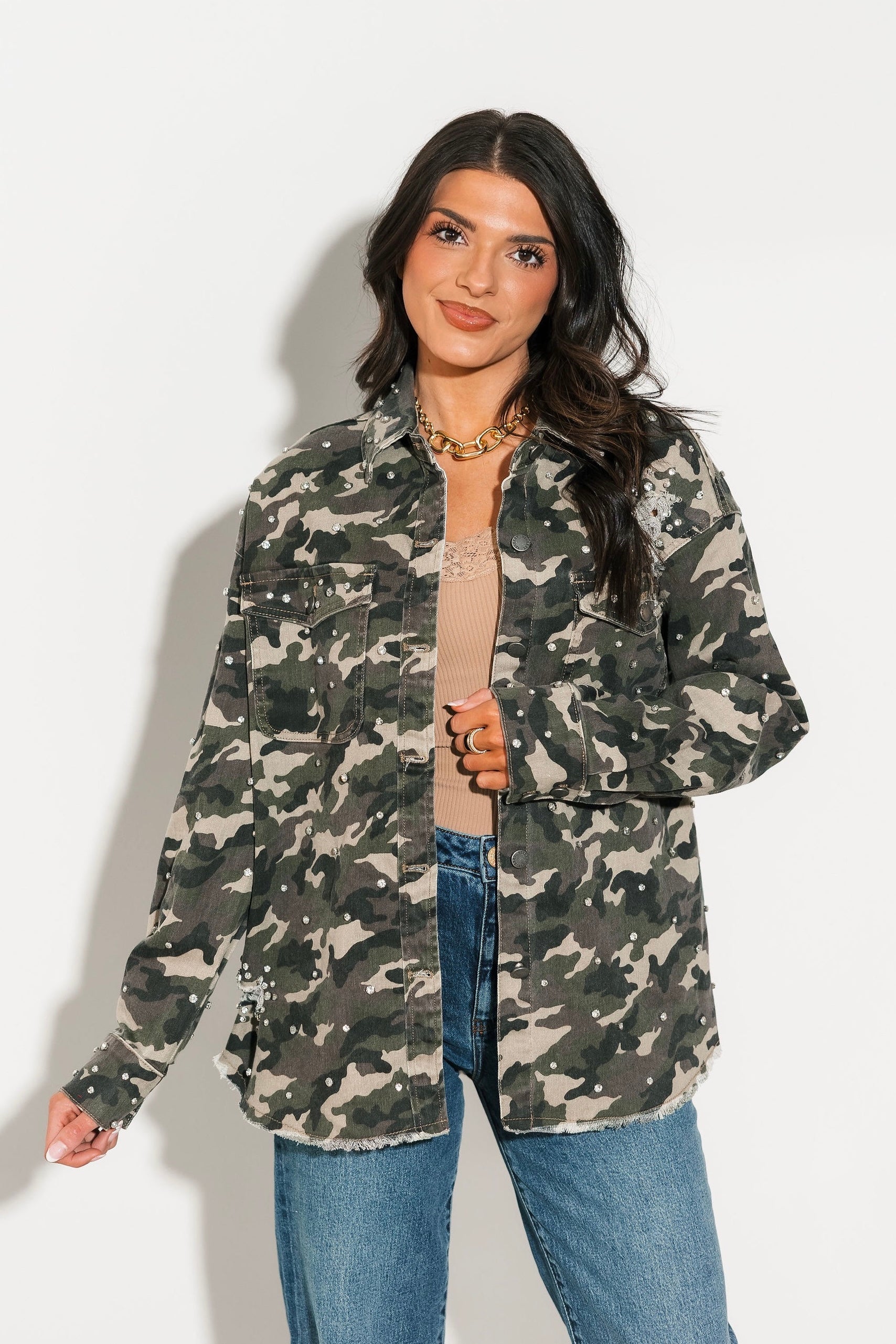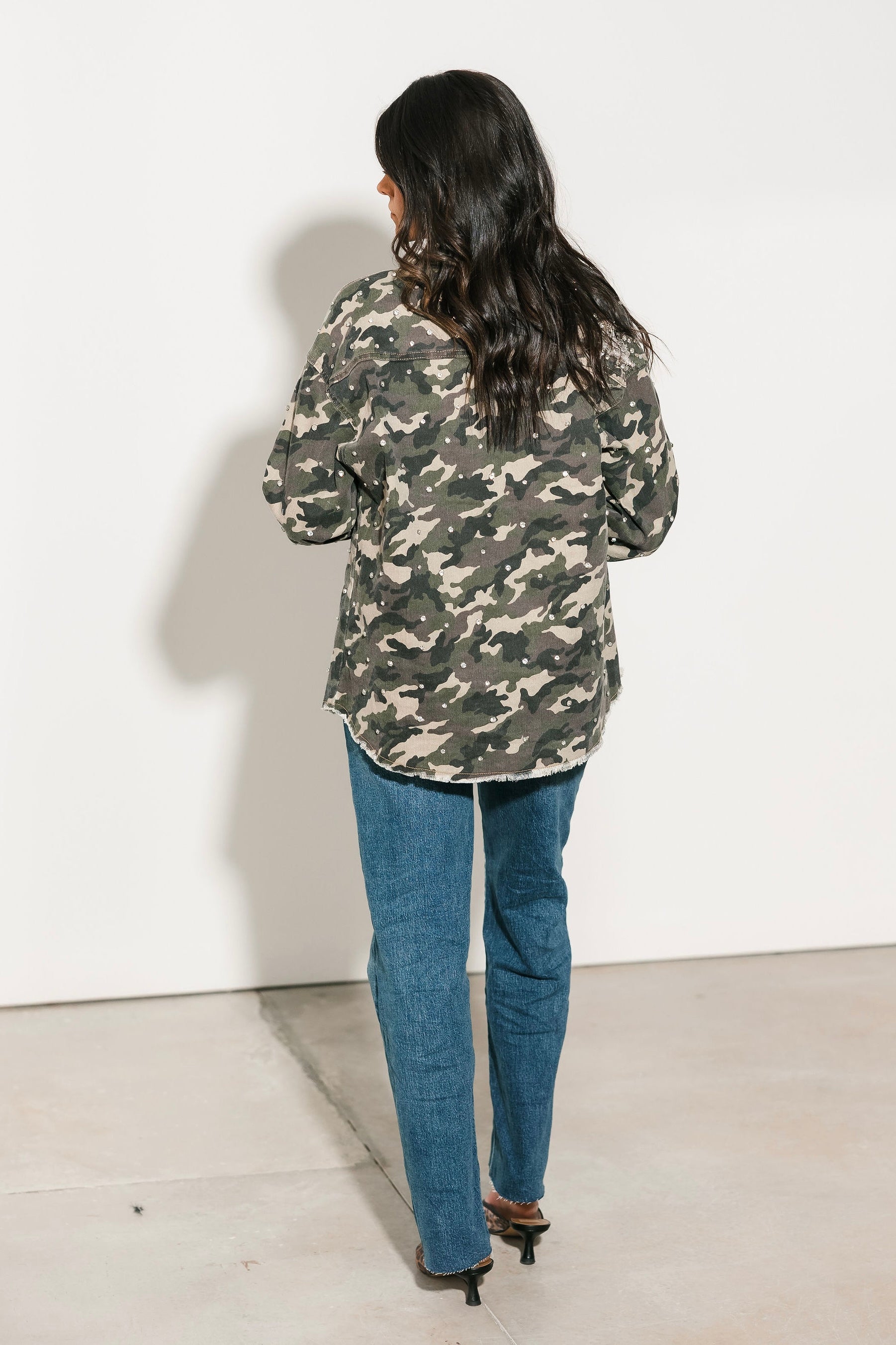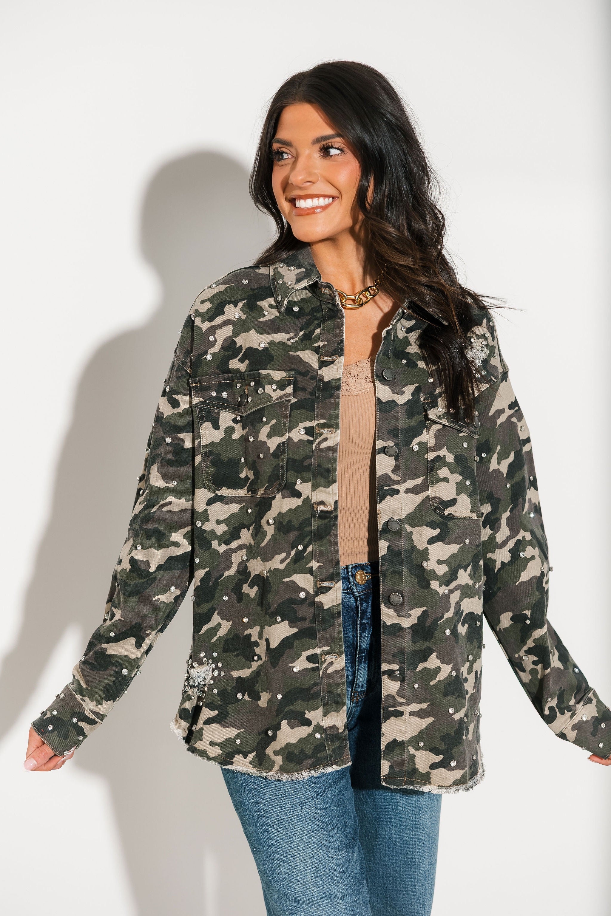 A classic camo jacket with a luxe twist. Featuring sparkling rhinestone embellishments on the shoulders and a relaxed, slightly oversized fit, this piece blends edge and elegance effortlessly. Dress it up or down — it’s a standout layer you’ll reach for again and again. Harli is wearing a medium.