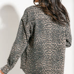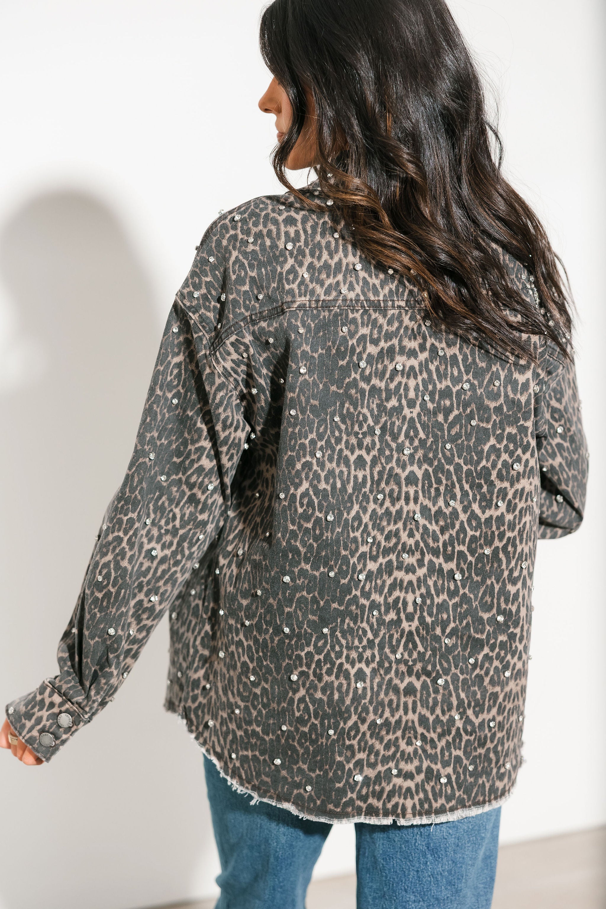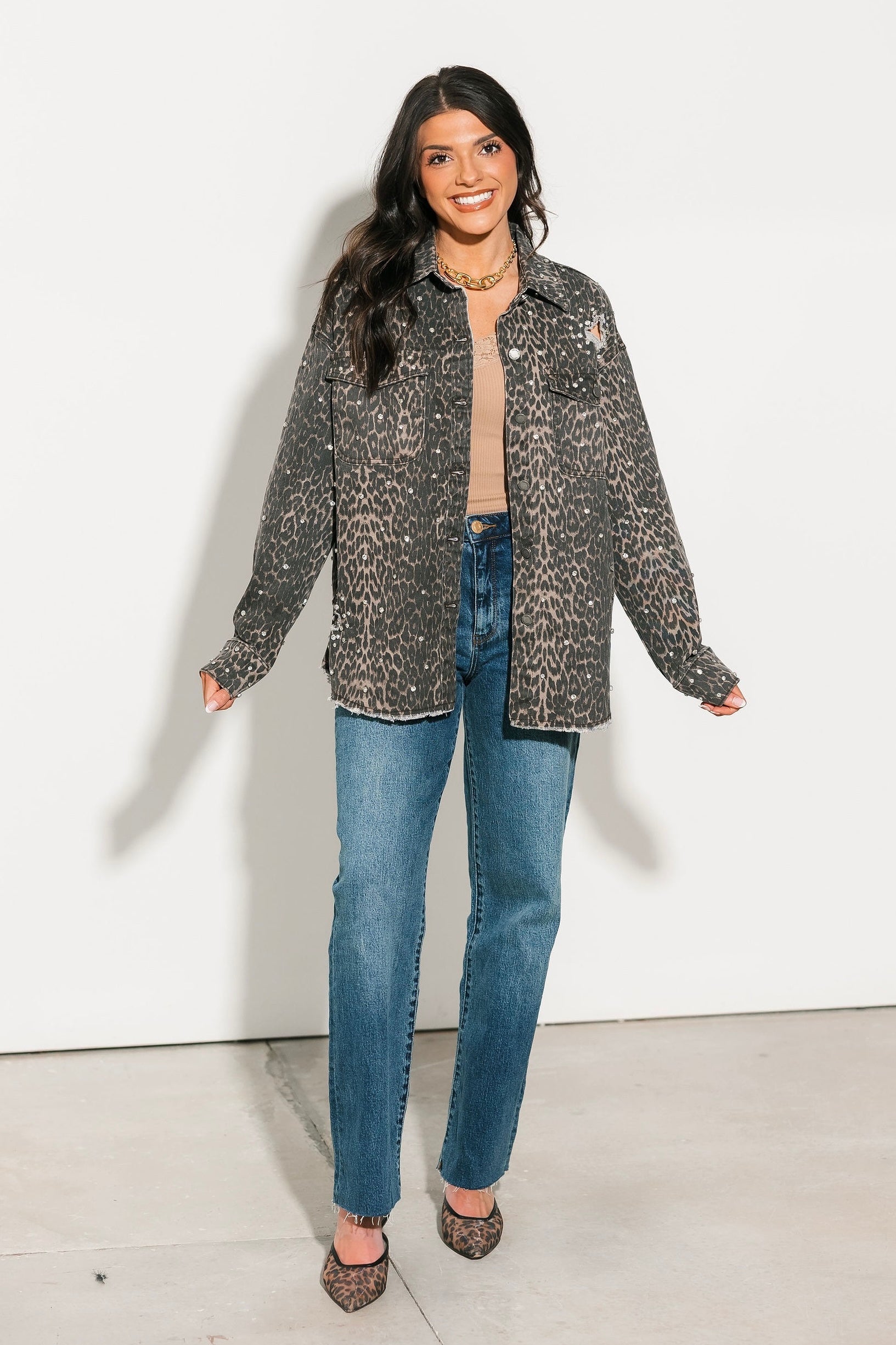 A bold take on classic cool, this luxe leopard jacket features subtle sparkle detailing and a relaxed silhouette. The lightweight fit layers effortlessly, adding instant edge and glam to any outfit. Harli is wearing a medium.