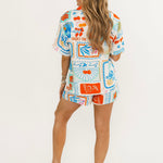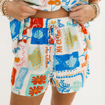 Playful retro-inspired print with a vibrant mix of florals & fruits. Perfect for casual lounging or a sunny day out! This lightweight fabric & bright, colorful patch-work style graphic gives these shorts a fun and flirty vibe! Lexi is wearing a small.