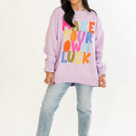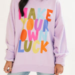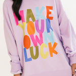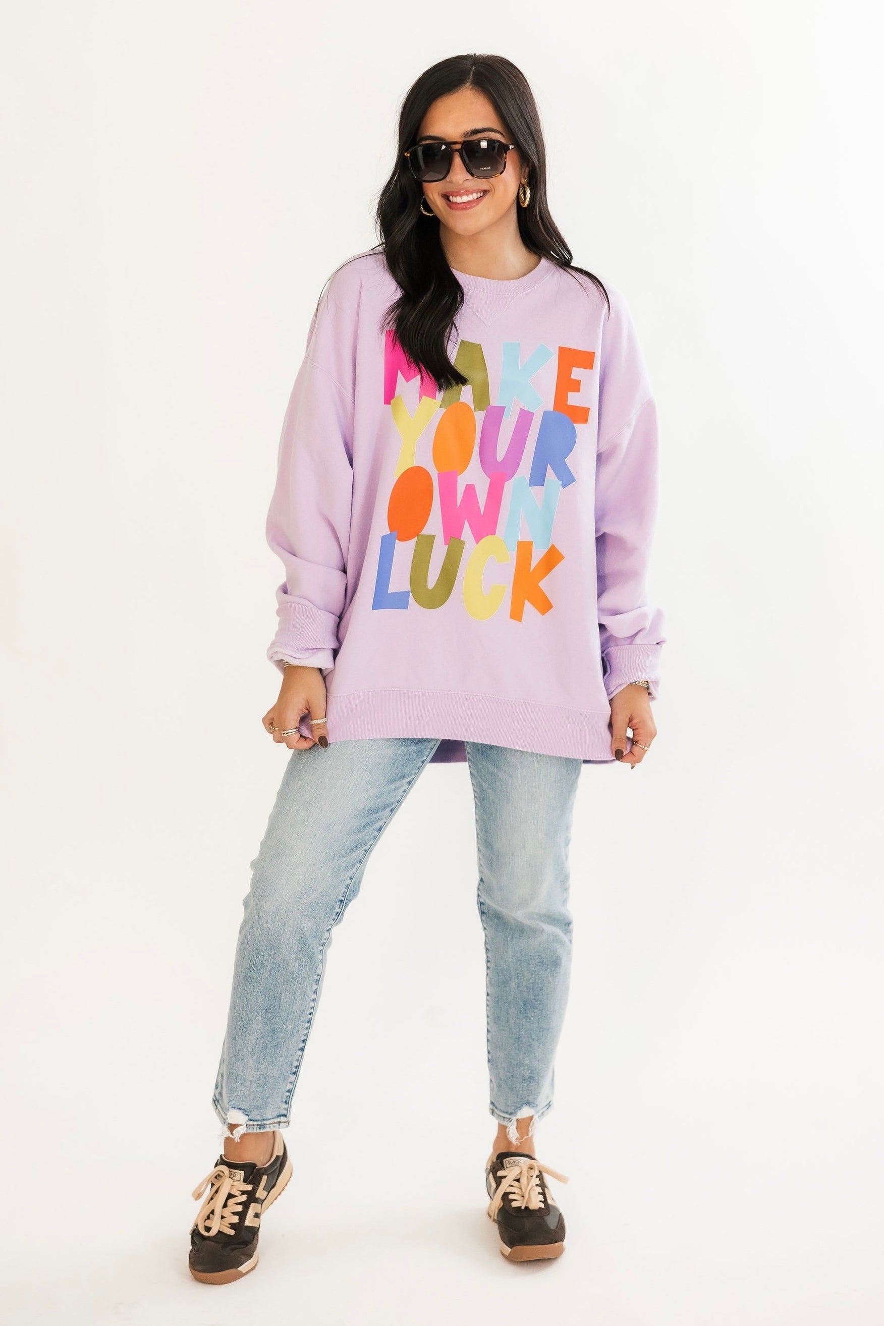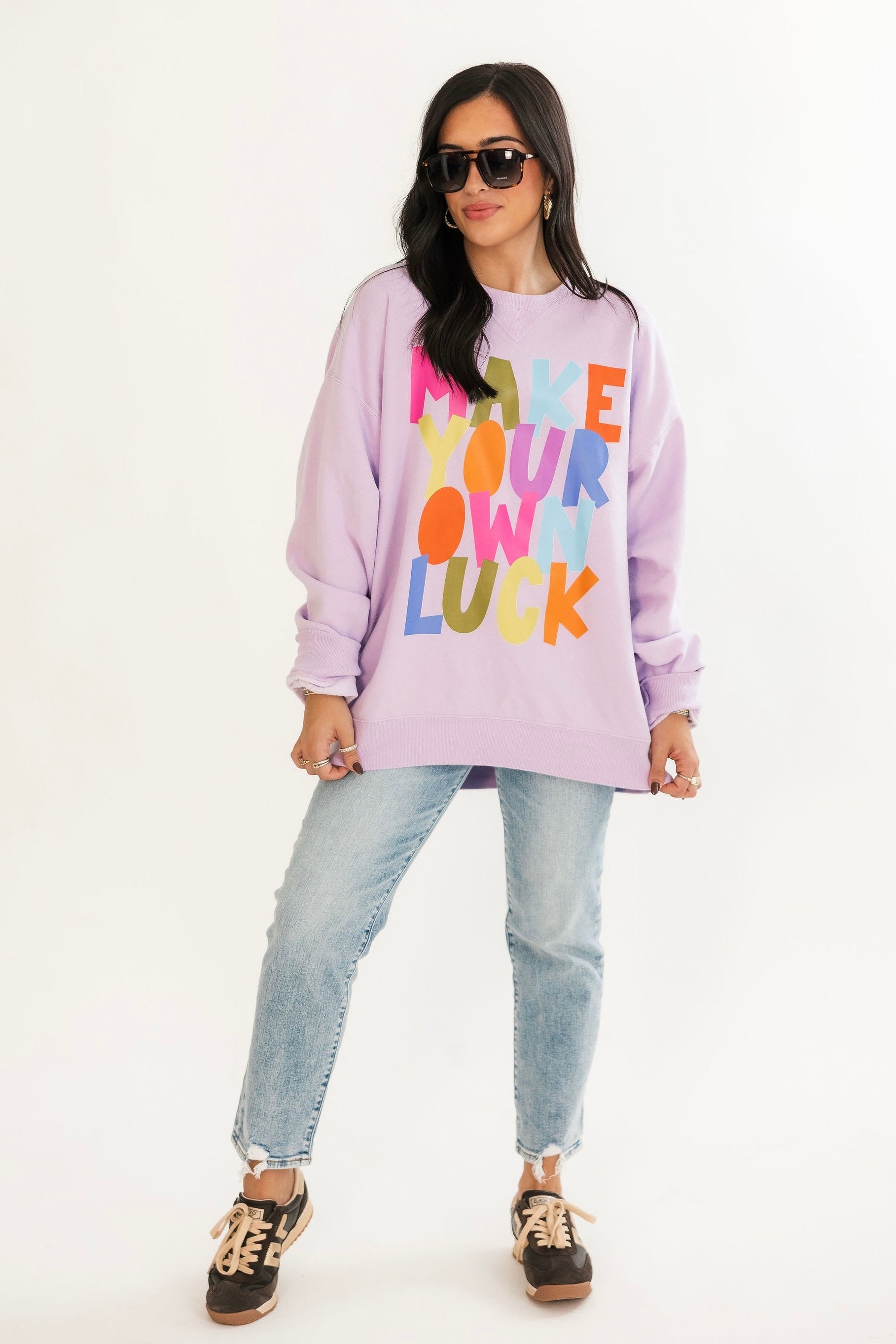 Manifest good vibes in the Make Your Own Luck Crewneck. Designed with an oversized fit for maximum comfort, this playful sweatshirt features a vibrant word graphic that inspires while adding a pop of color to your everyday style. Perfect for layering or wearing solo when you’re feeling lucky. Sage is wearing a small.