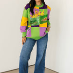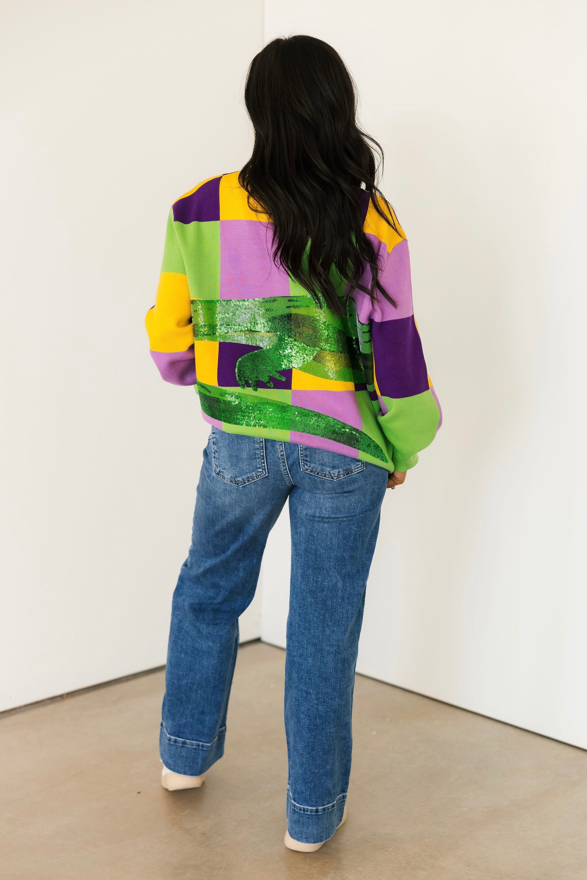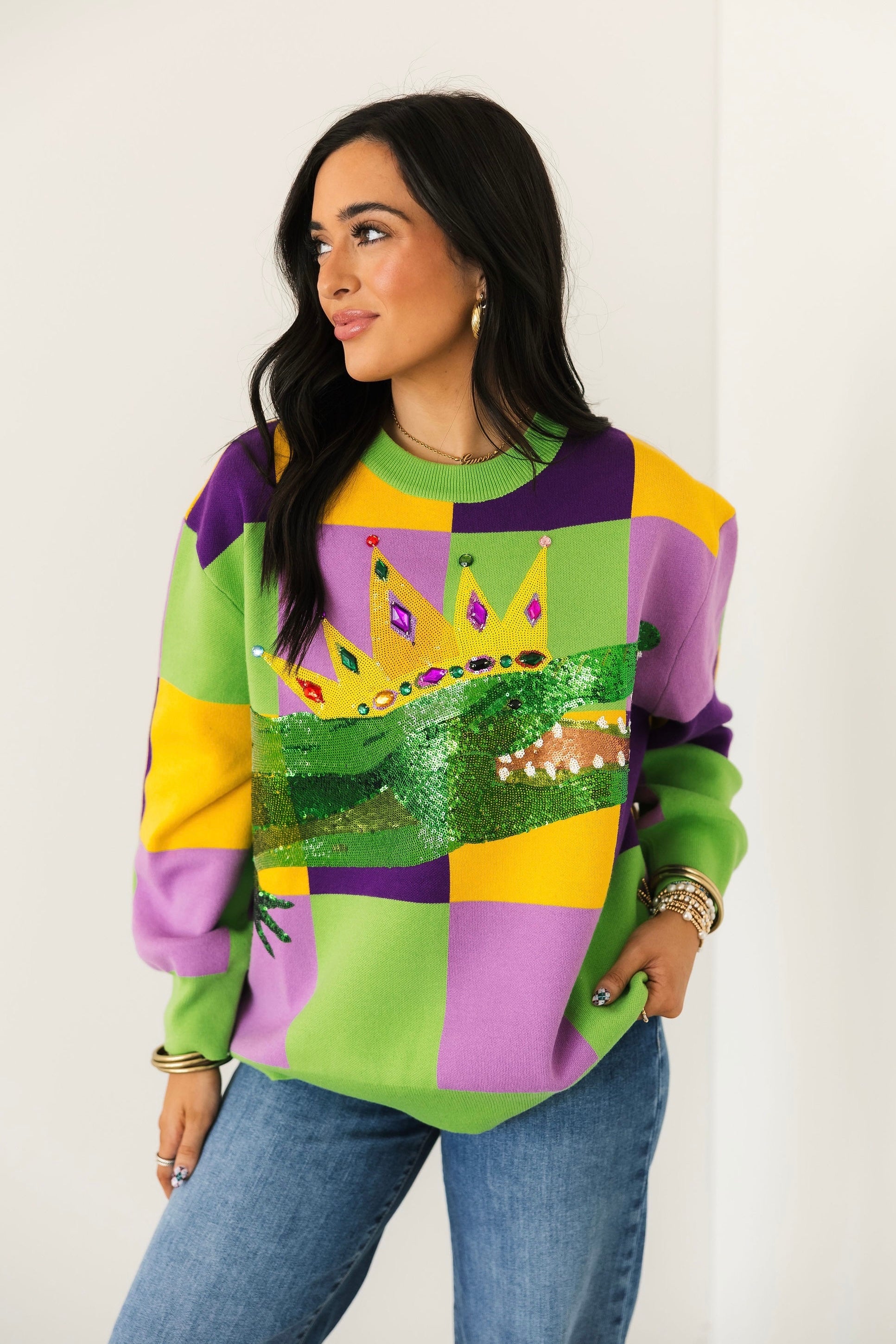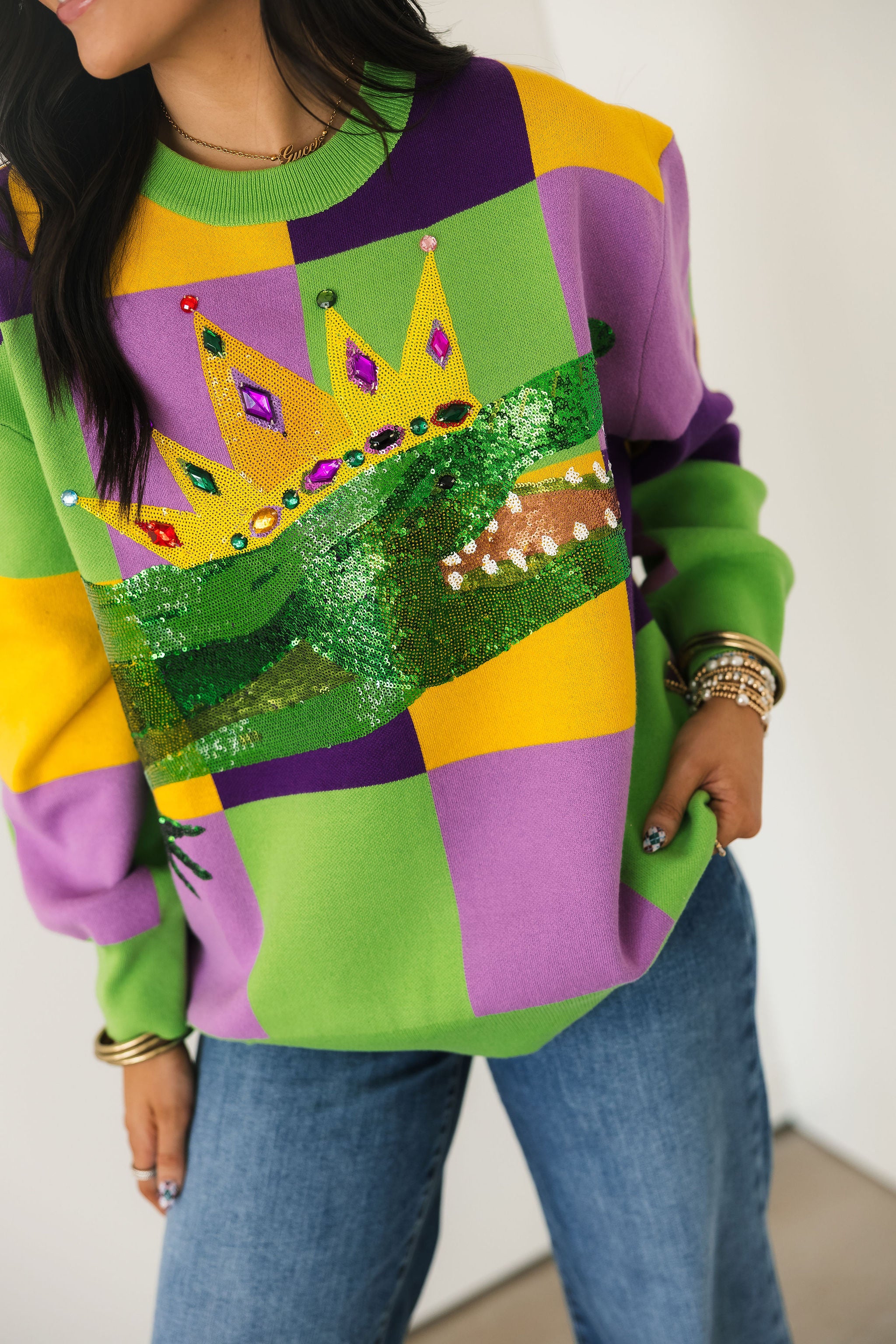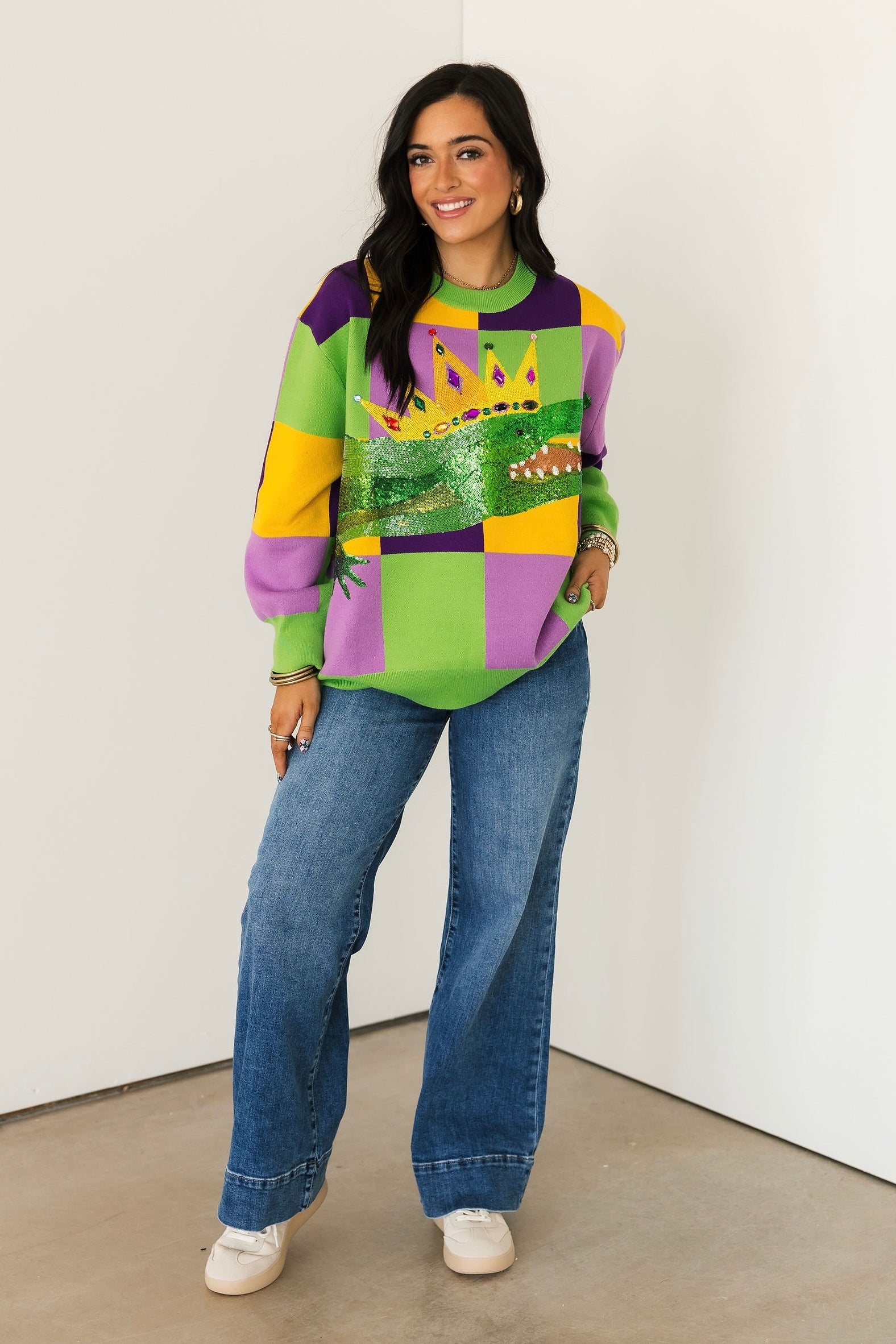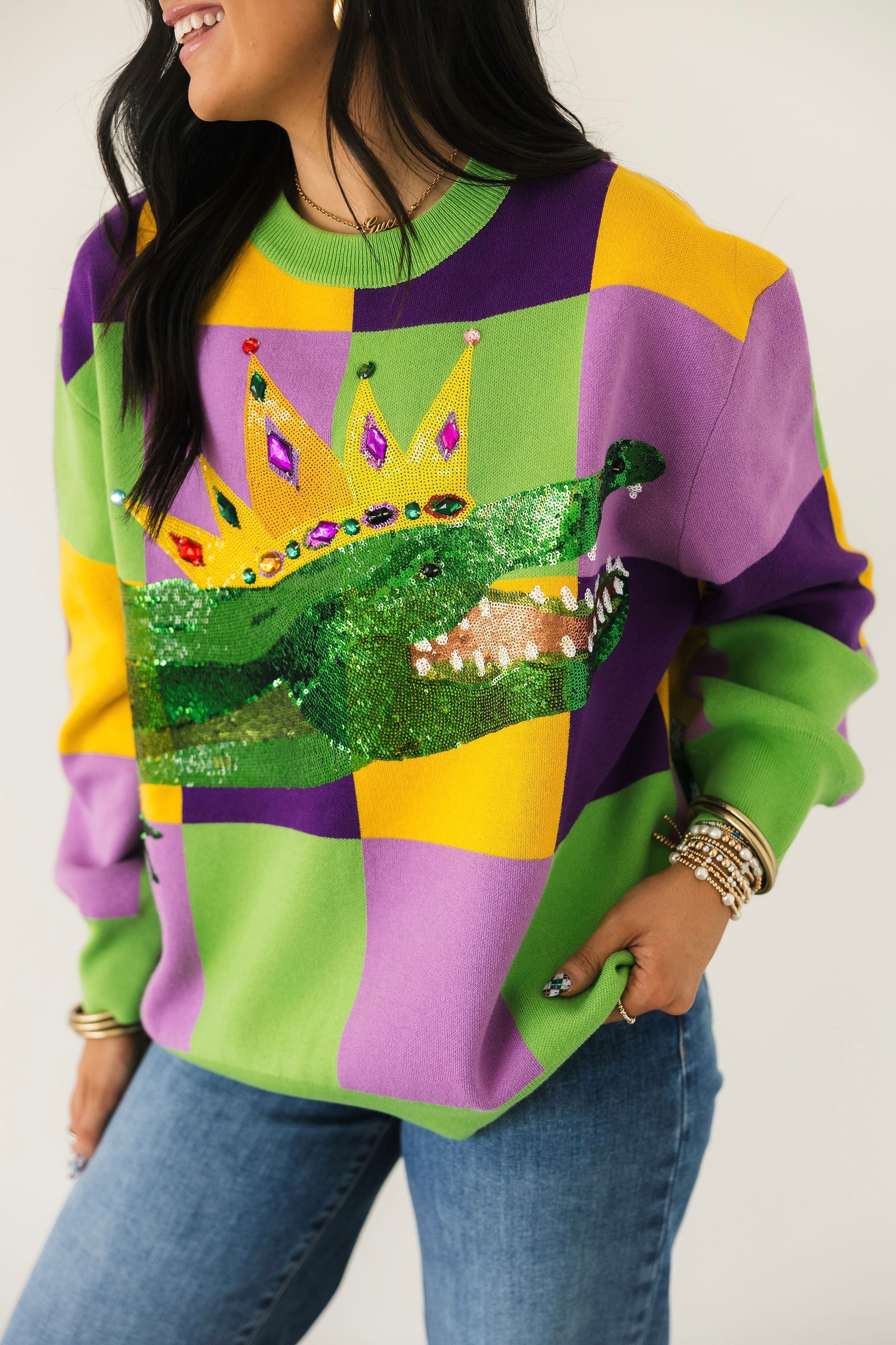 This cozy crewneck sweater features long sleeves and a striking checkered pattern accented with glittering alligator details for the ultimate carnival vibe. Playful yet elevated, it’s perfect for parades, parties, or adding a pop of Mardi Gras spirit to your everyday look. Sage is wearing an XS.