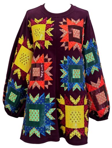 Step into fall with playful elegance in this relaxed, flowy mini dress. Featuring a classic crewneck, statement balloon sleeves, and a whimsical maroon multi patchwork design, it’s perfect for layering or wearing solo for a chic seasonal look.