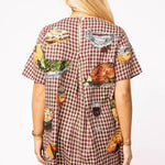 The Queen Of Sparkles Maroon Queen Of Turkey Short Sleeve Dress features a relaxed fit with a classic crewneck, short sleeves, and mini length. Decorated with a whimsical checkerboard print and Thanksgiving food graphics, it’s a fun and eye-catching piece perfect for holiday parties, family gatherings, or any festive celebration. Cozy, playful, and unmistakably Queen of Sparkles.