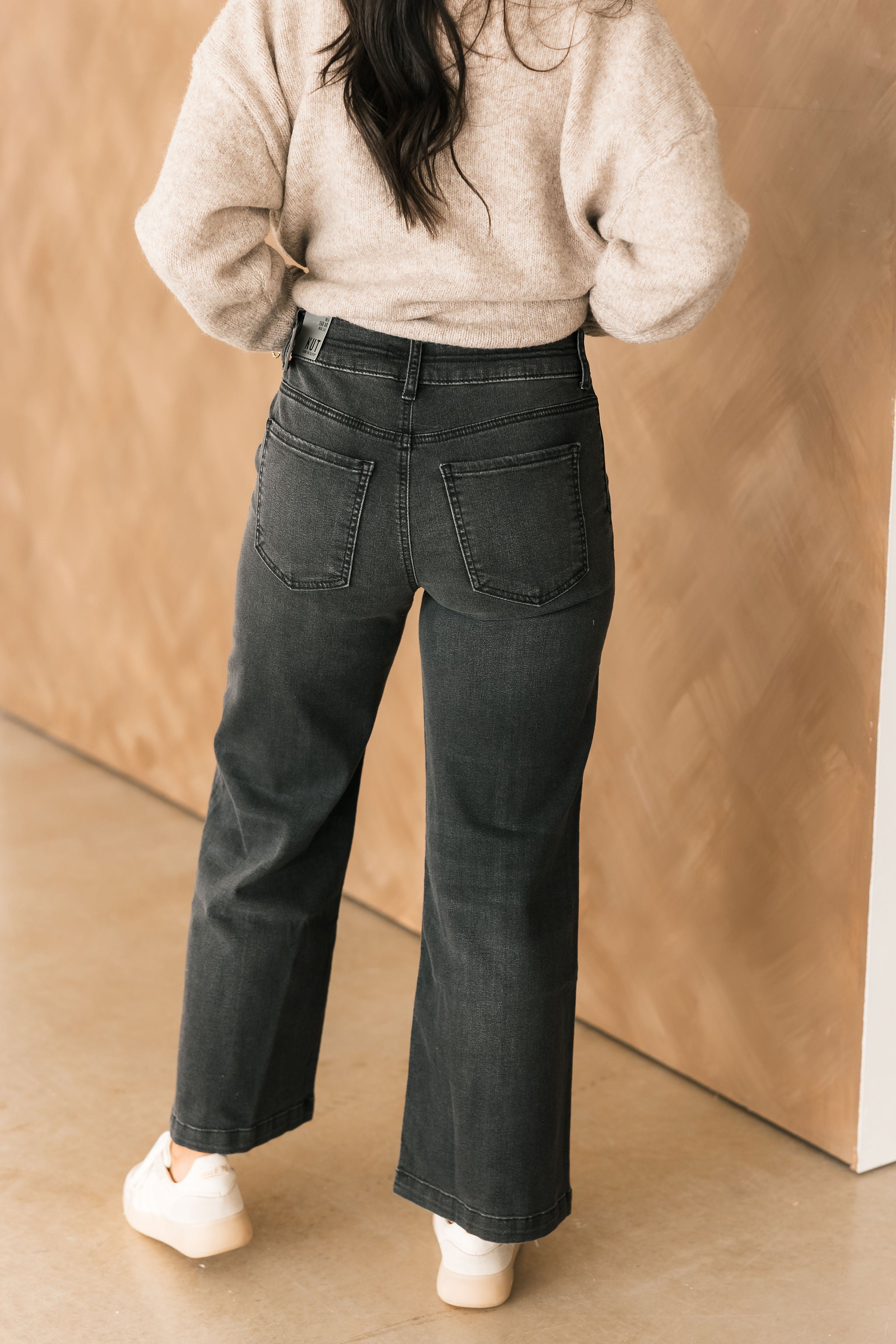 These high rise wide leg jeans combine comfort and clean design with standout details. Featuring slanted pockets, a secure double button closure, and a sleek front center stitch, they offer a flattering fit in a modern grey wash. Made from super stretchy material for all-day wear without losing shape.
