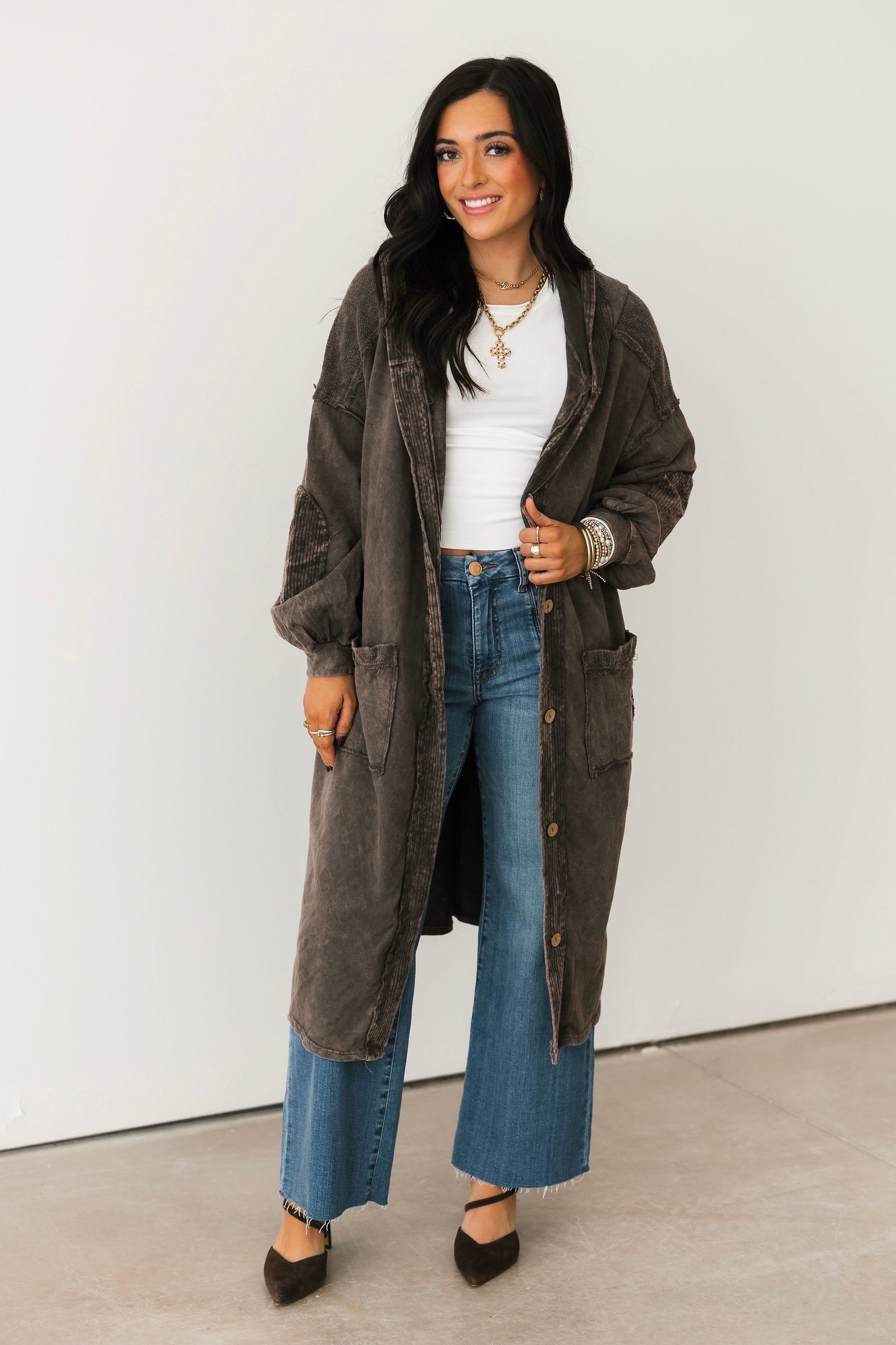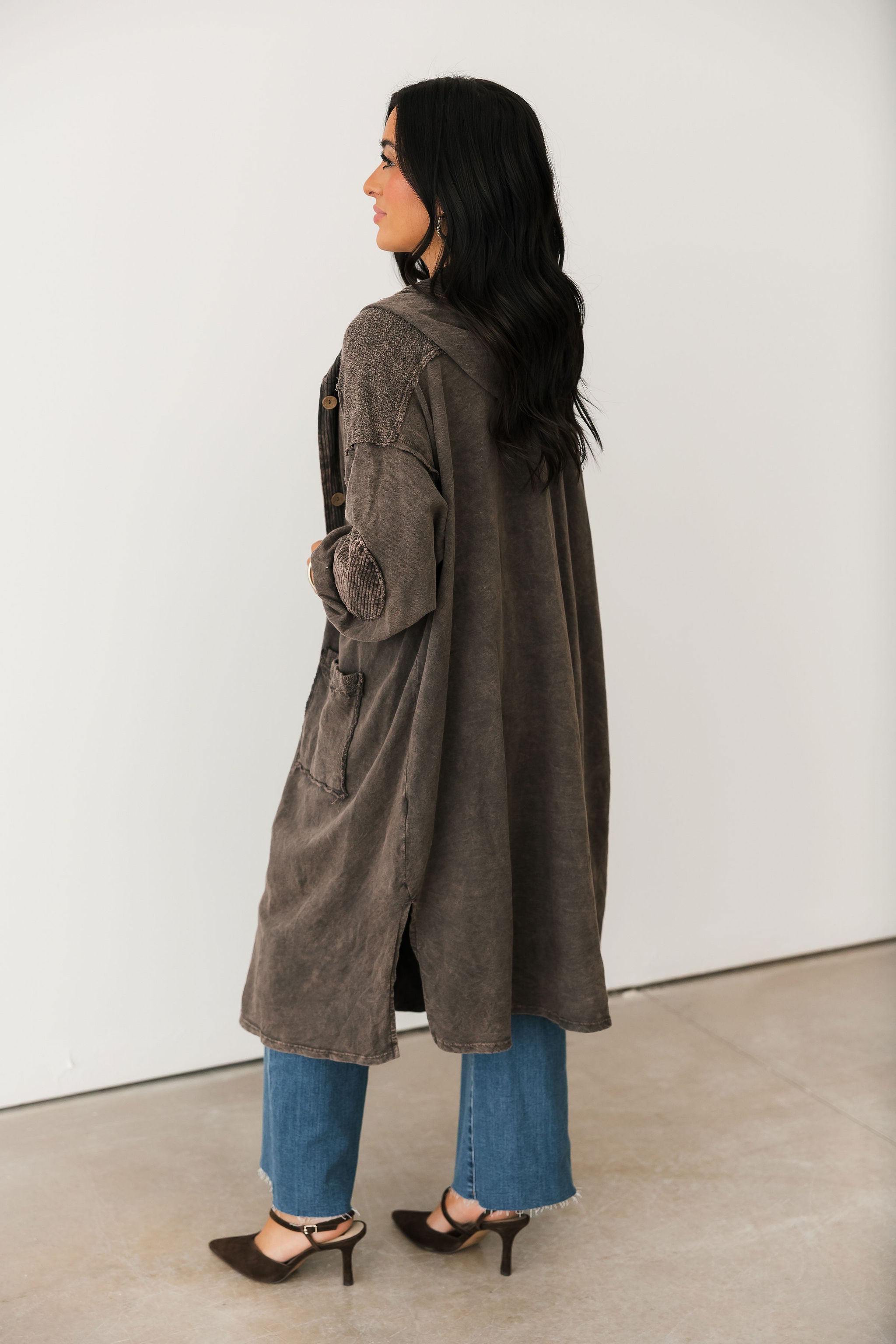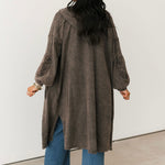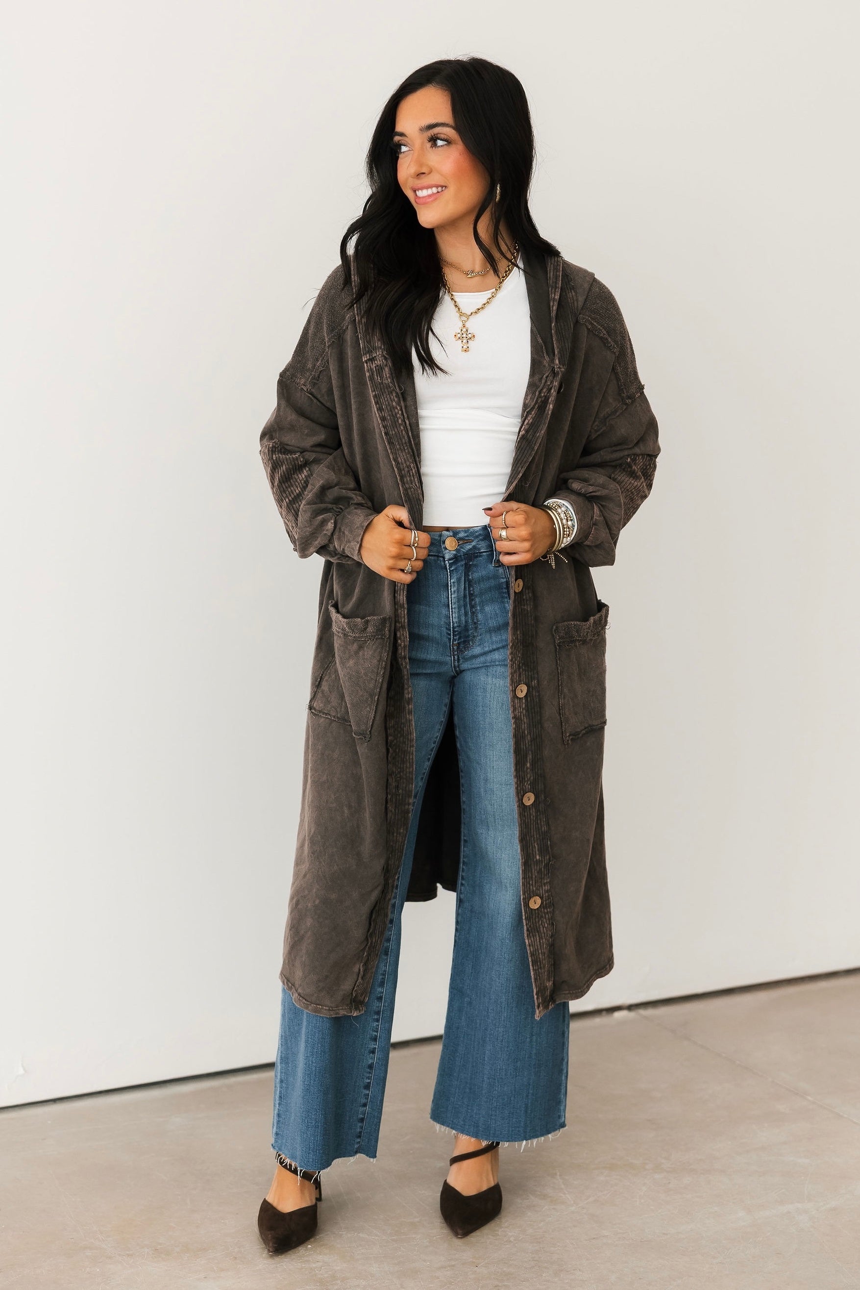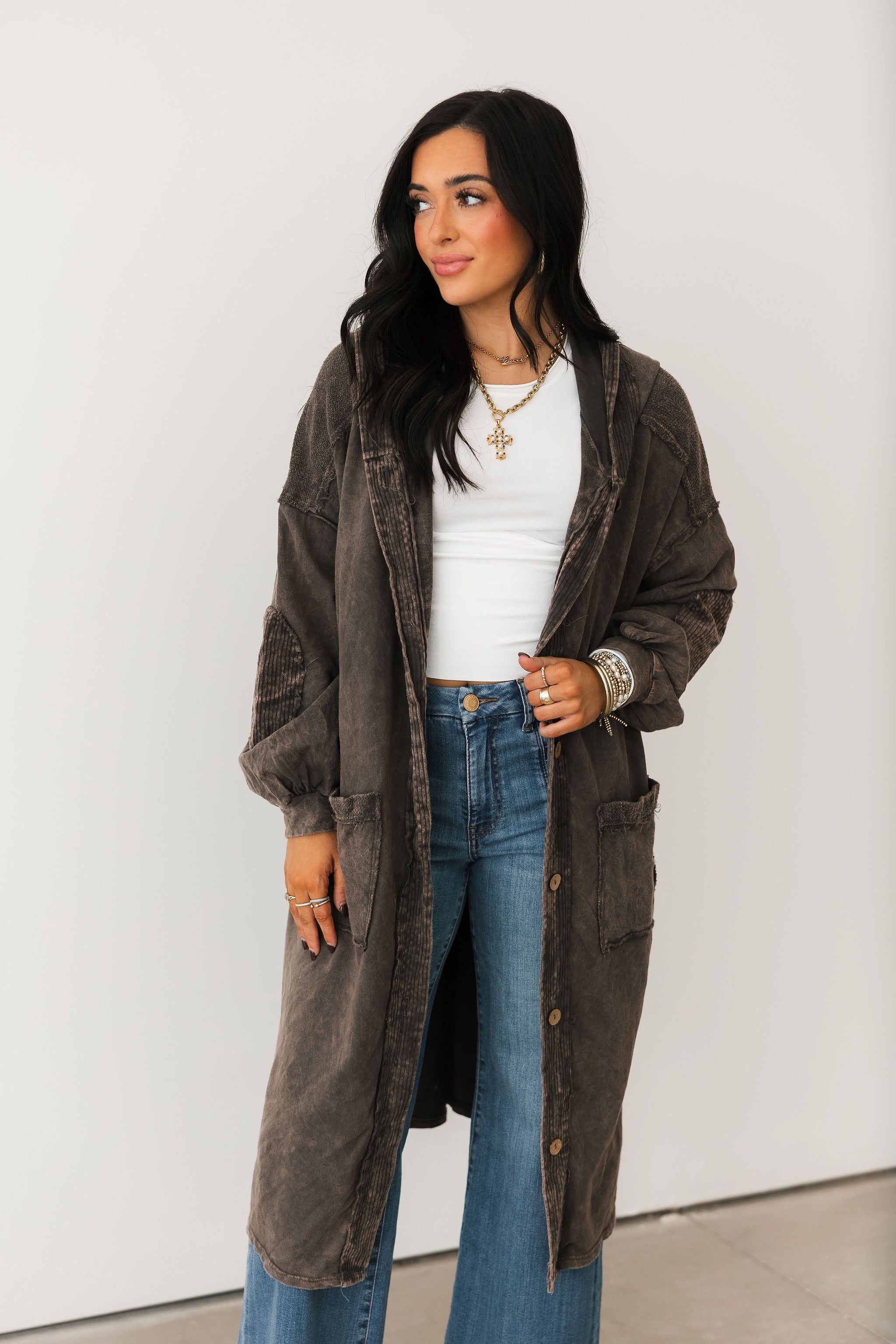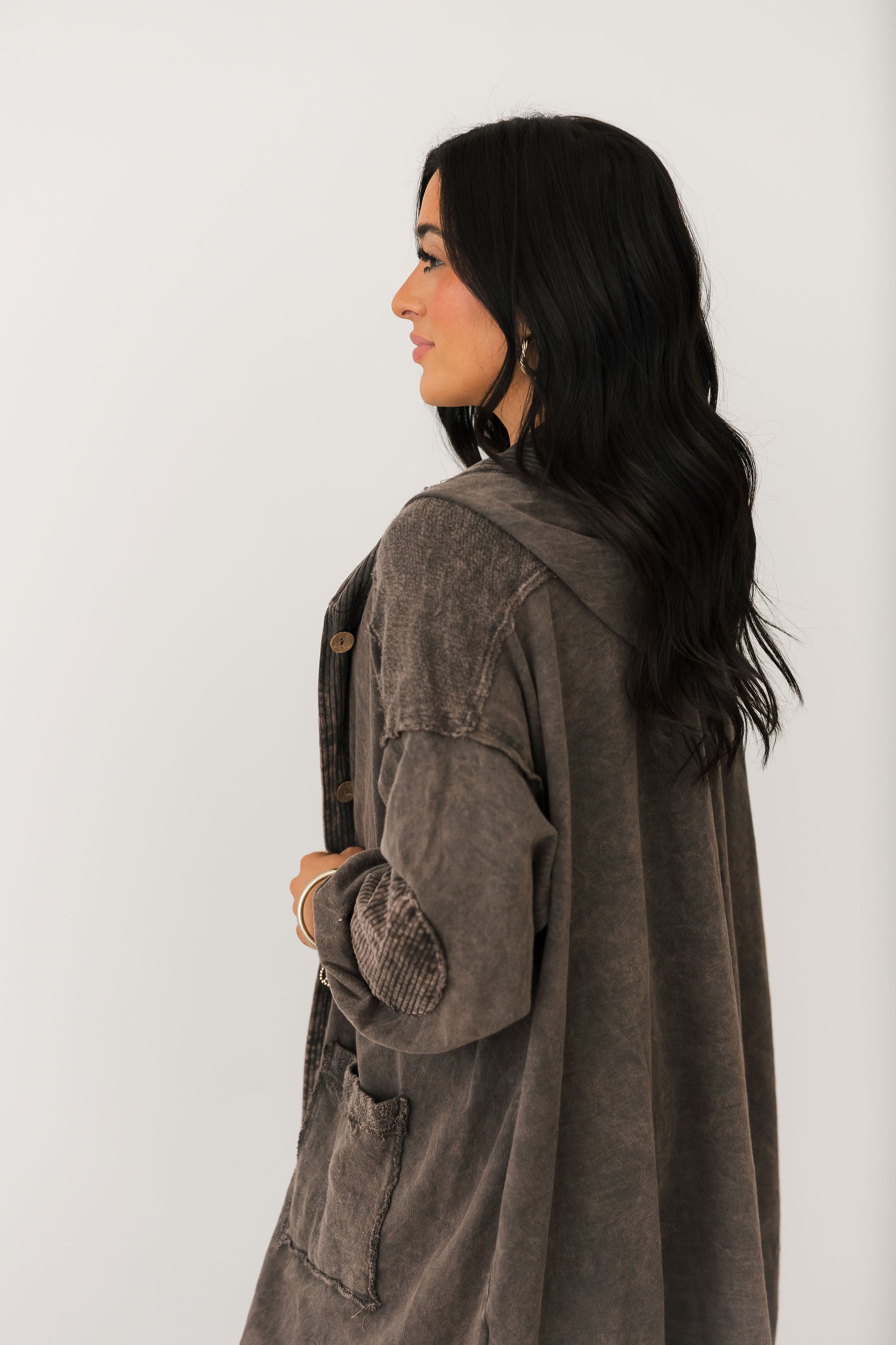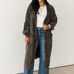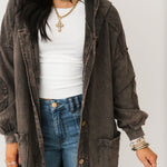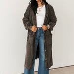 The Mineral Wash Corduroy Maxi Coat In Ashed Black features a relaxed, billowy fit with a full maxi length for an effortlessly oversized feel. Designed with long sleeves, exposed seam detailing, a hooded neckline, and front button closures, this coat blends cozy texture with standout style. The mineral-washed corduroy finish adds a perfectly worn-in look, making it ideal for layering over everything from casual sets to elevated everyday outfits. Sage is wearing a small.
