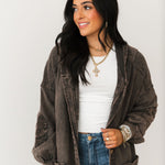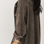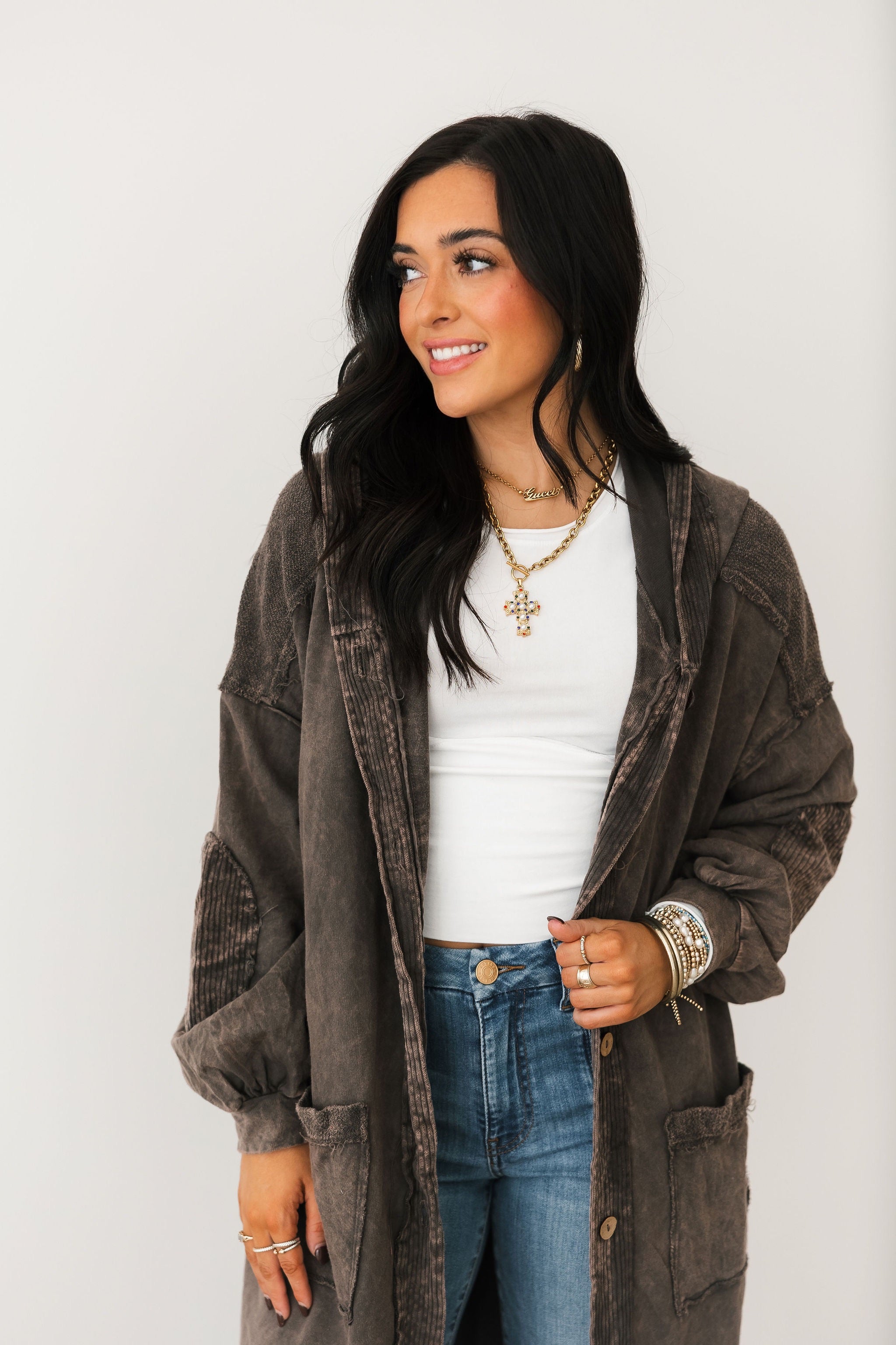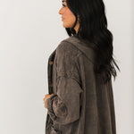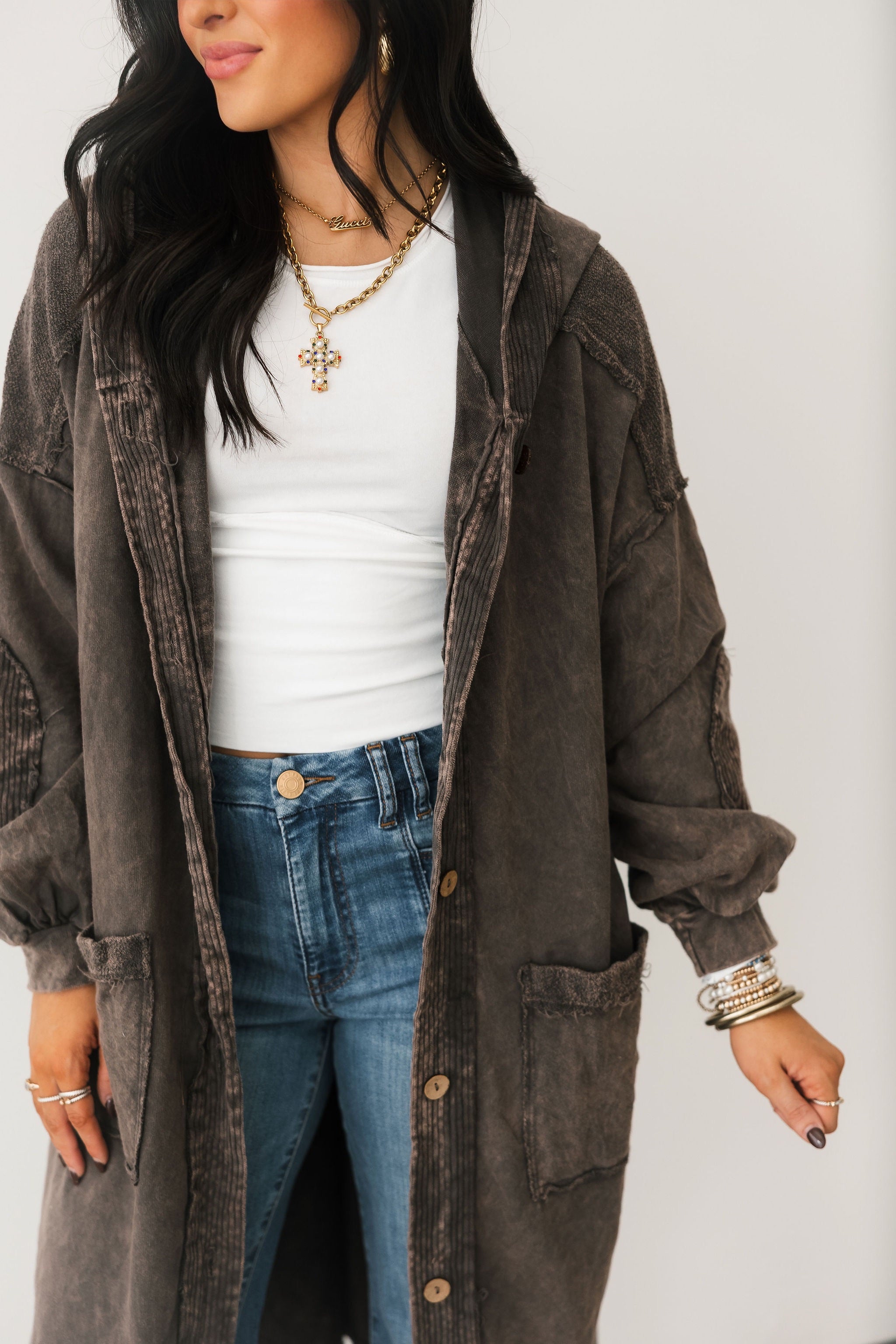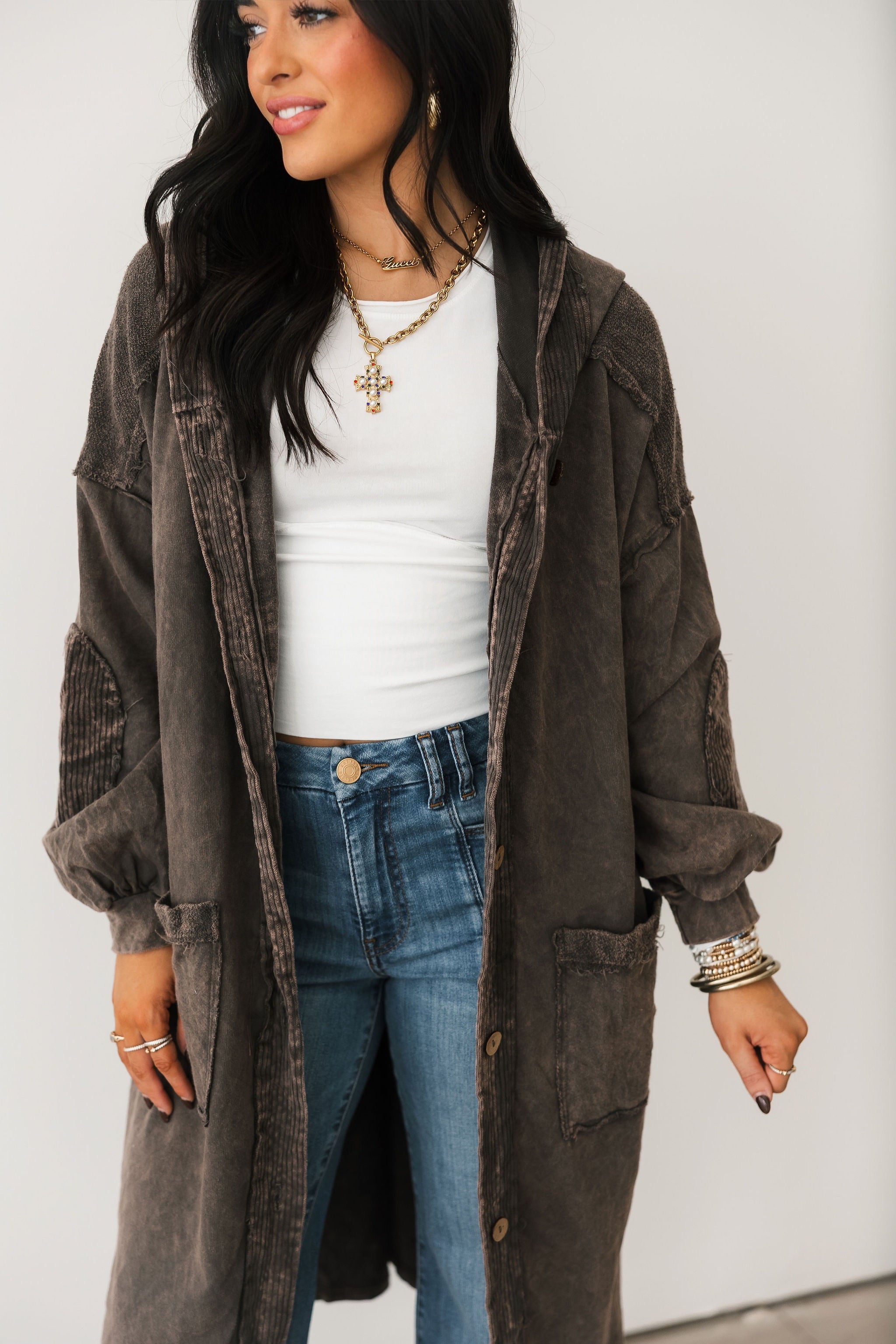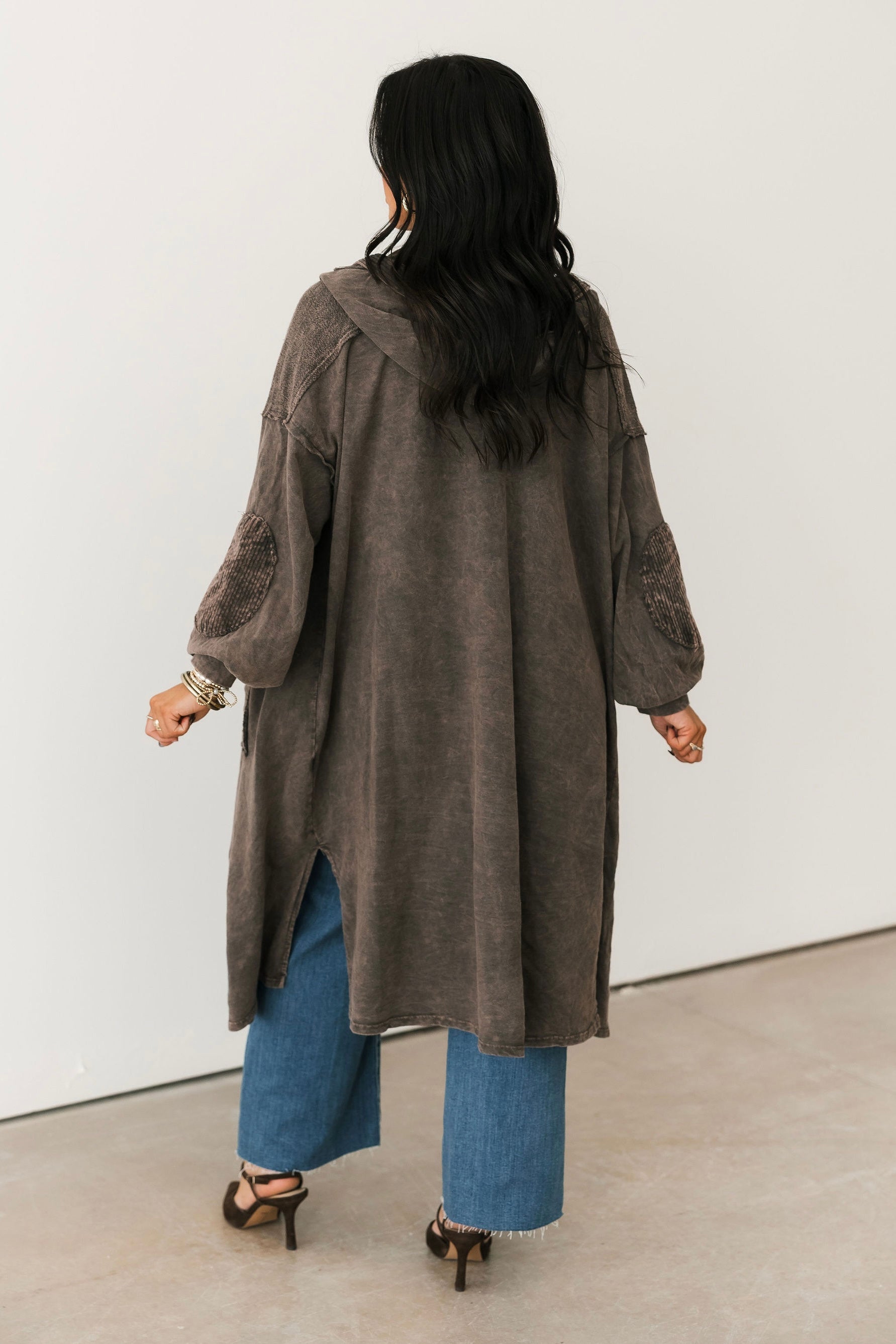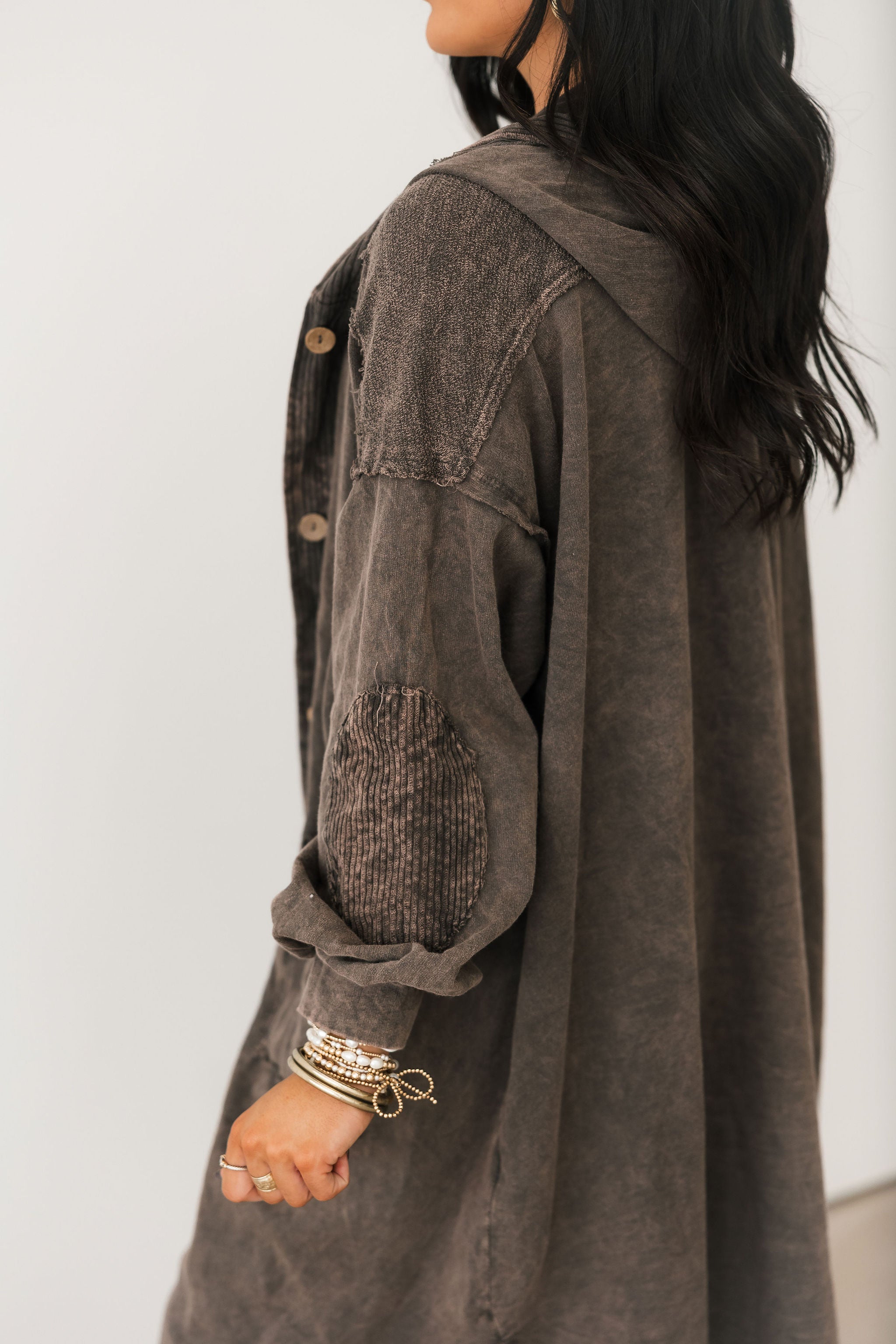 The Mineral Wash Corduroy Maxi Coat In Ashed Black features a relaxed, billowy fit with a full maxi length for an effortlessly oversized feel. Designed with long sleeves, exposed seam detailing, a hooded neckline, and front button closures, this coat blends cozy texture with standout style. The mineral-washed corduroy finish adds a perfectly worn-in look, making it ideal for layering over everything from casual sets to elevated everyday outfits. Sage is wearing a small.
