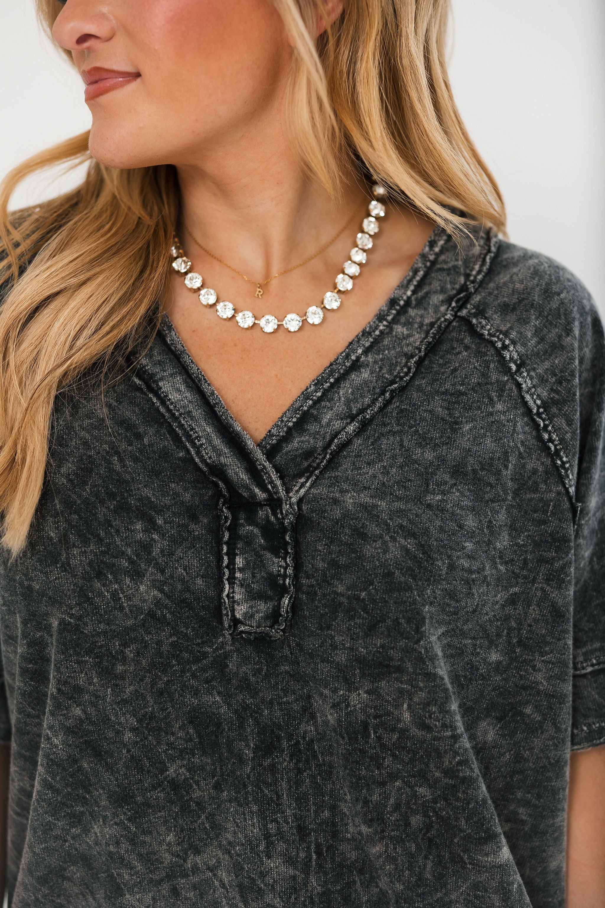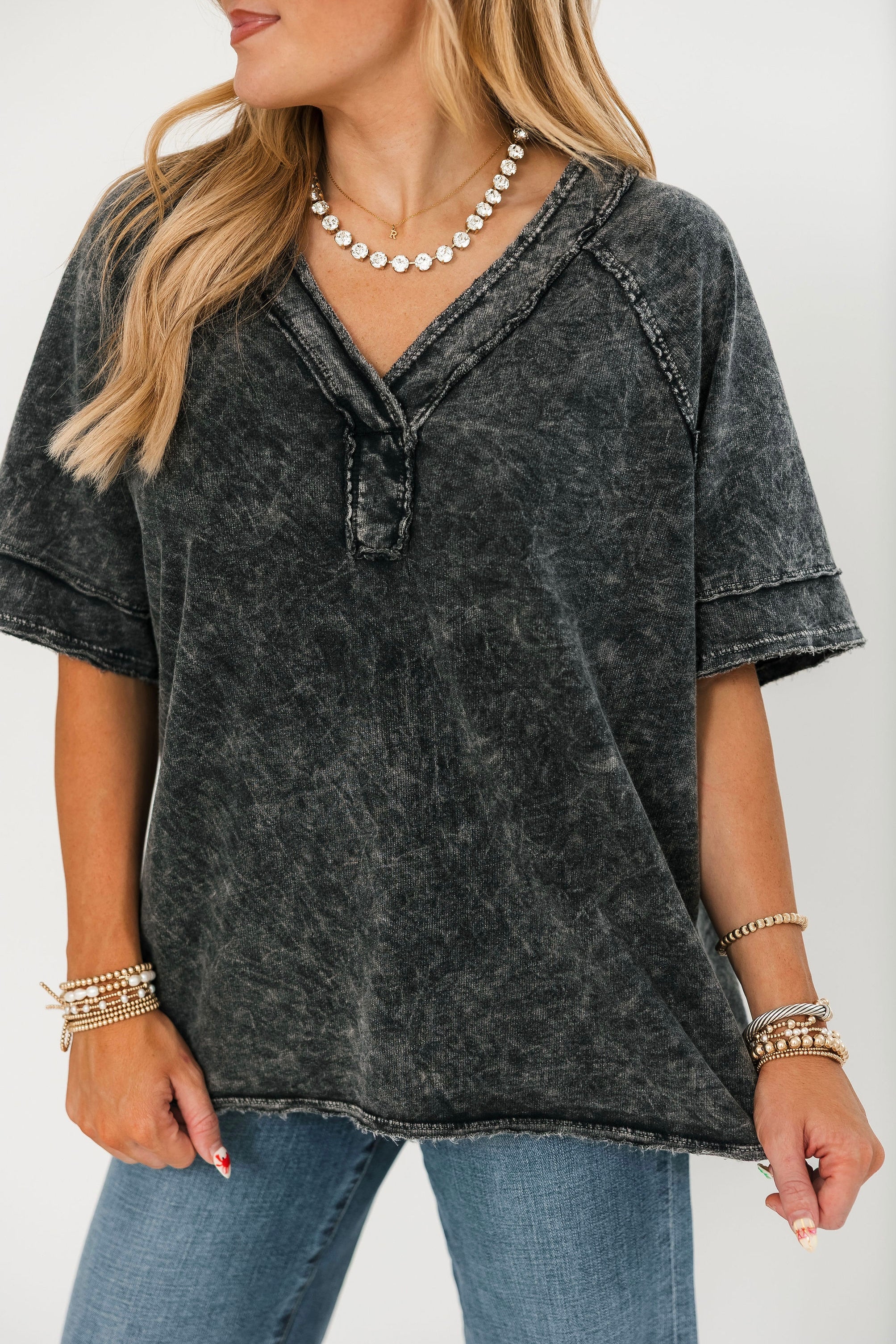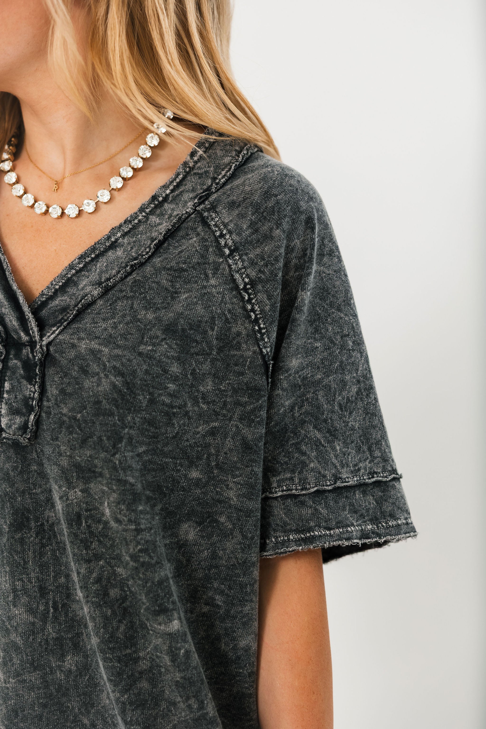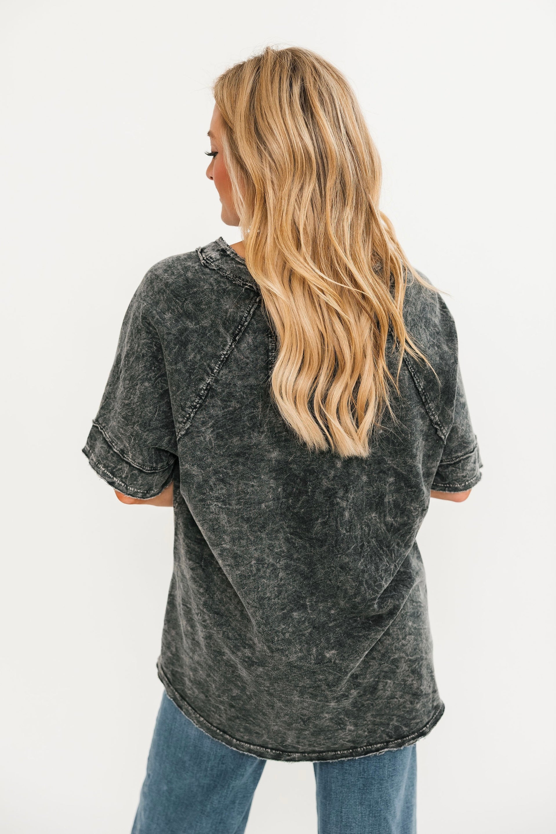 Get cozy and cool in our Mineral Wash Pullover Tee in Black! This soft, lived-in look tee adds a touch of effortless style to your casual days. Perfect for layering or wearing solo, it’s your new go-to for comfort with a playful edge. Lexi is wearing a small.