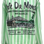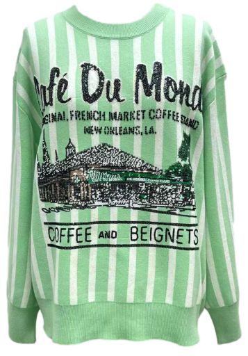 Celebrate sweet southern style with the Queen Of Sparkles Mint & White Striped “Café Du Monde” Sweater. Designed with a relaxed crewneck fit and long sleeves, this soft striped knit features a cheerful nod to the beloved New Orleans café. Perfect for easy layering and festive everyday wear.