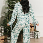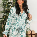 Slip into the comfort of the Mistletoe Dreams Pajamas — a classic button-up set made for lounging in holiday style. Designed with a relaxed fit, this long-sleeve collared top features charming tie sleeve details and pairs perfectly with the matching elastic waistband pants with a drawstring tie for the perfect fit. Whether you’re wrapping gifts, sipping cocoa, or relaxing by the tree, this set brings a touch of festive charm to your cozy nights in. Sage is wearing a small.