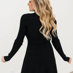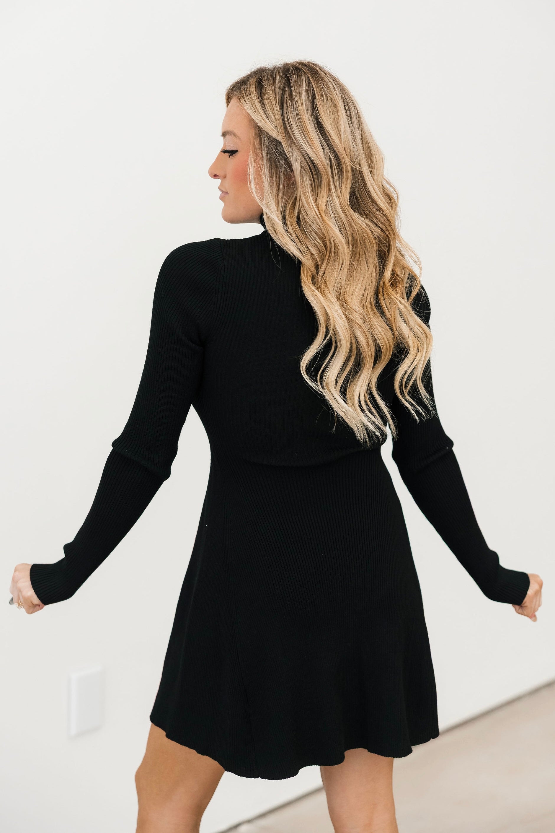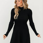This fitted, stretchy mini dress features a sleek mock neckline, long sleeves, and a ribbed knit that offers both comfort and a flattering silhouette. Its classic black color and mini length make it a versatile wardrobe staple—perfect for layering, dressing up, or keeping things effortlessly polished. Lexi is wearing a small.