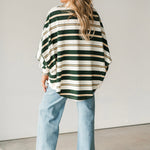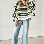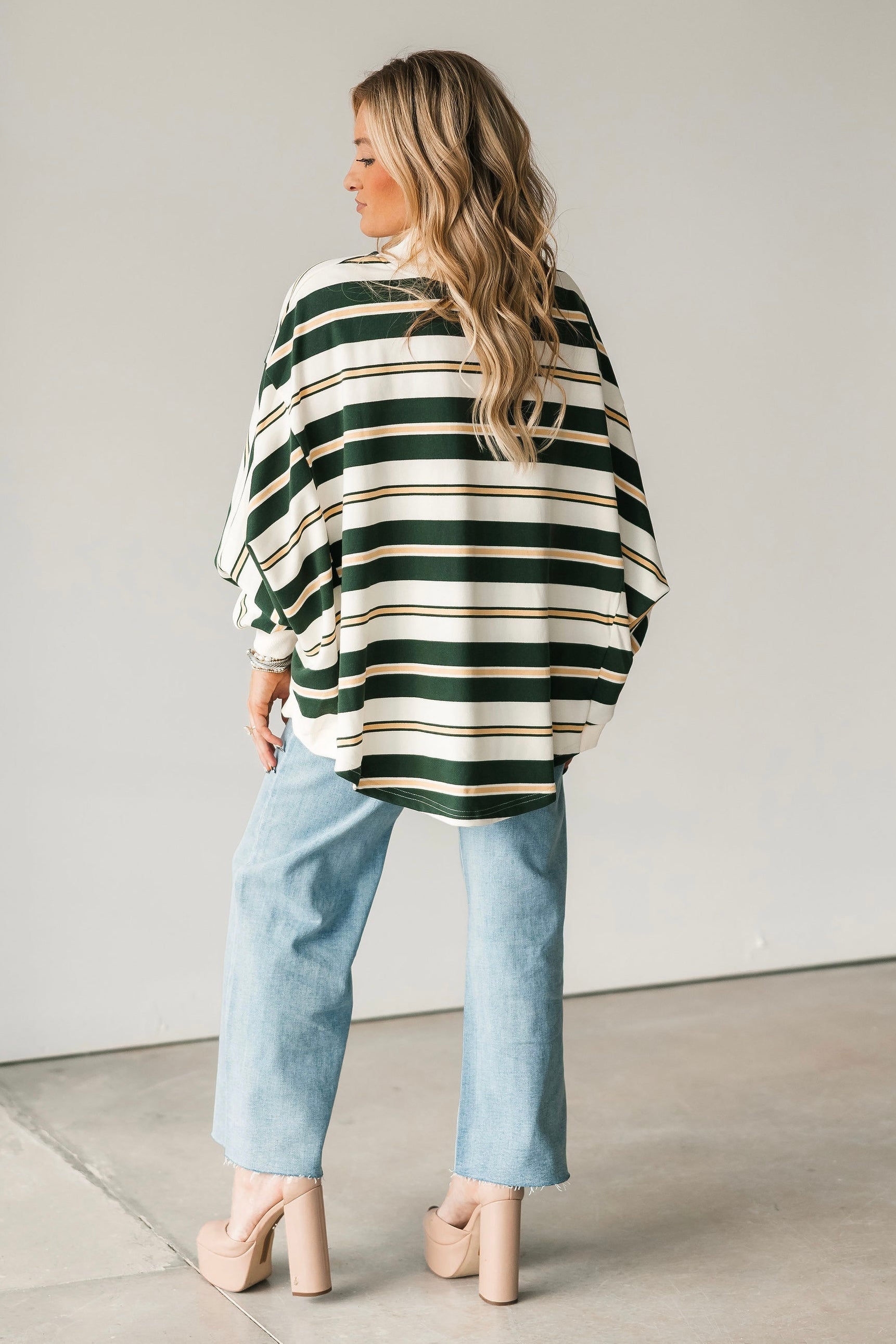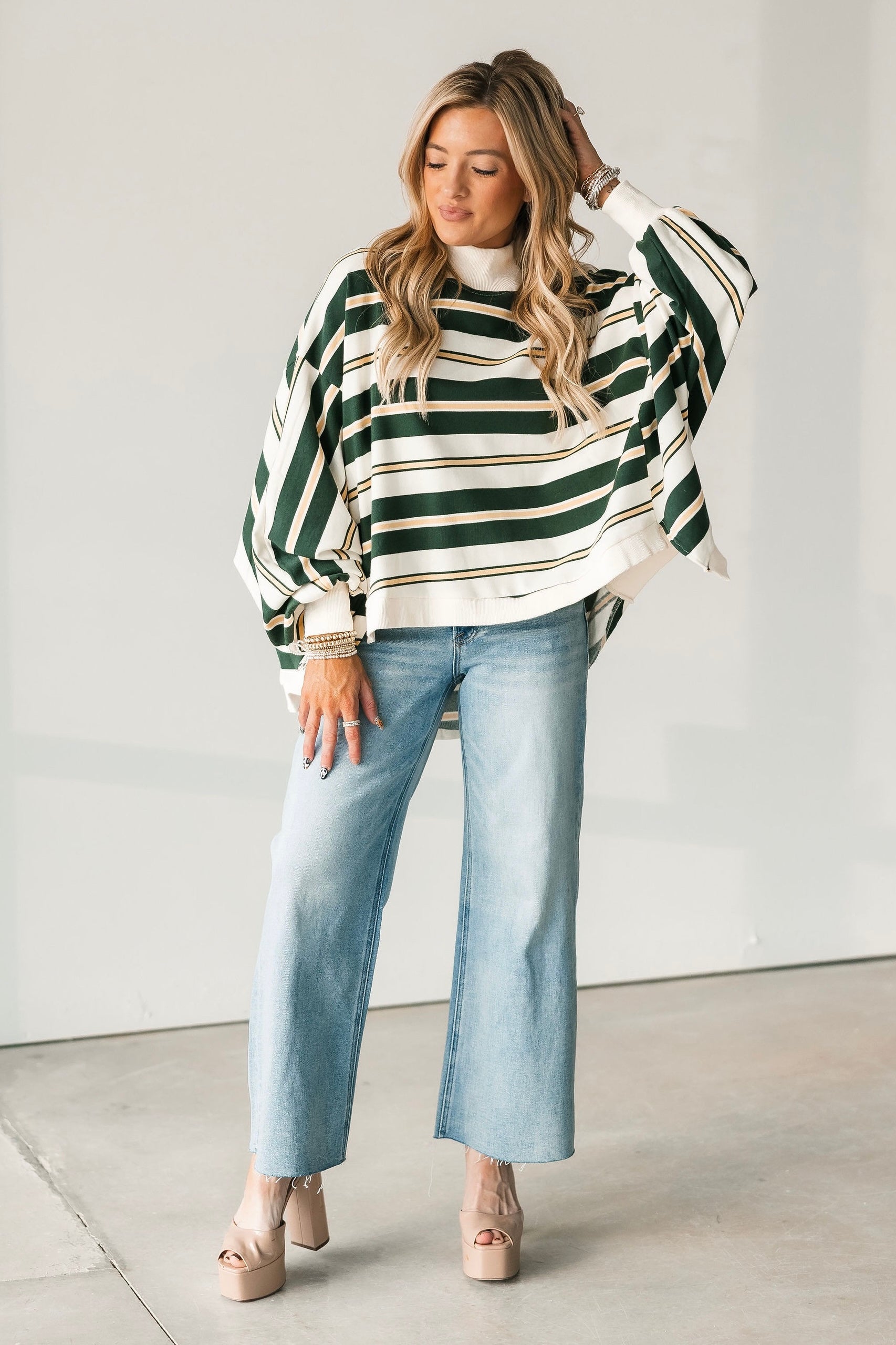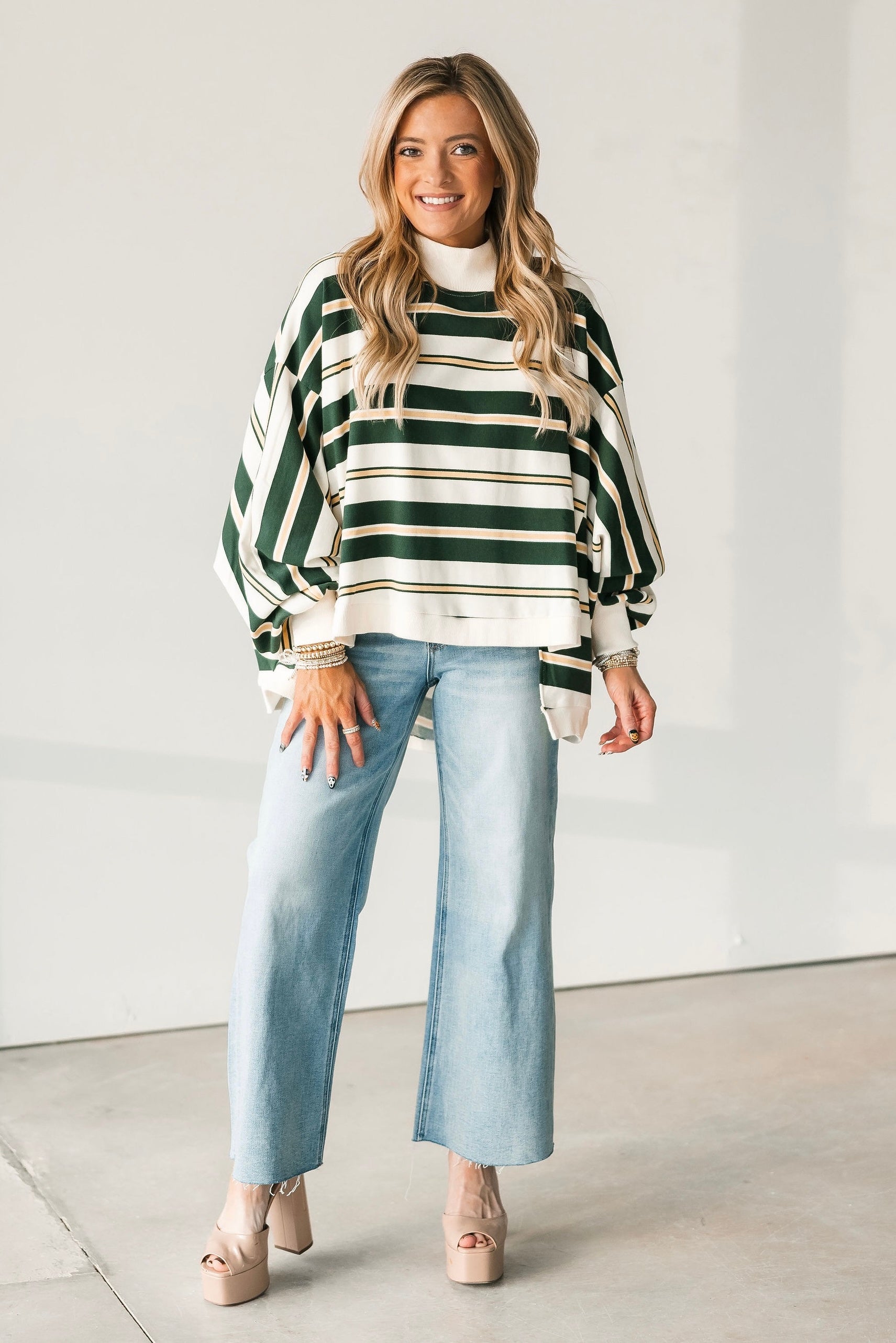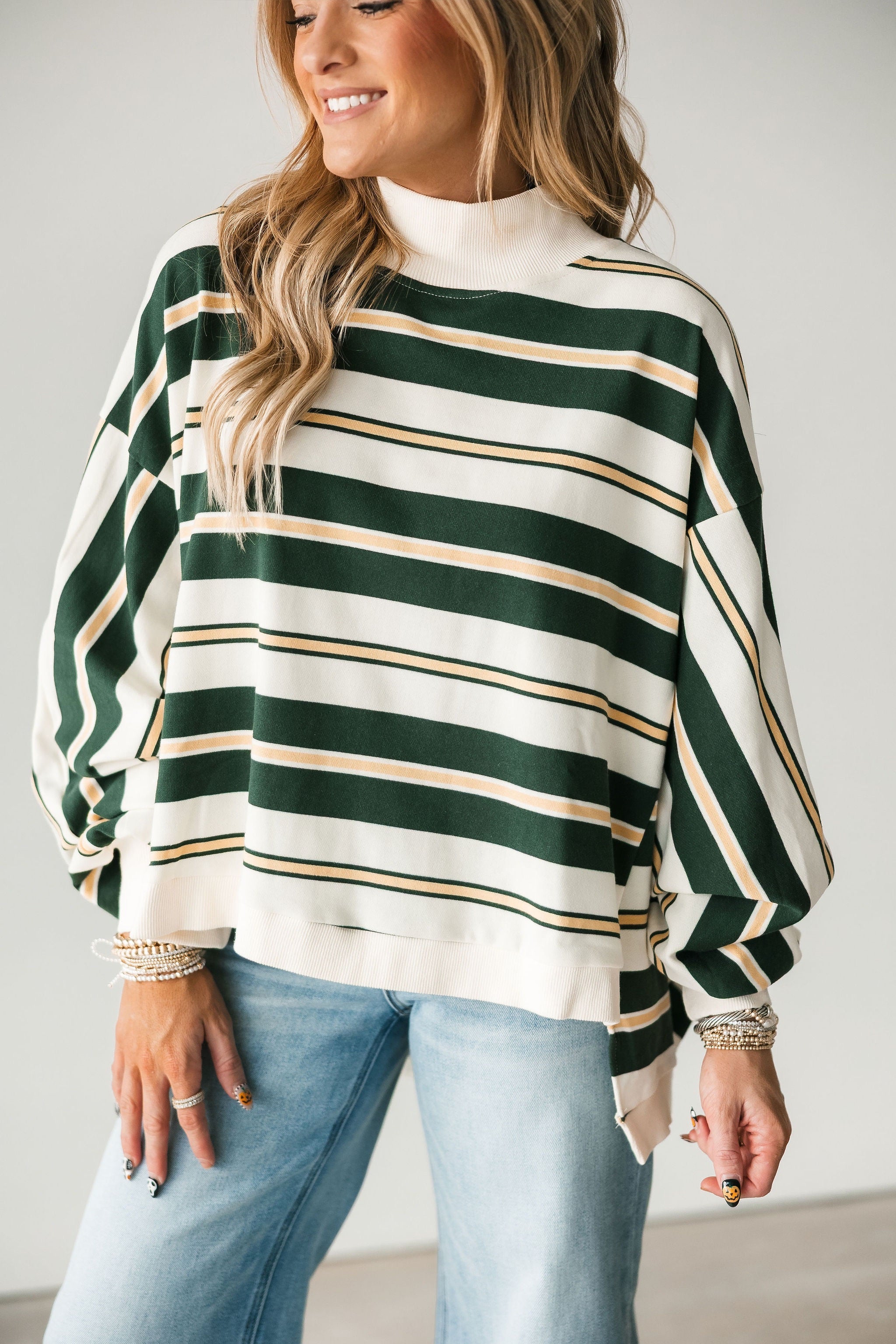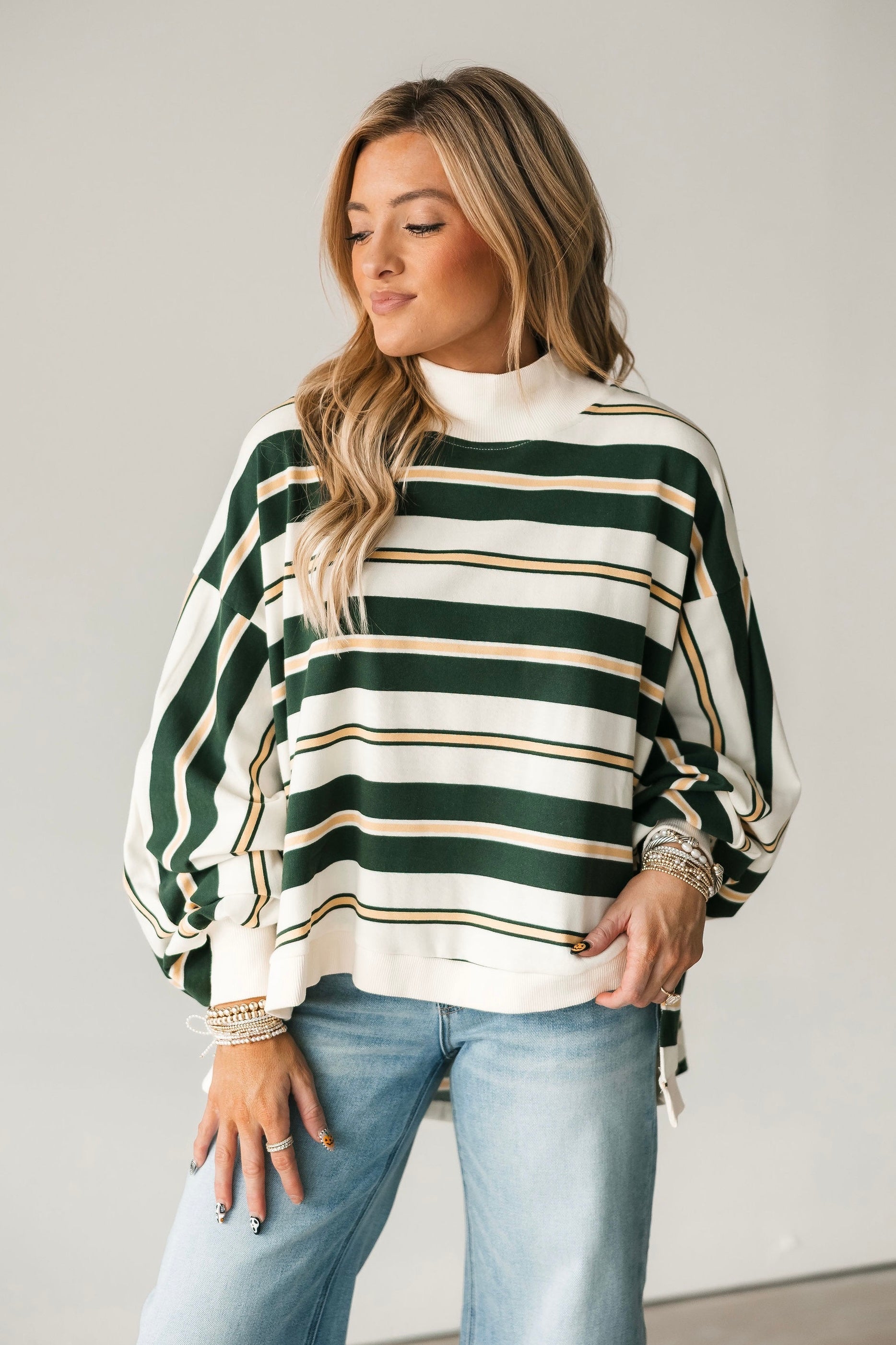 This relaxed-fit top features a classic mock neck, long sleeves, and bold stripes for a retro-inspired look. Soft and versatile, it’s a must-have layering piece for effortless everyday style. Lexi is wearing a small.